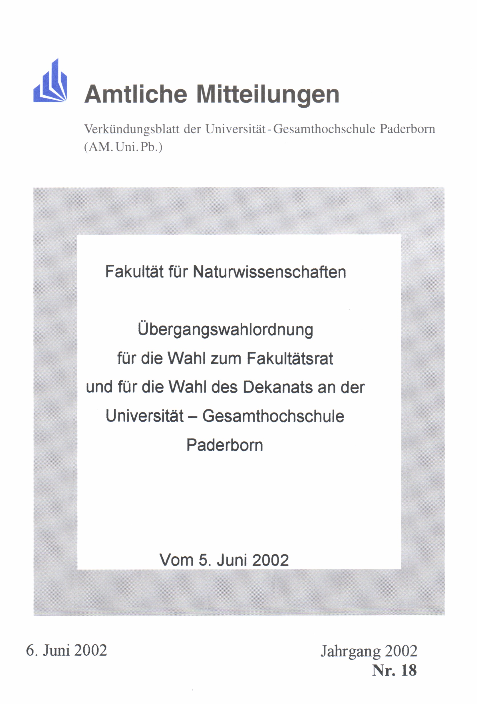 Übergangswahlordnung für die Wahl zum Fakultätsrat und für die Wahl des Dekanats an der Universität-Gesamthochschule Paderborn : vom 5. Juni 2002 / Fakultät für Naturwissenschaften