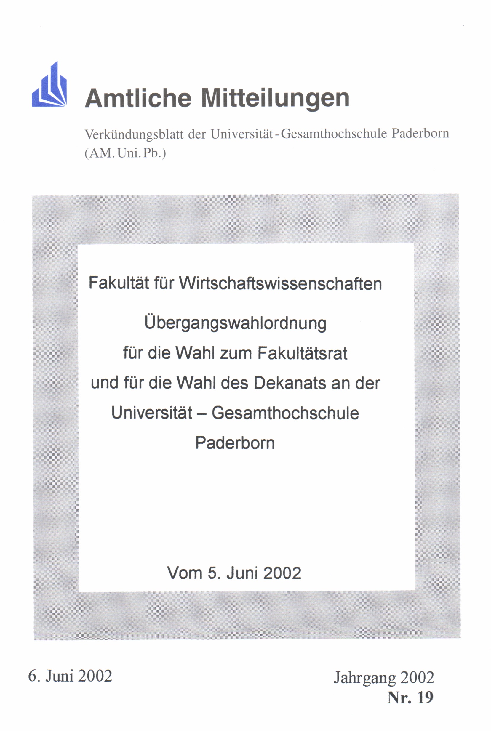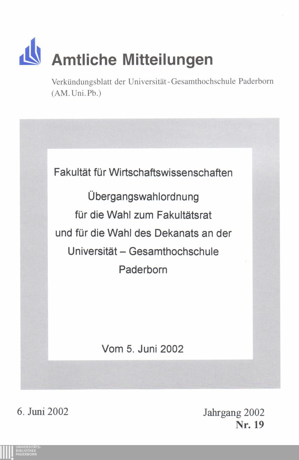 Übergangswahlordnung für die Wahl zum Fakultätsrat und für die Wahl des Dekanats an der Universität-Gesamthochschule Paderborn : vom 5. Juni 2002 / Fakultät für Naturwissenschaften