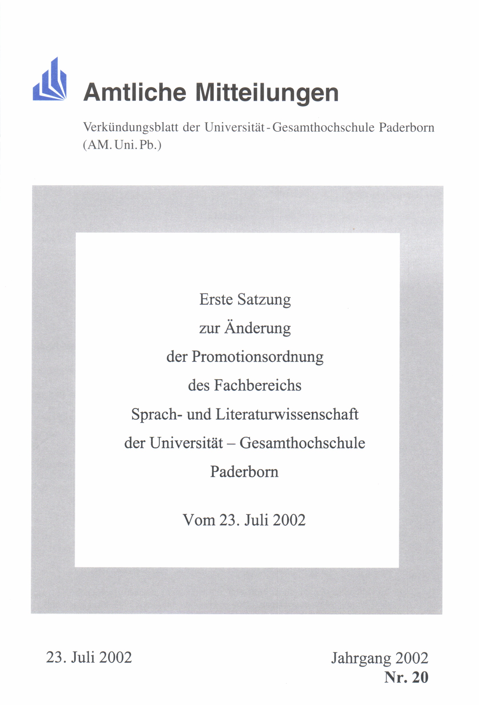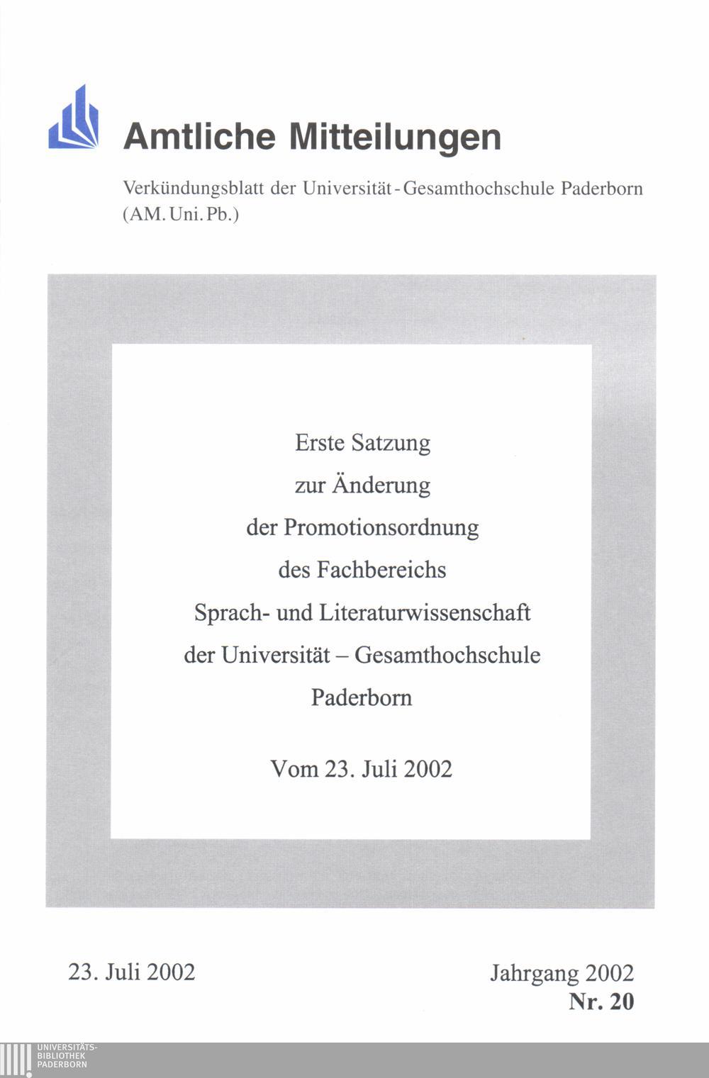 Erste Satzung zur Änderung der Promotionsordnung des Fachbereichs Sprach- und Literaturwissenschaft der Universität - Gesamthochschule Paderborn : vom 23. Juli 2002