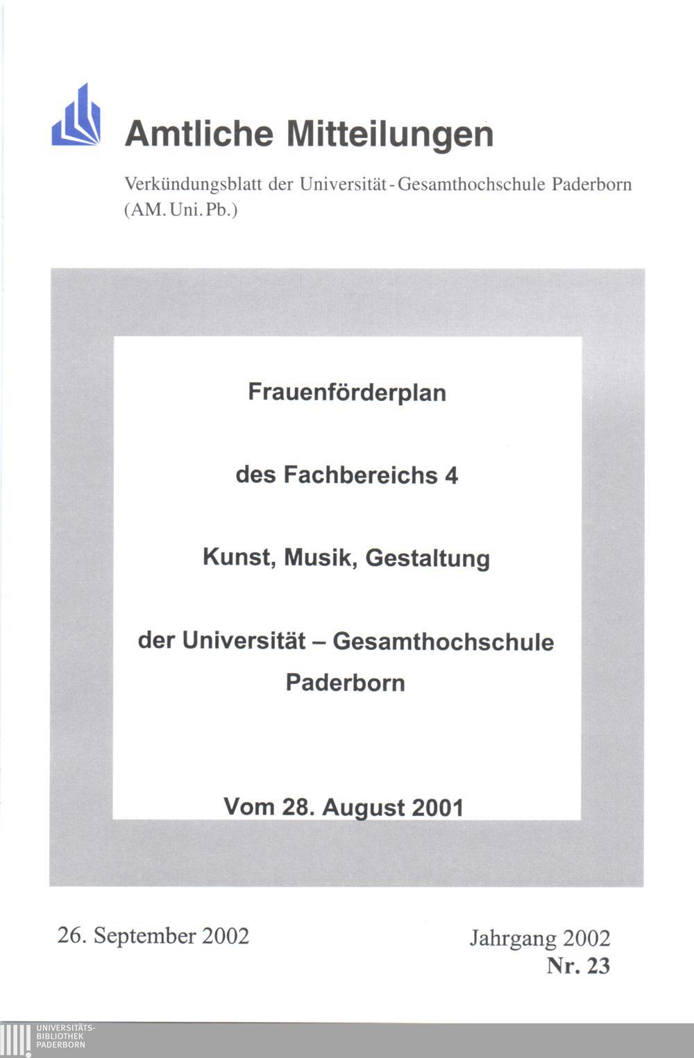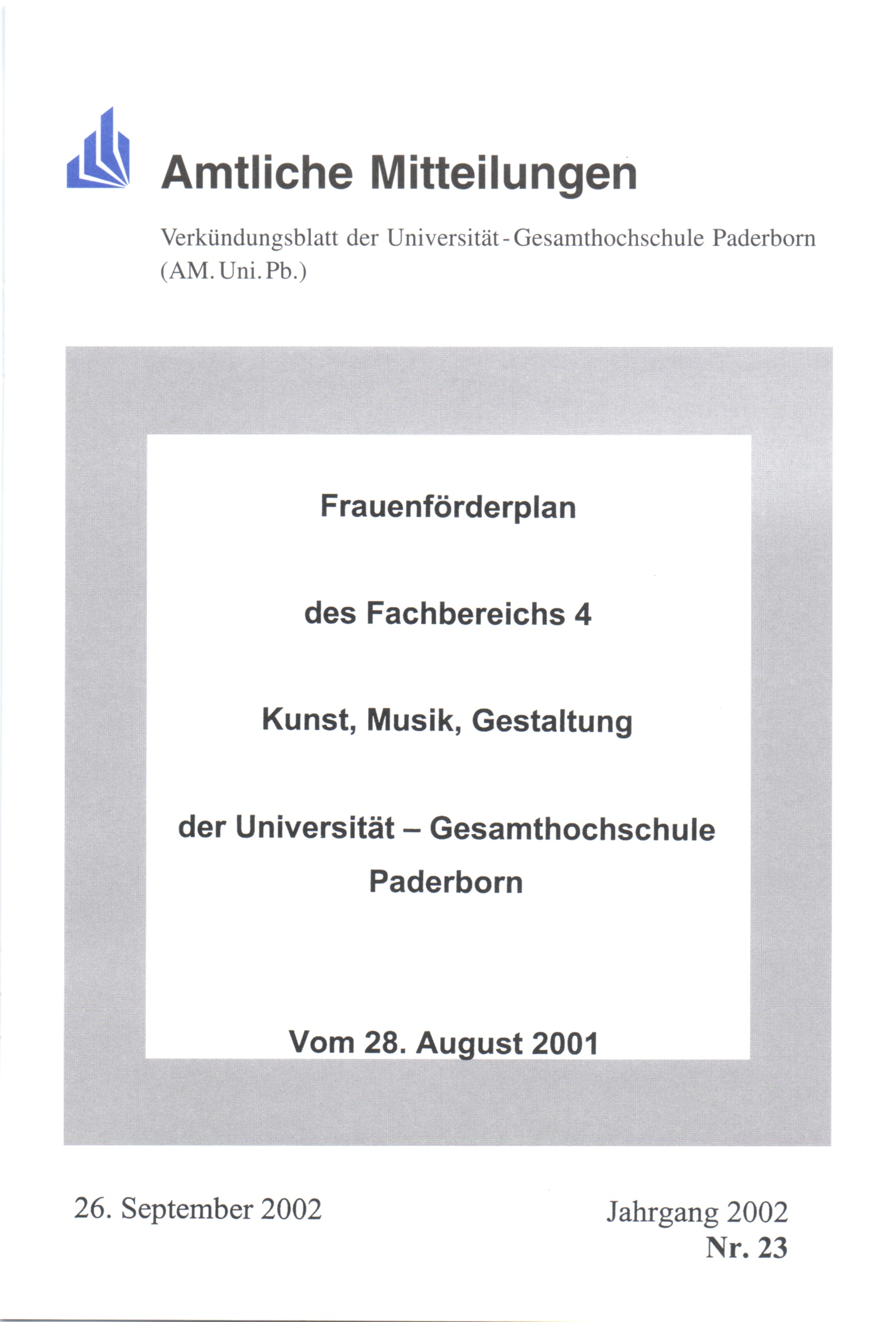 Frauenförderplan des Fachbereichs 4, Kunst, Musik, Gestaltung, der Universität-Gesamthochschule Paderborn : vom 28. August 2001