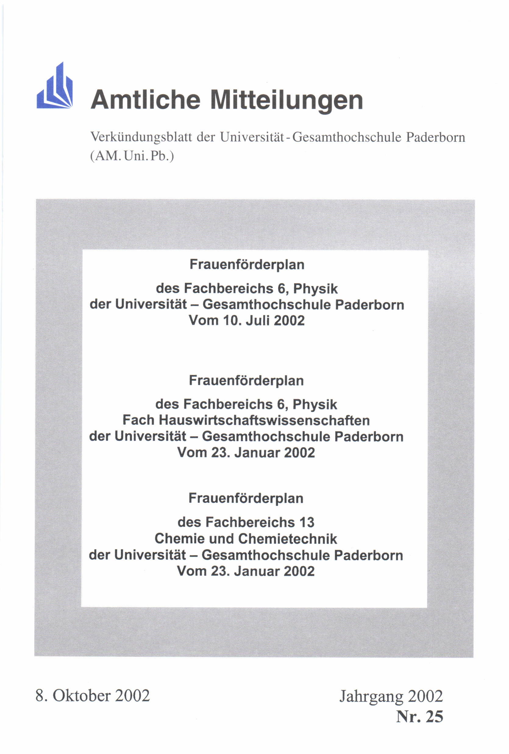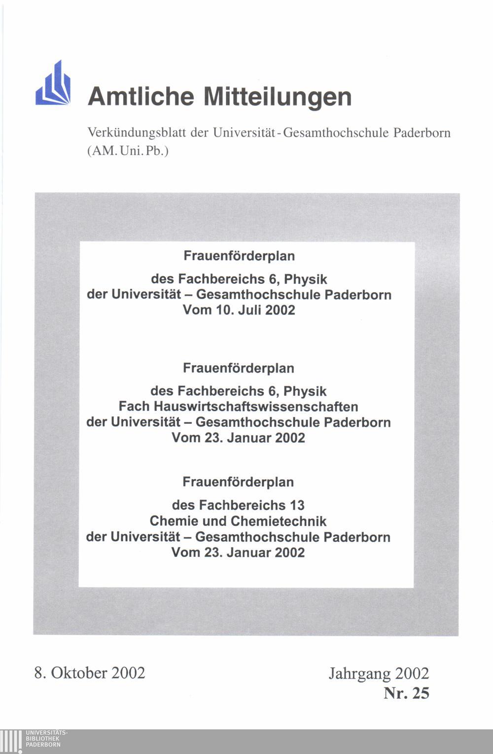 Frauenförderplan des Fachbereichs 6, Physik, der Universität-Gesamthochschule Paderborn : vom 10. Juli 2002