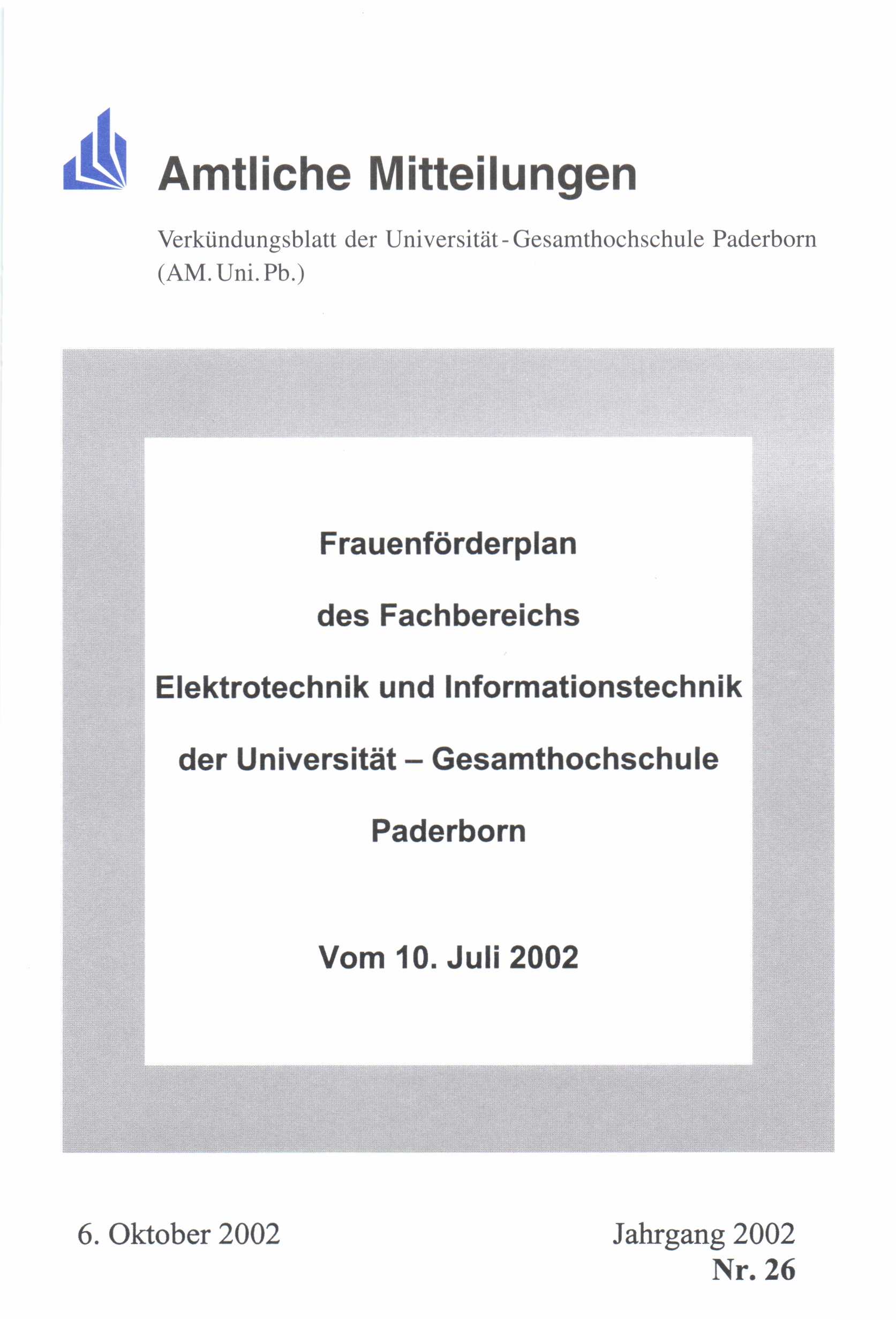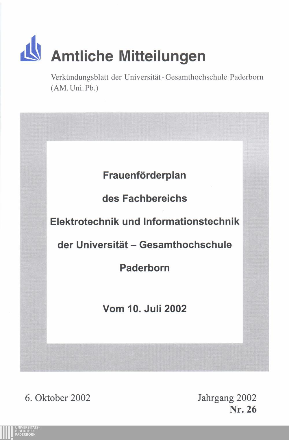 Frauenförderplan des Fachbereichs Elektrotechnik und Informationstechnik der Universität - Gesamthochschule Paderborn : vom 10. Juli 2002