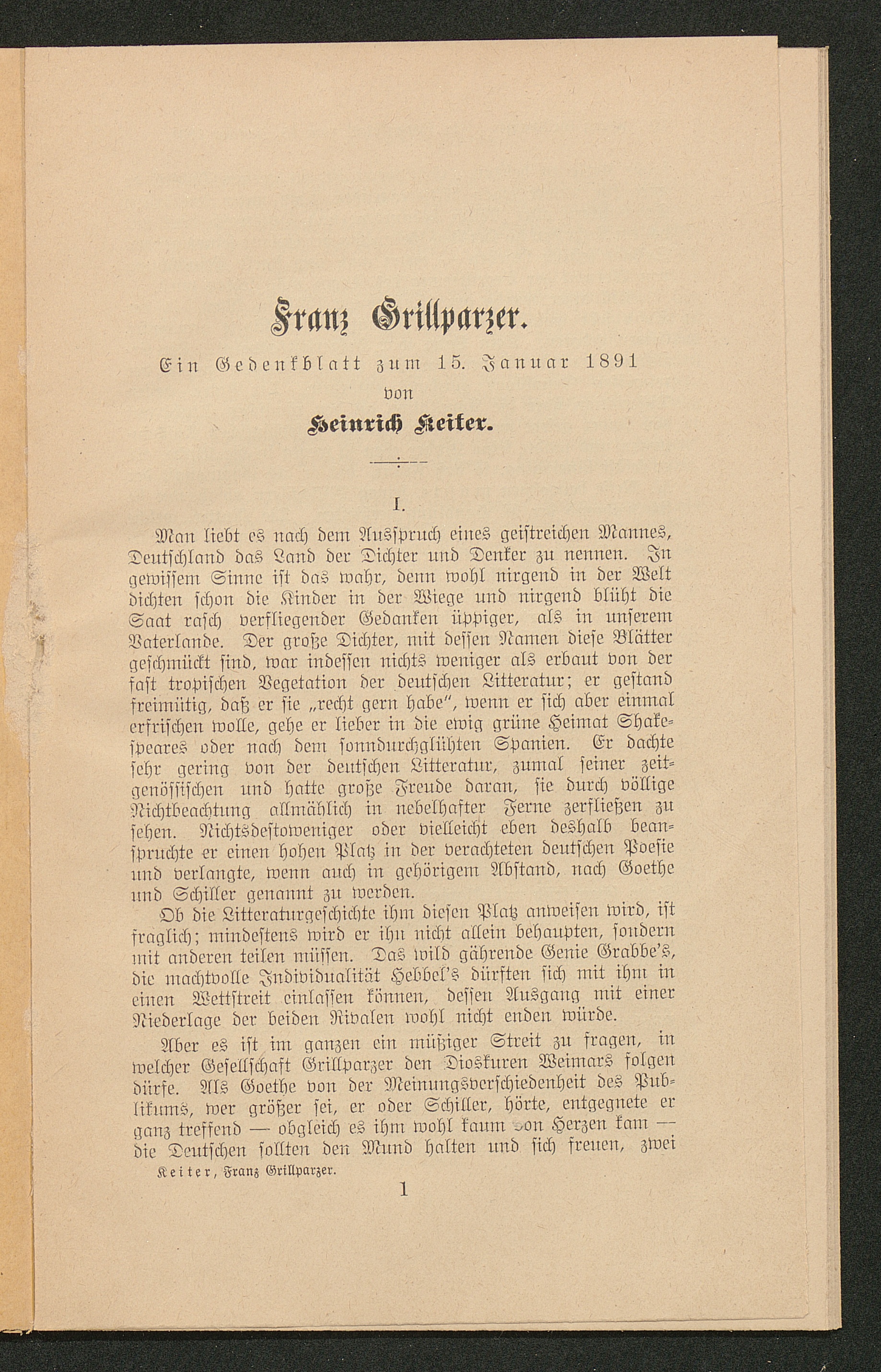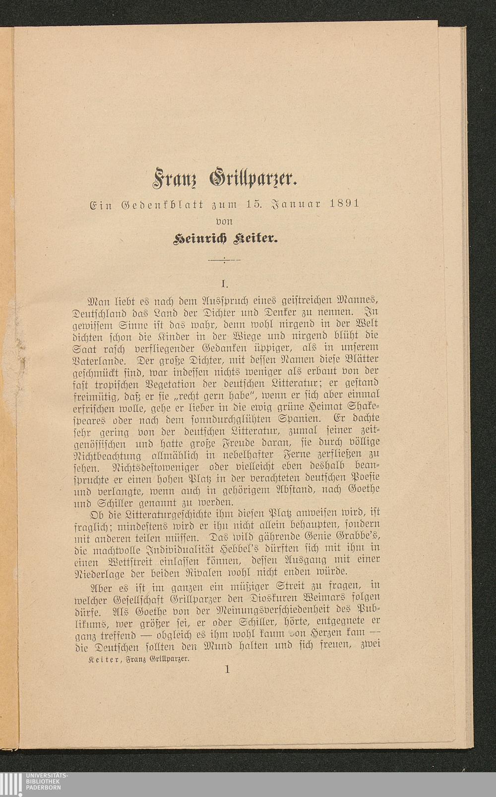 Franz Grillparzer : ein Gedenkblatt zum 15. Januar 1891 / Heinrich Keiter