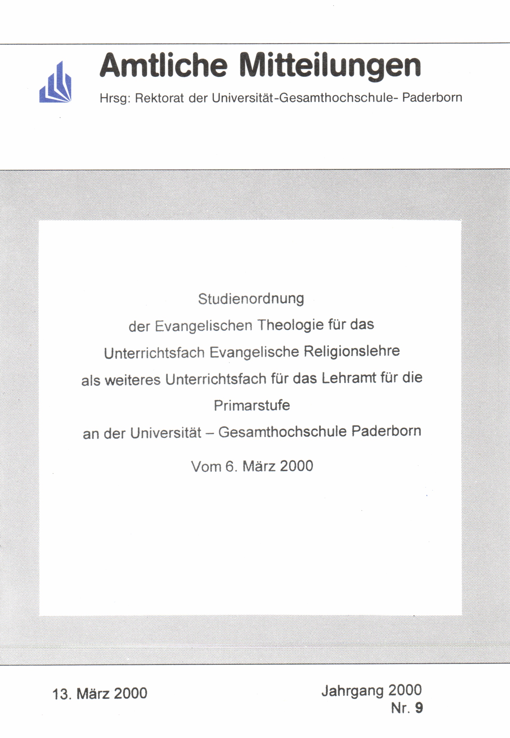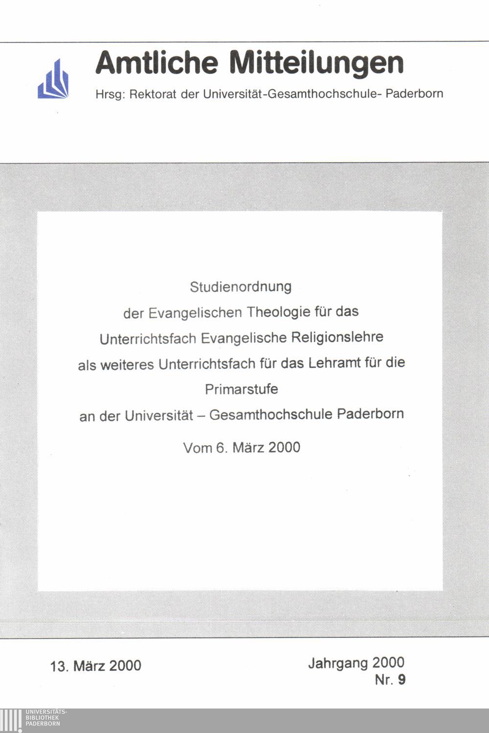 Studienordnung der Evangelischen Theologie für das Unterrichtsfach Evangelische Religionslehre als weiteres Unterrichtsfach für das Lehramt für die Primarstufe an der Universität - Gesamthochschule Paderborn : Vom 6. März 2000