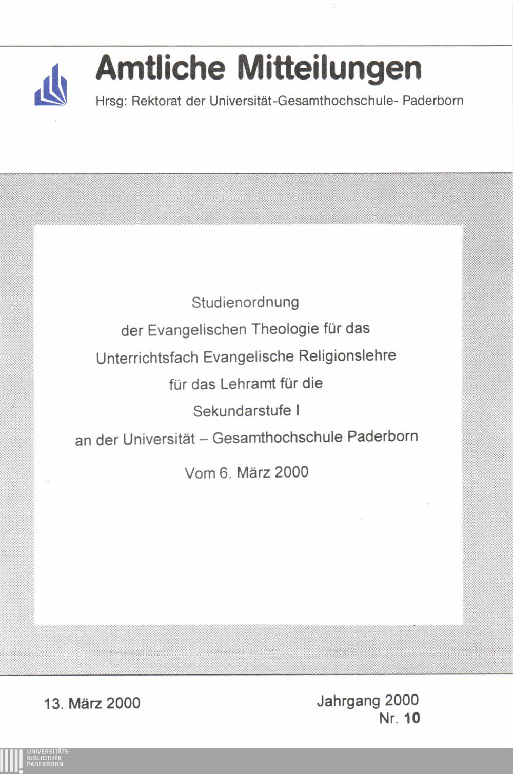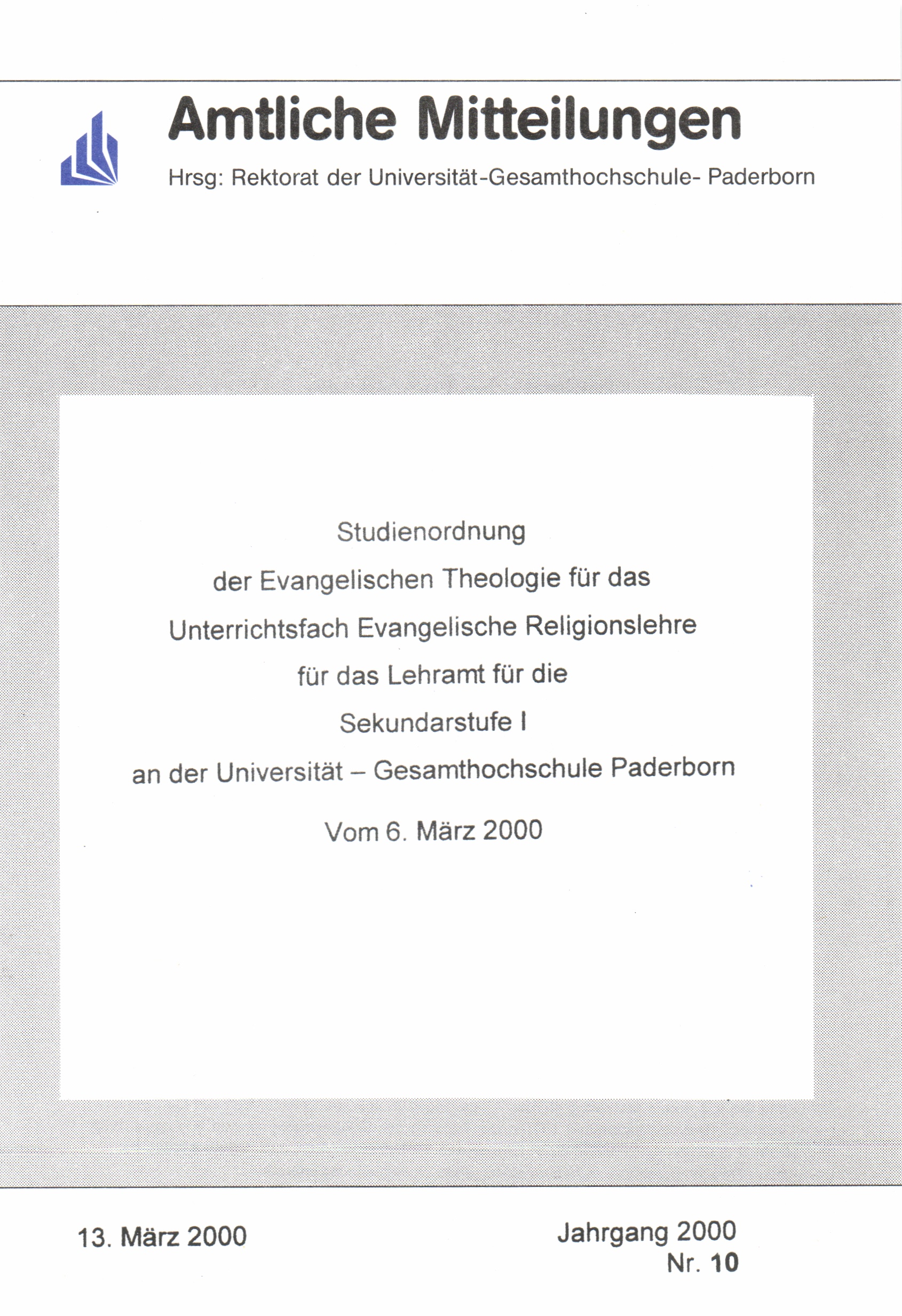 Studienordnung der Evangelischen Theologie für das Unterrichtsfach Evangelische Religionslehre für das Lehramt für die Sekundarstufe I an der Universität - Gesamthochschule Paderborn : Vom 6. März 2000
