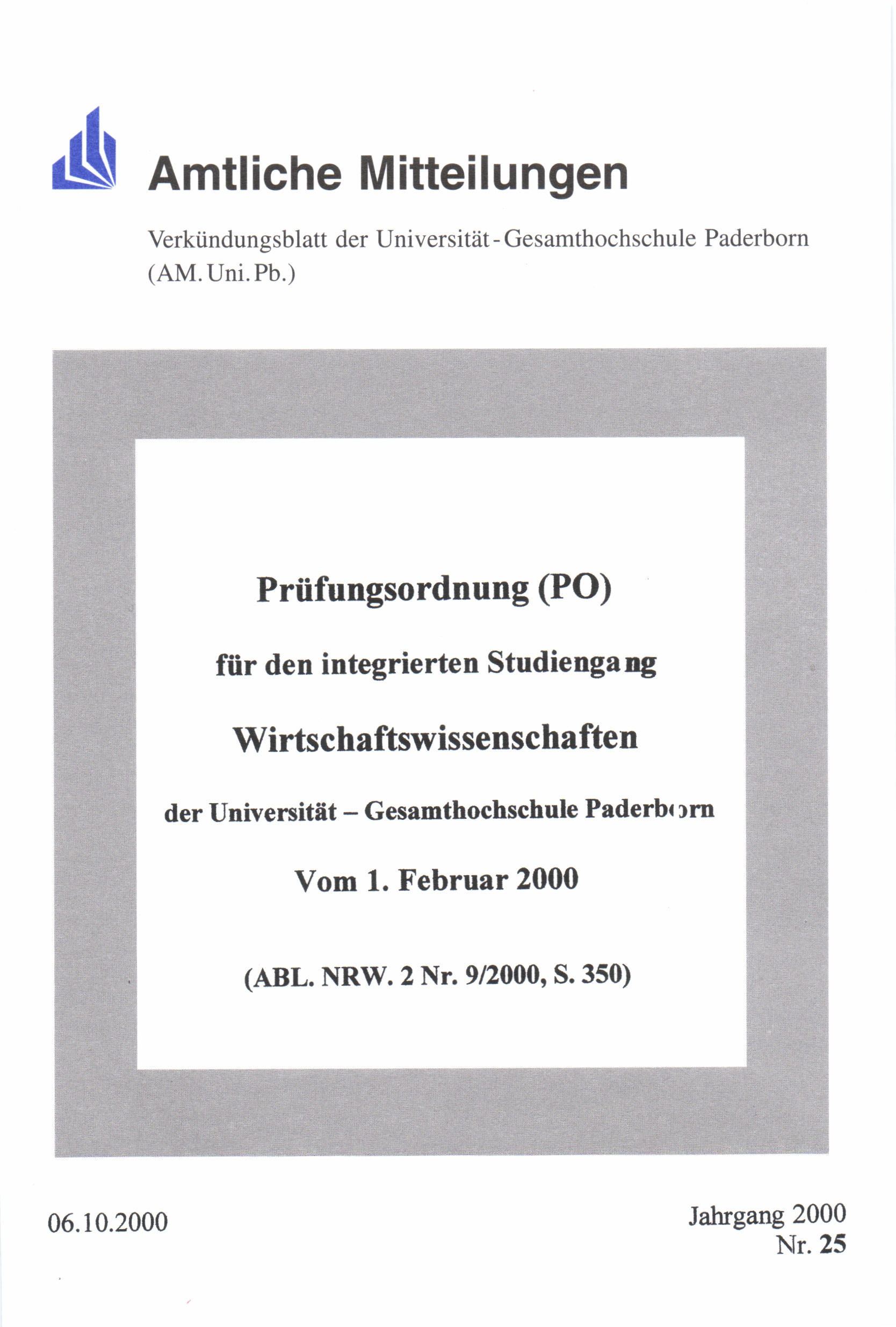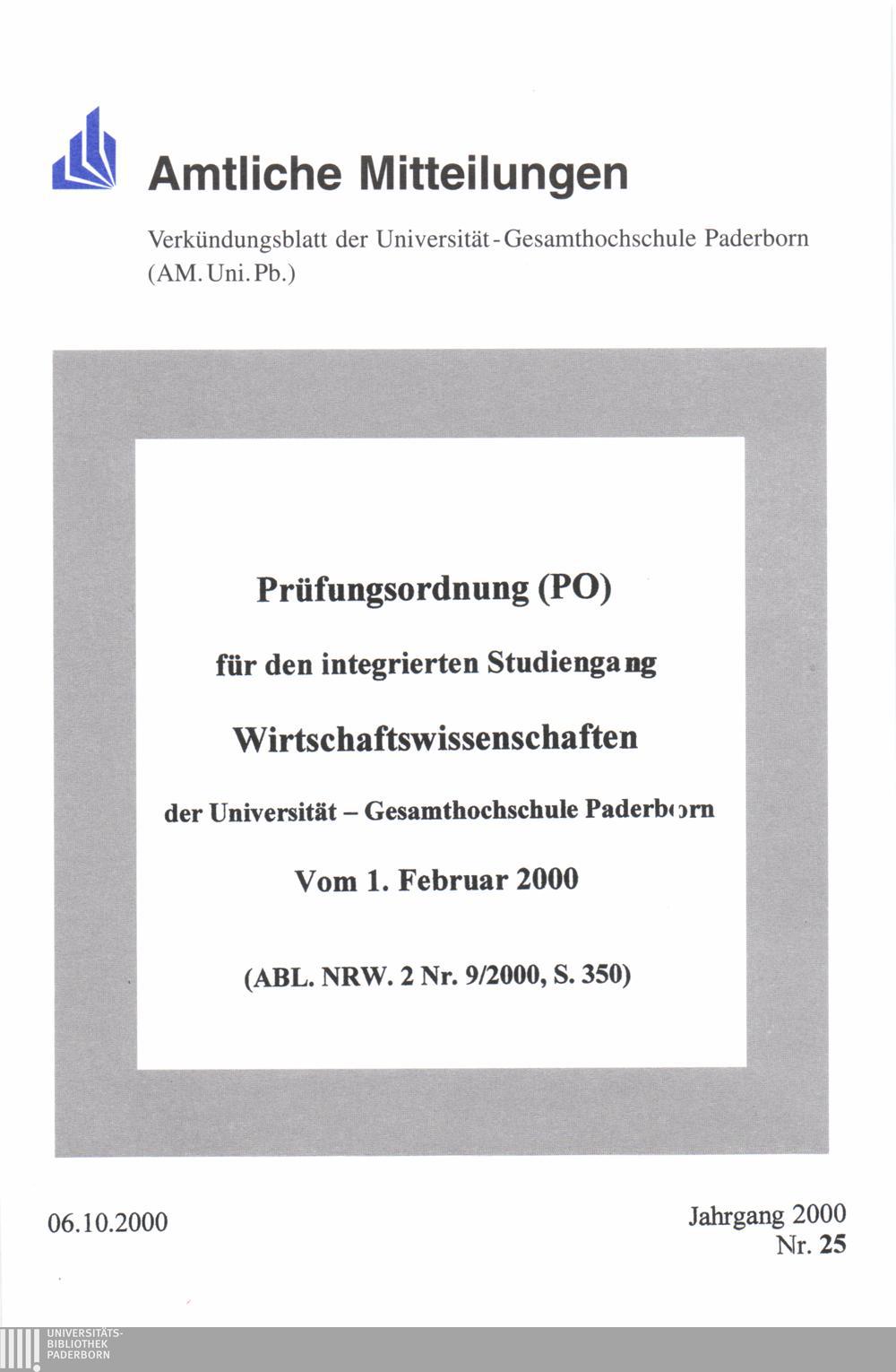 Prüfungsordnung (PO) für den integrierten Studiengang Wirtschaftswissenschaften der Universität - Gesamthochschule Paderborn : Vom 1. Februar 2000 (ABL. NRW. 2 Nr. 9/2000, S. 350)