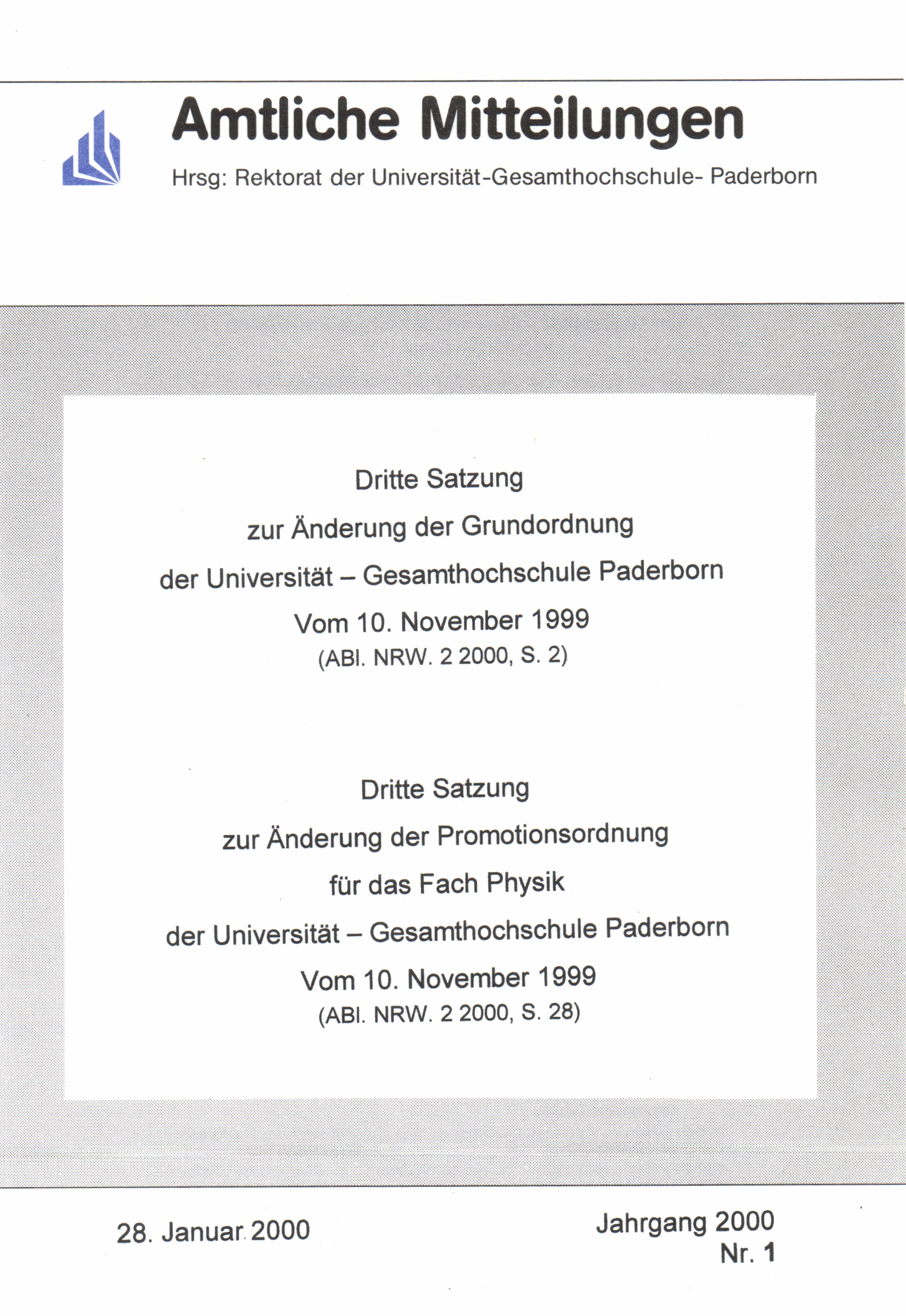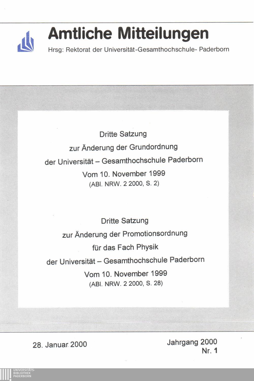 Dritte Satzung zur Änderung der Grundordnung der Universität - Gesamthochschule Paderborn : vom 10. November 1999 ;
