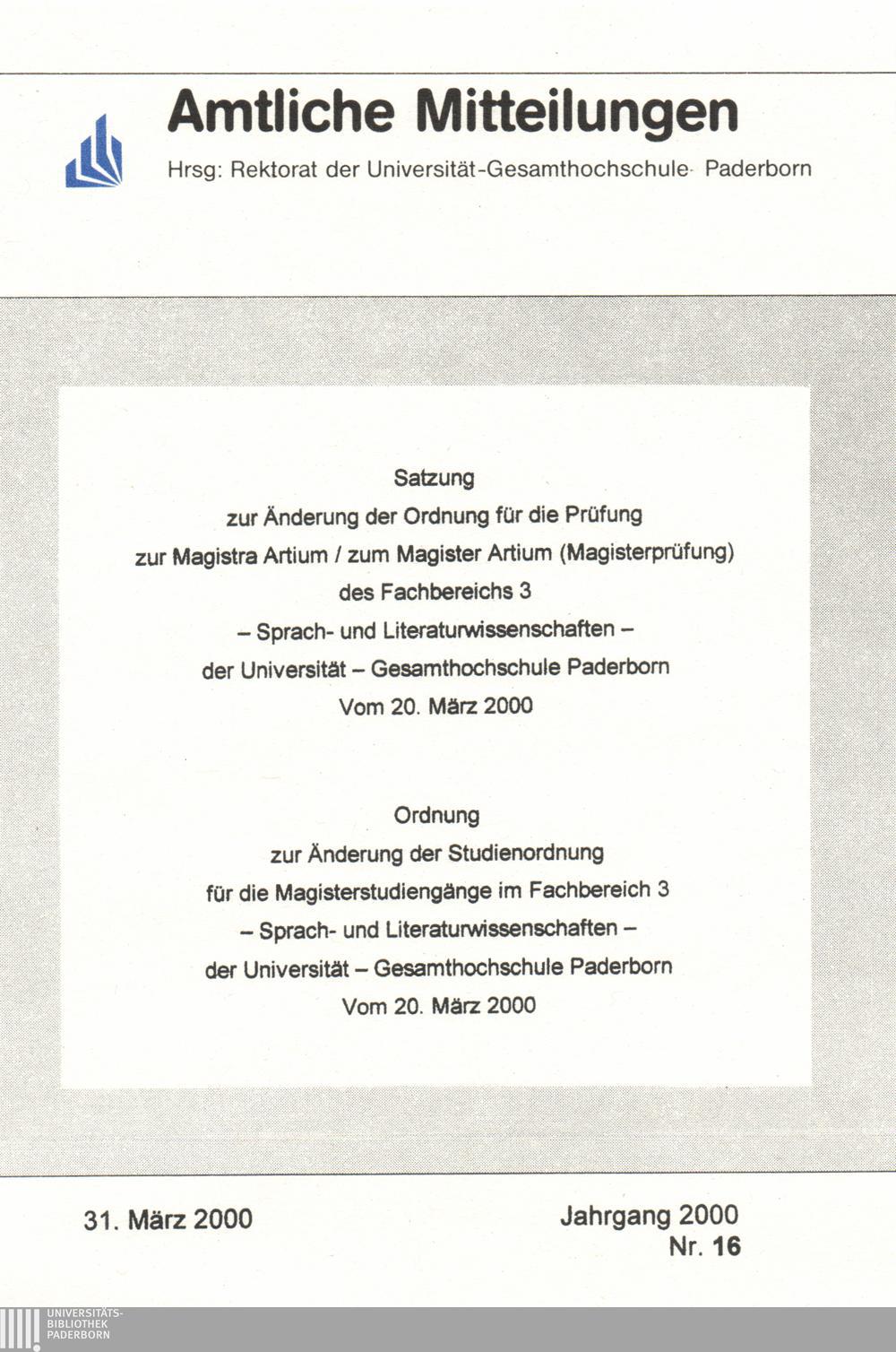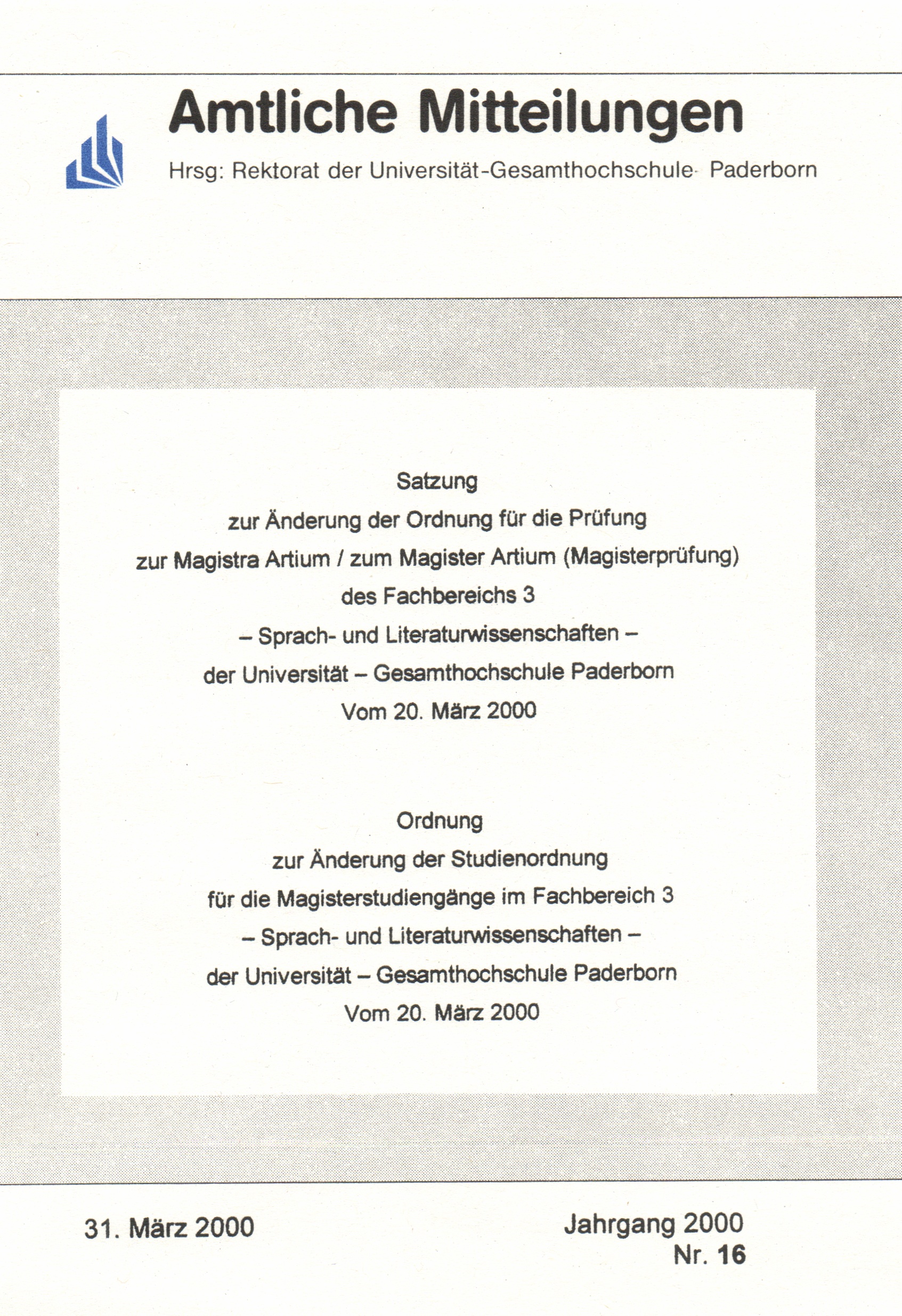 Satzung zur Änderung der Ordnung für die Prüfung zur Magistra Artium, zum Magister Artium (Magisterprüfung) des Fachbereichs 3 - Sprach- und Literaturwissenschaften - an der Universität - Gesamthochschule Paderborn : vom 20. März 2000