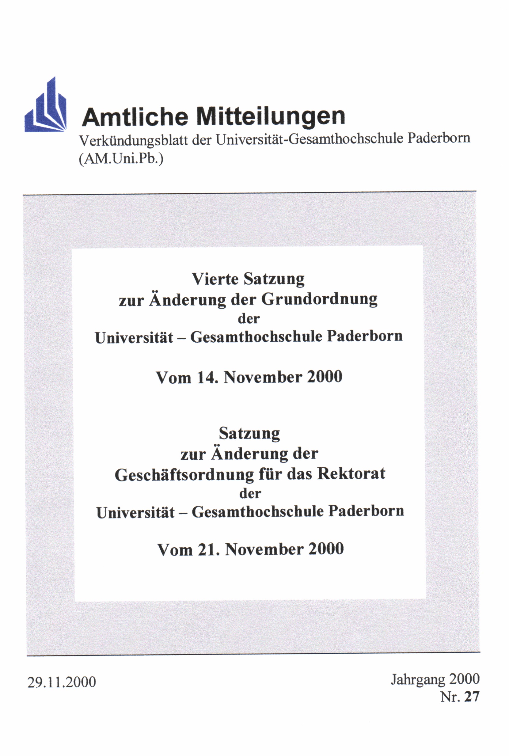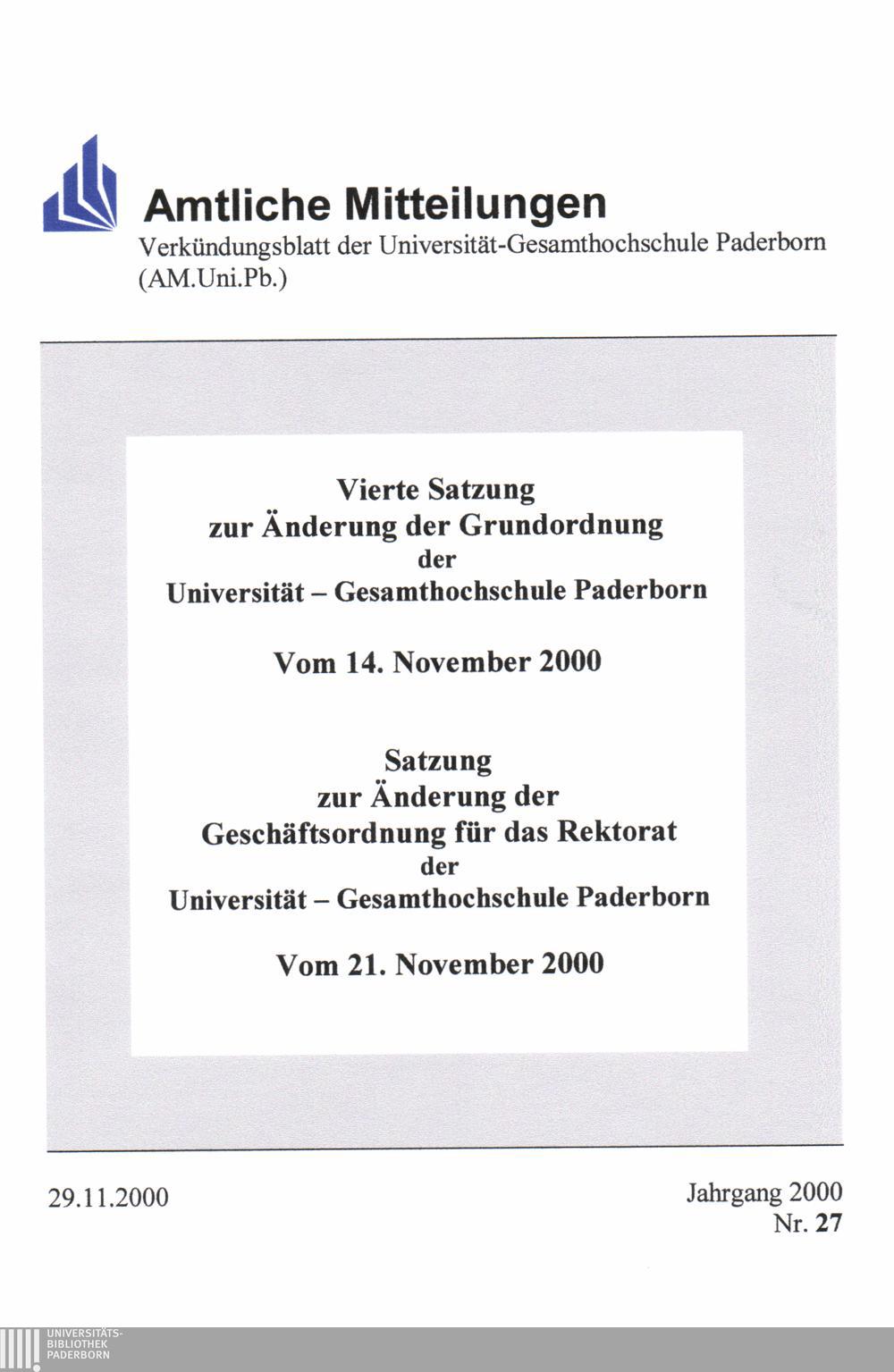 Vierte Satzung zur Änderung der Grundordnung der Universität - Gesamthochschule Paderborn : vom 14. November 2000