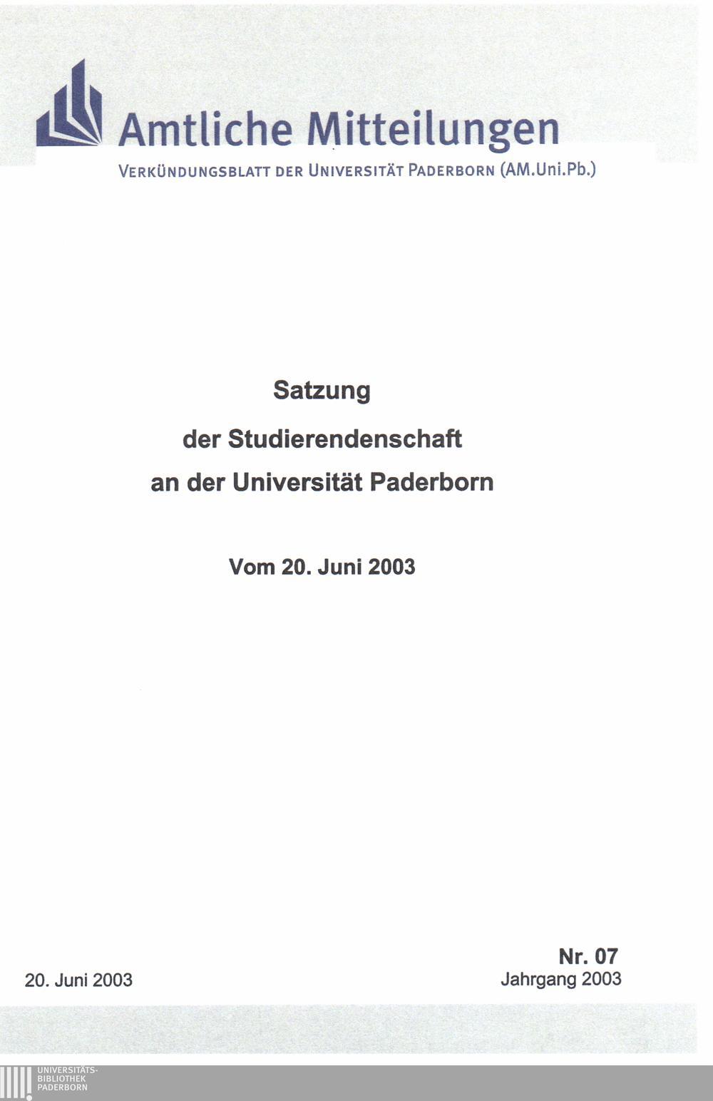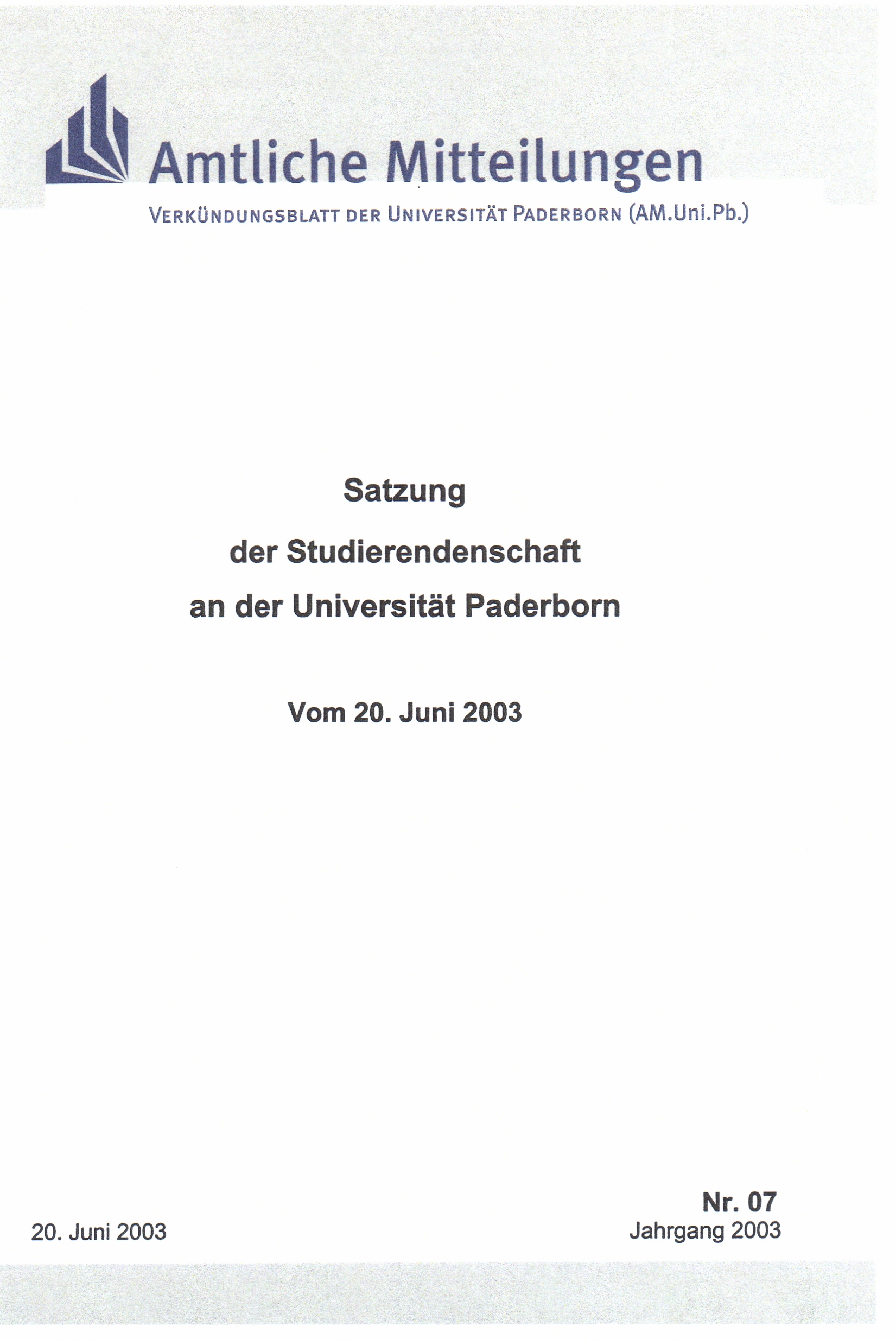Satzung der Studierendenschaft an der Universität Paderborn : vom 20. Juni 2003
