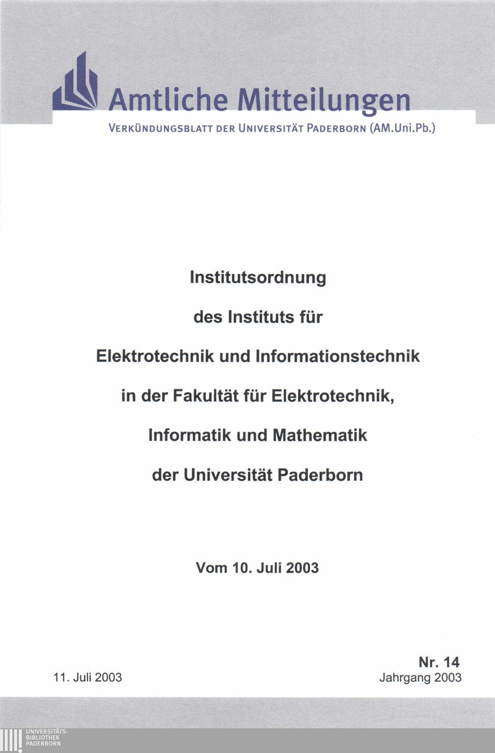 Institutsordnung des Instituts für Elektrotechnik und Informationstechnik in der Fakultät für Elektrotechnik, Informatik und Mathematik der Universität Paderborn : vom 10. Juli 2003