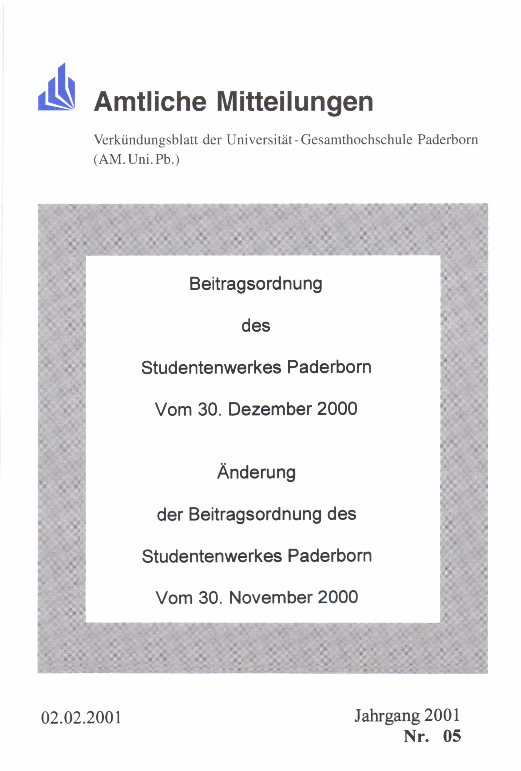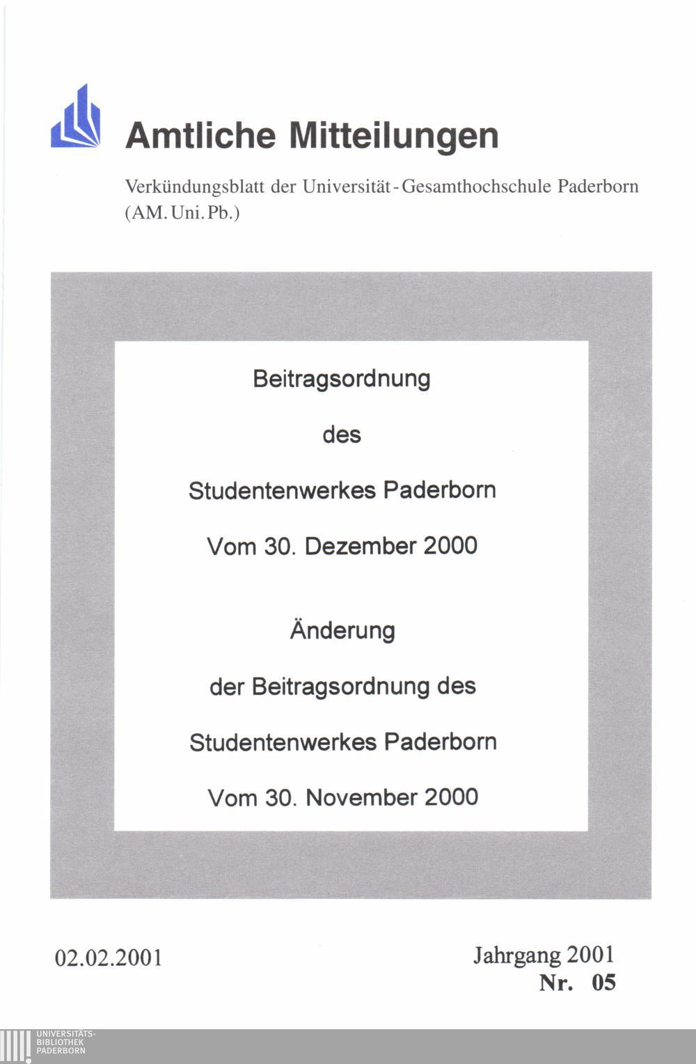 Beitragsordnung des Studentenwerkes Paderborn : vom 30. Dezember 2000