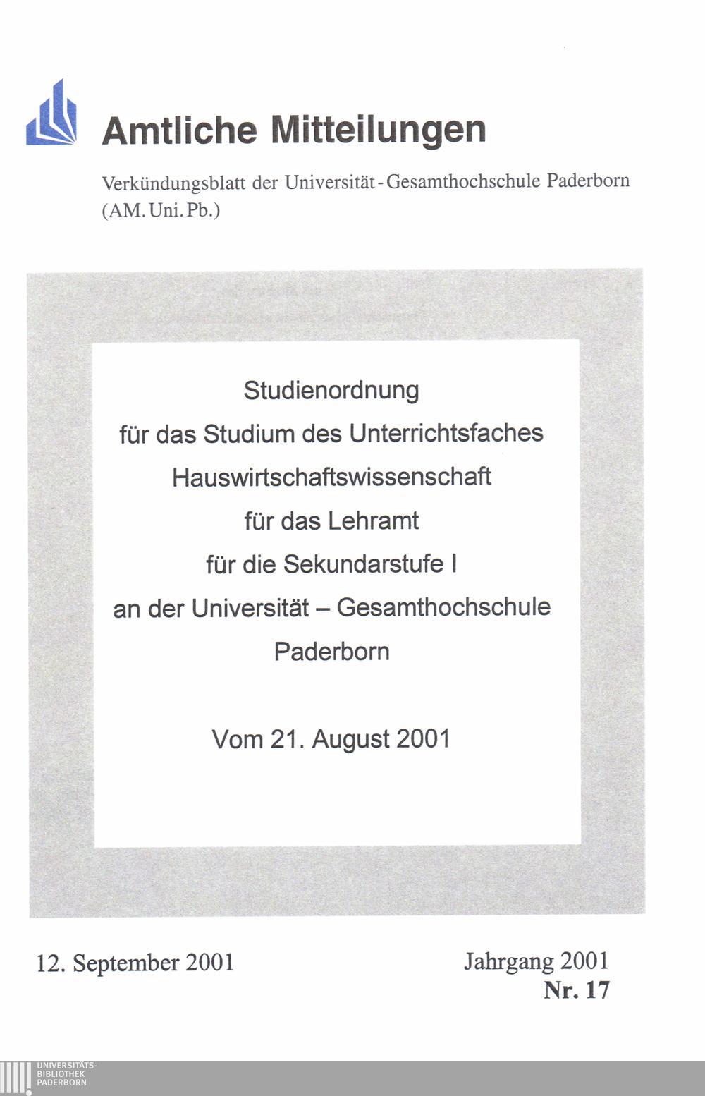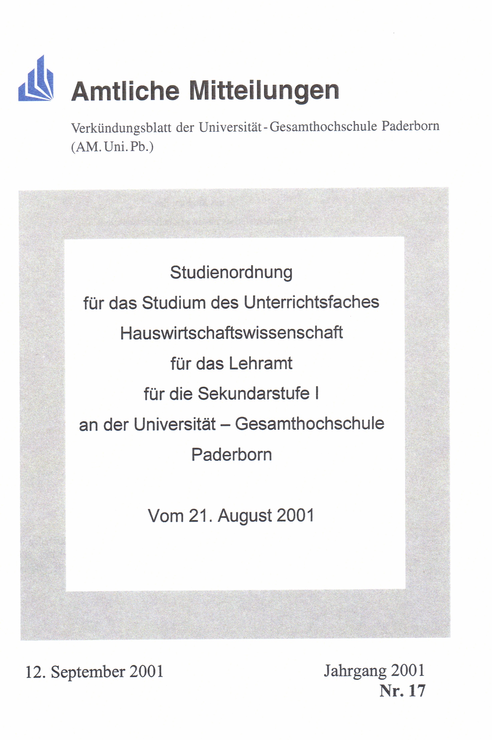 Studienordnung für das Studium des Unterrichtsfaches Hauswirtschaftswissenschaft für das Lehramt für die Sekundarstufe I an der Universität-Gesamthochschule Paderborn : vom 21. August 2001