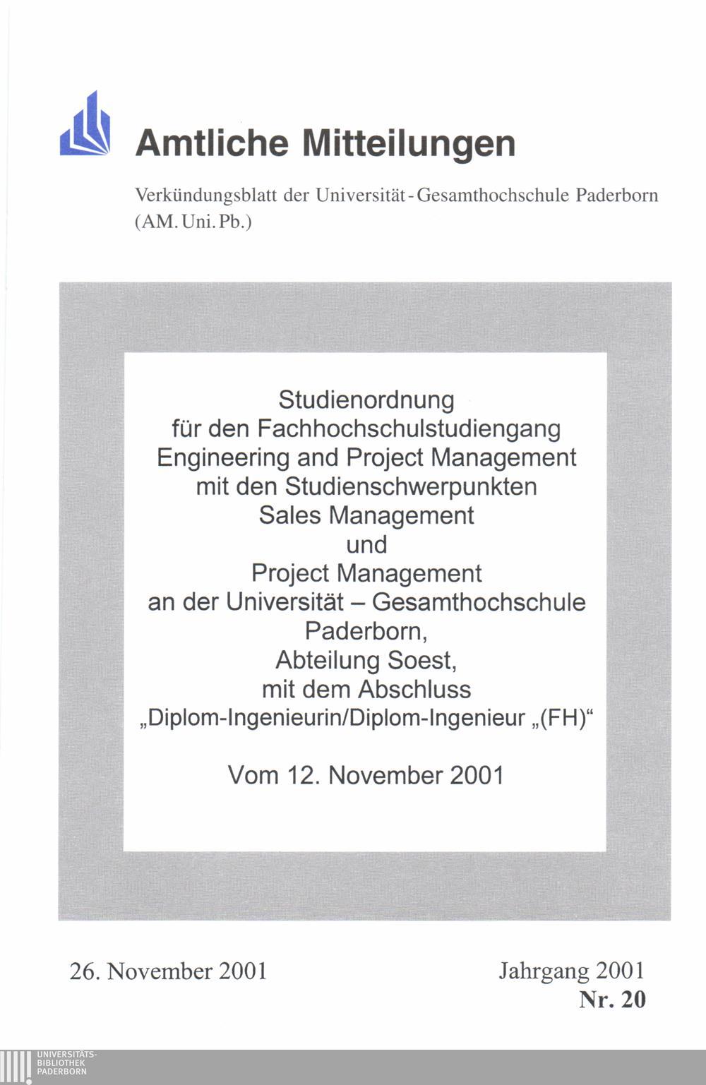 Studienordnung für den Fachhochschulstudiengang "Engineering and Project Management" mit den Studienschwerpunkten "Sales Management und Project Management" an der Universität-Gesamthochschule Paderborn, Abteilung Soest, mit dem Abschluss Diplom-Ingenieurin, Diplom-Ingenieur ("FH") : vom 12. November 2001