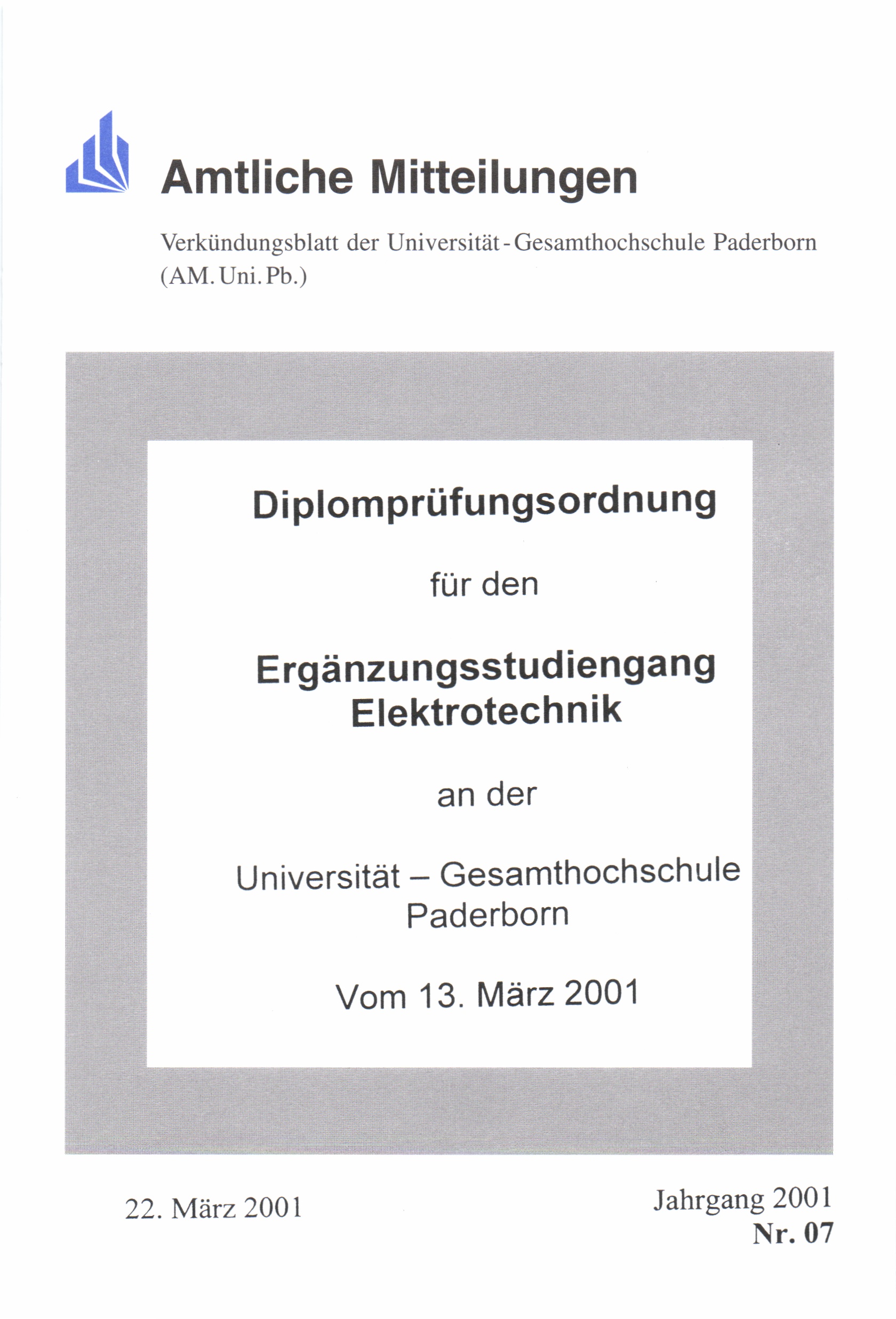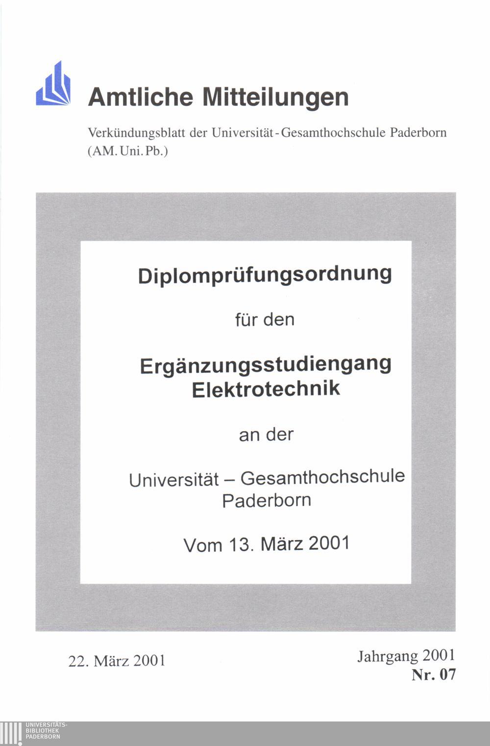 Diplomprüfungsordnung für den Ergänzungsstudiengang Elektrotechnik an der Universität-Gesamthochschule Paderborn : vom 13. März 2001