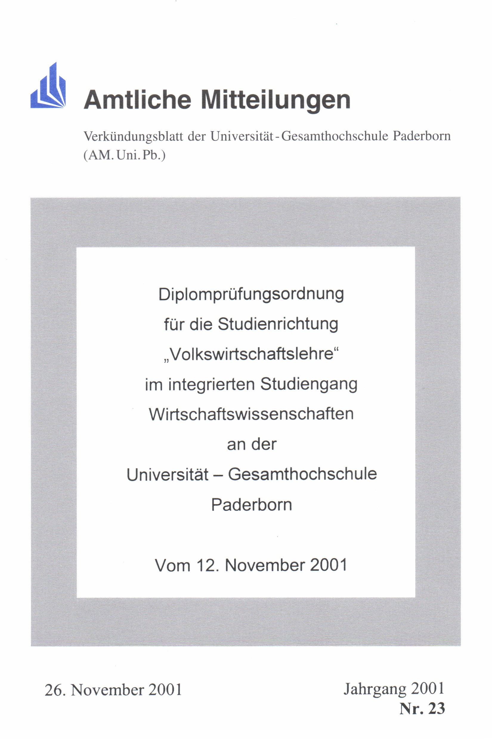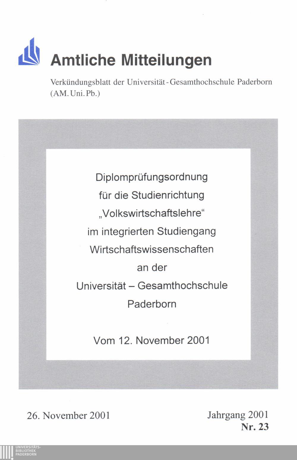 Diplomprüfungsordnung für die Studienrichtung "Volkswirtschaftslehre" im integrierten Studiengang Wirtschaftswissenschaften an der Universität-Gesamthochschule Paderborn : vom 12. November 2001
