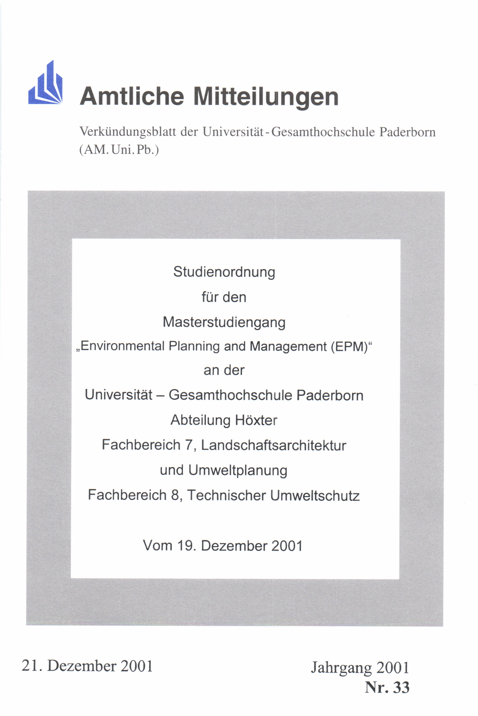 Studienordnung für den Masterstudiengang "Environmental Planning and Management (EPM)" an der Universität-Gesamthochschule Paderborn, Abteilung Höxter, Fachbereich 7, Landschaftsarchitektur und Umweltplanung und Fachbereich 8, Technischer Umweltschutz : vom 19. Dezember 2001