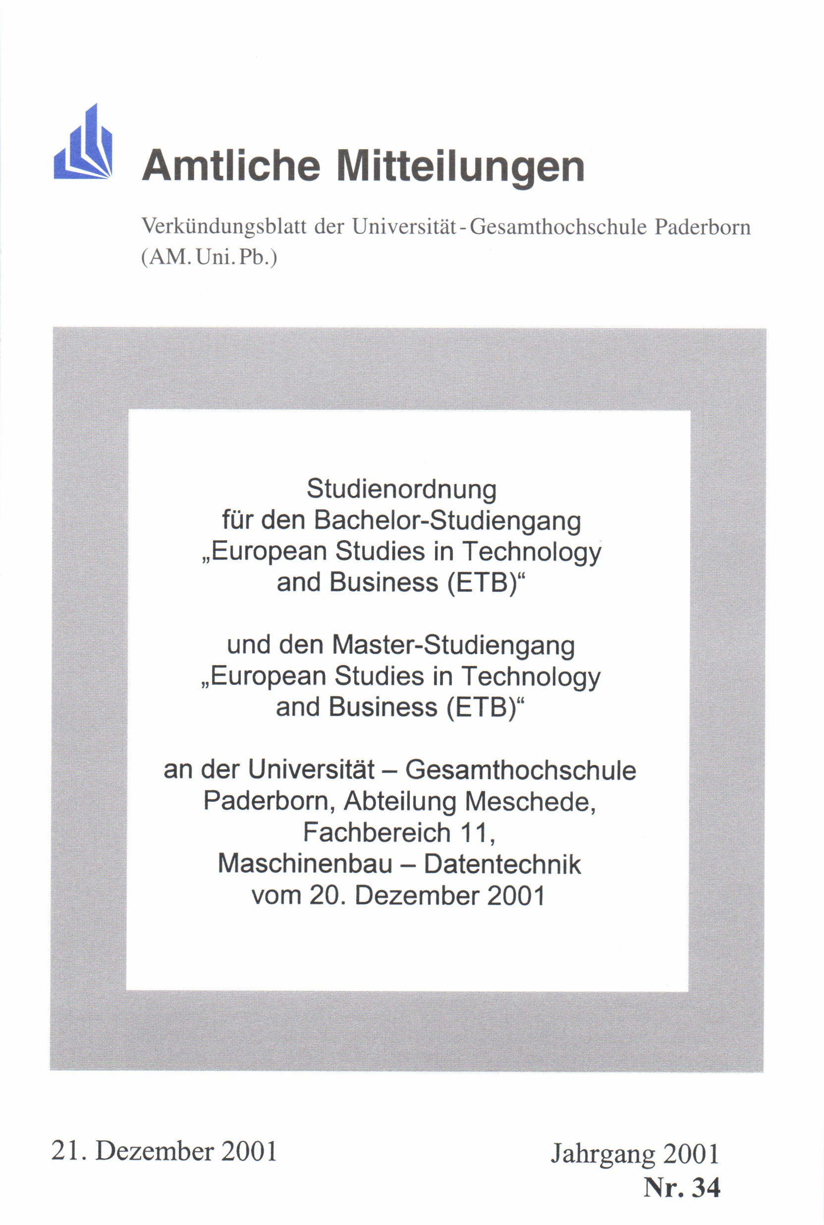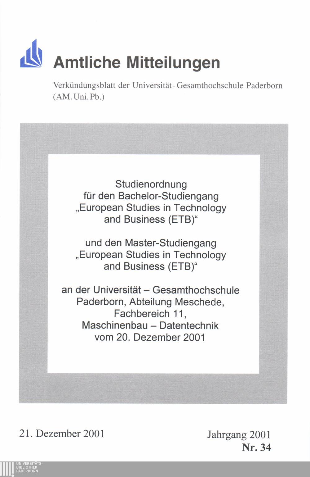 Studienordnung für den Bachelor-Studiengang "European Studies in Technology and Business (ETB)" und den Master-Studiengang "European Studies in Technology and Business (ETB)" an der Universität Gesamthochschule Paderborn, Abteilung Meschede, Fachbereich 11, Maschinenbau, Datentechnik : vom 20. Dezember 2001