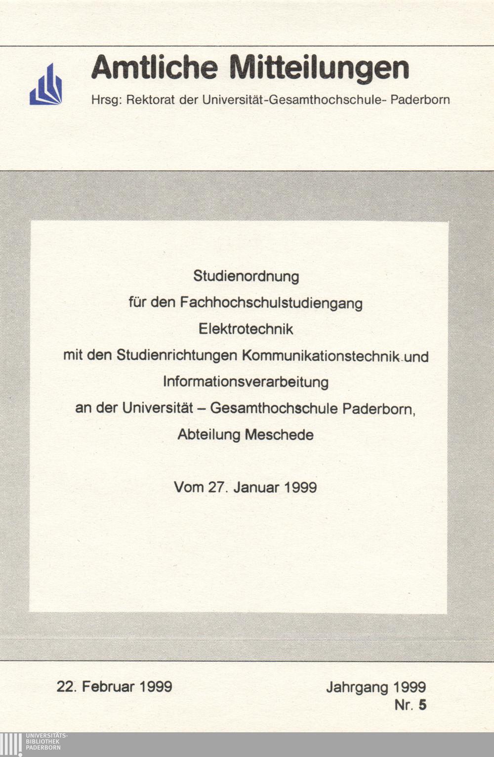 Studienordnung für den Fachhochschulstudiengang Elektrotechnik mit den Studienrichtungen Kommunikationstechnik und Informationsverarbeitung an der Universität - Gesamthochschule Paderborn, Abteilung Meschede : Vom 27. Januar 1999