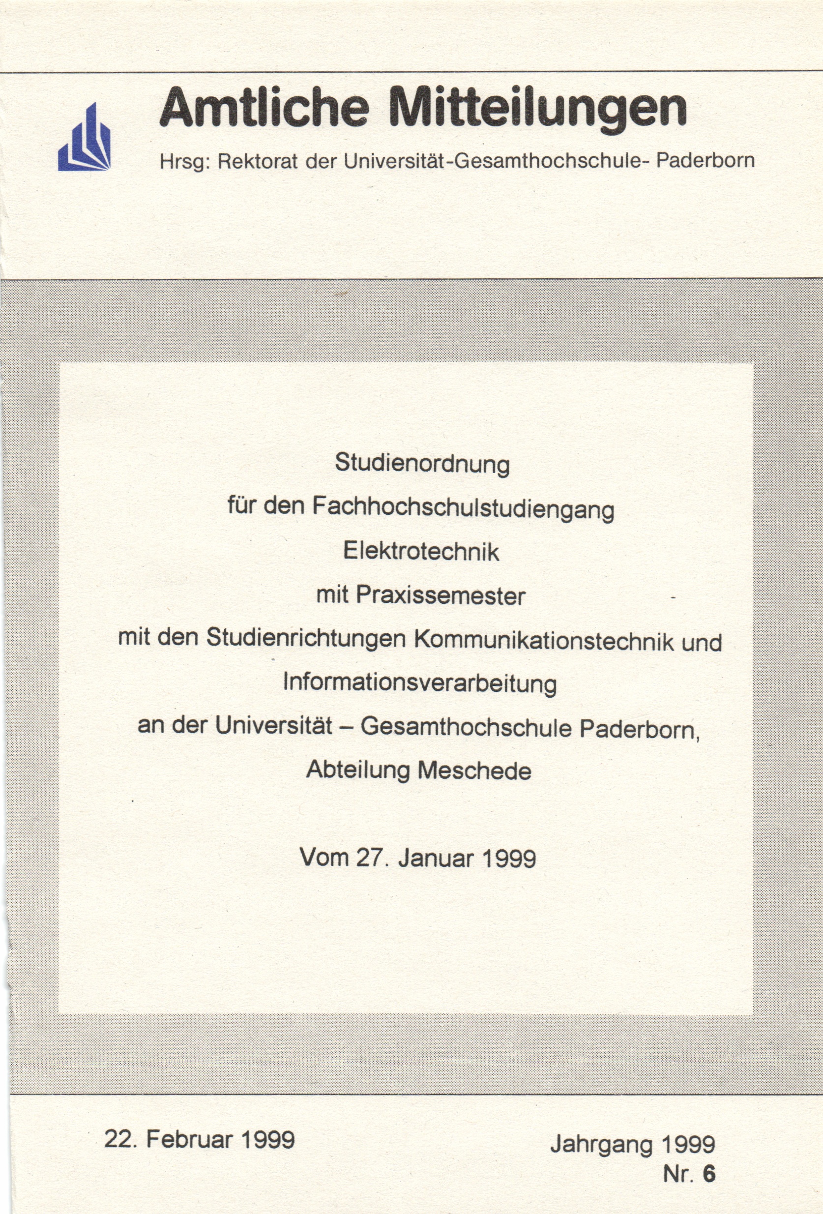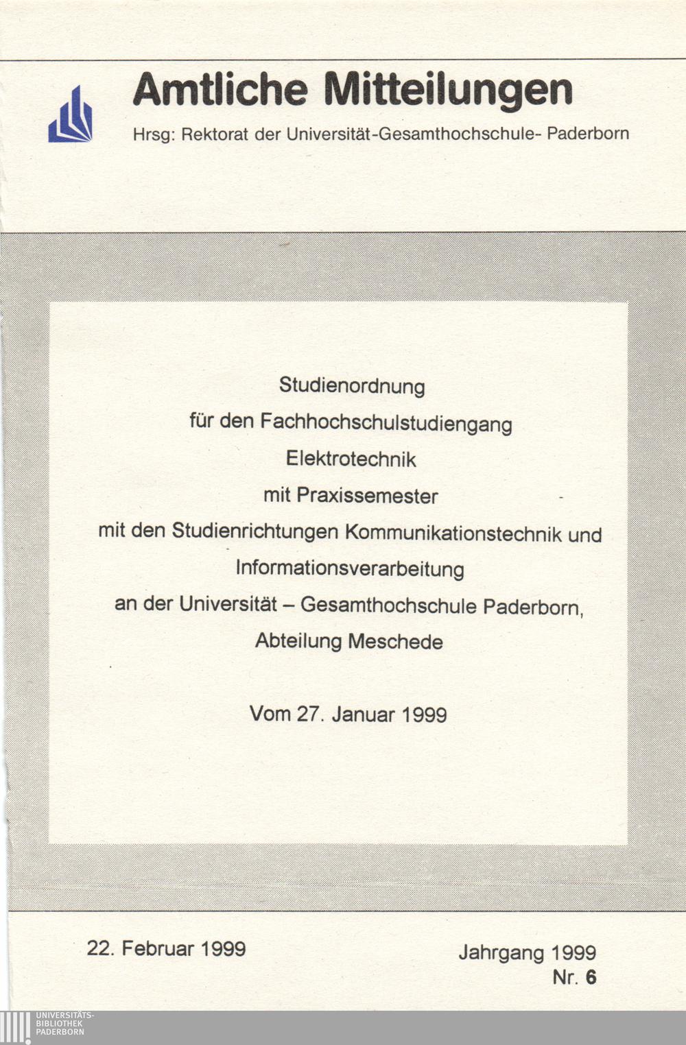 Studienordnung für den Fachhochschulstudiengang Elektrotechnik mit Praxissemester mit den Studieneinrichtungen Kommunikationstechnik und Informationsverarbeitung an der Universität - Gesamthochschule Paderborn, Abteilung Meschede : Vom 27. Januar 1999