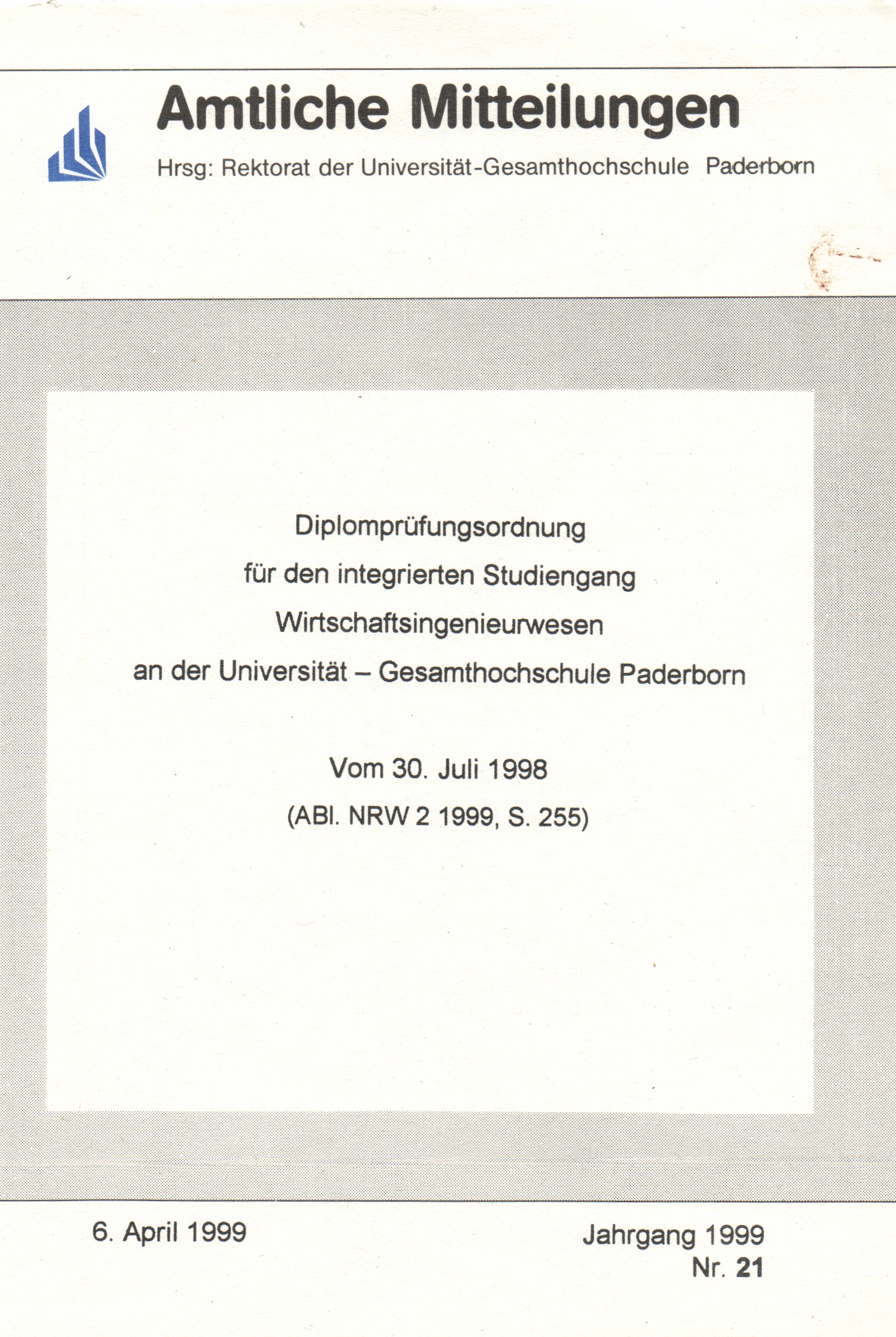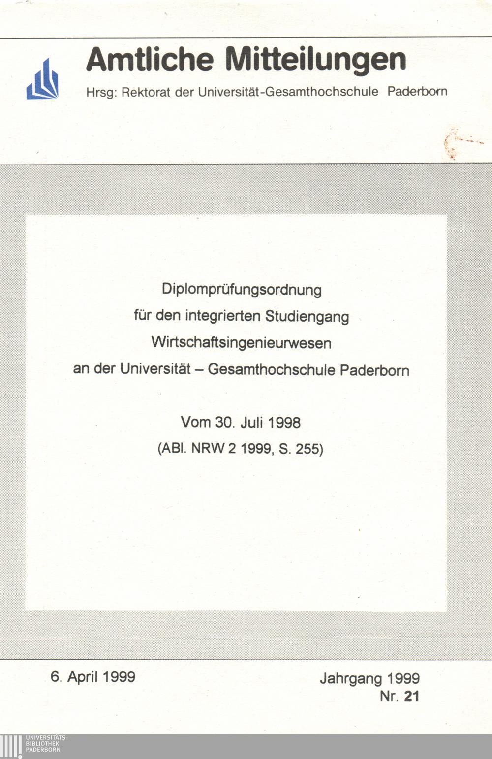 Diplomprüfungsordnung für den integrierten Studiengang Wirtschaftsingenieurwesen an der Universität - Gesamthochschule Paderborn : Vom 30. Juli 1998