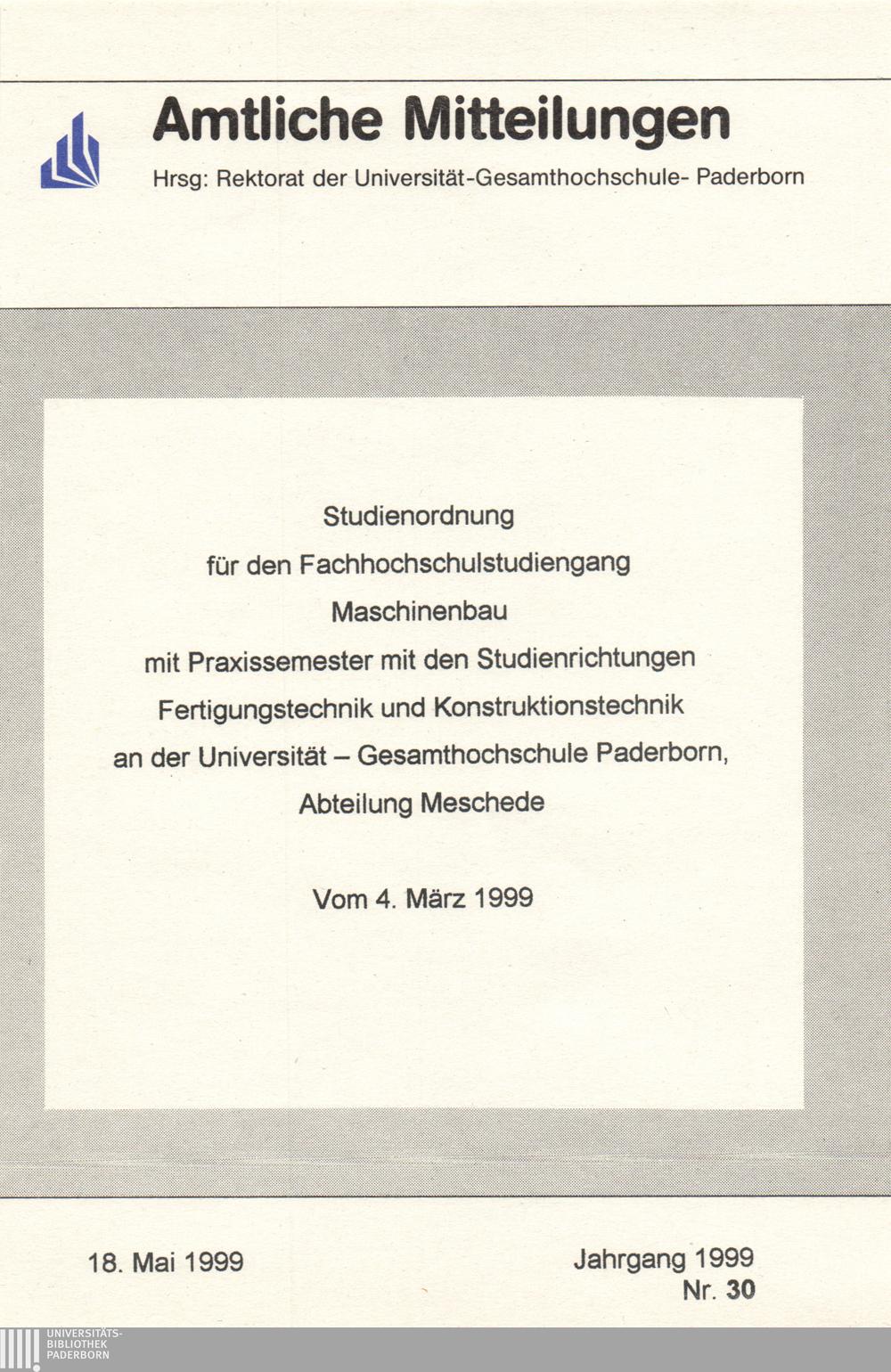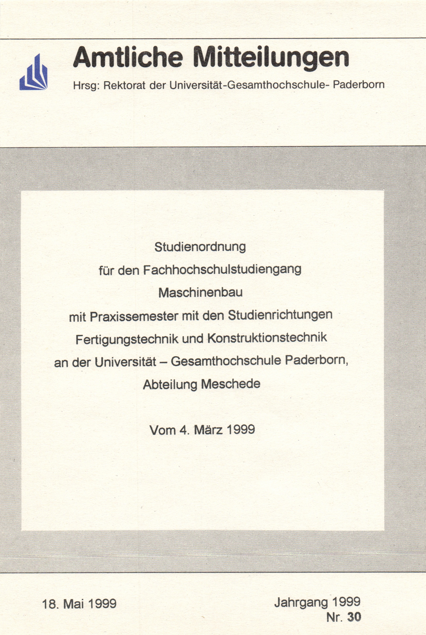 Studienordnung für den Fachhochschulstudiengang Maschinenbau mit Praxissemester mit den Studienrichtungen Fertigungstechnik und Konstruktionstechnik an der Universität - Gesamthochschule Paderborn, Abteilung Meschede : Vom 4. März 1999