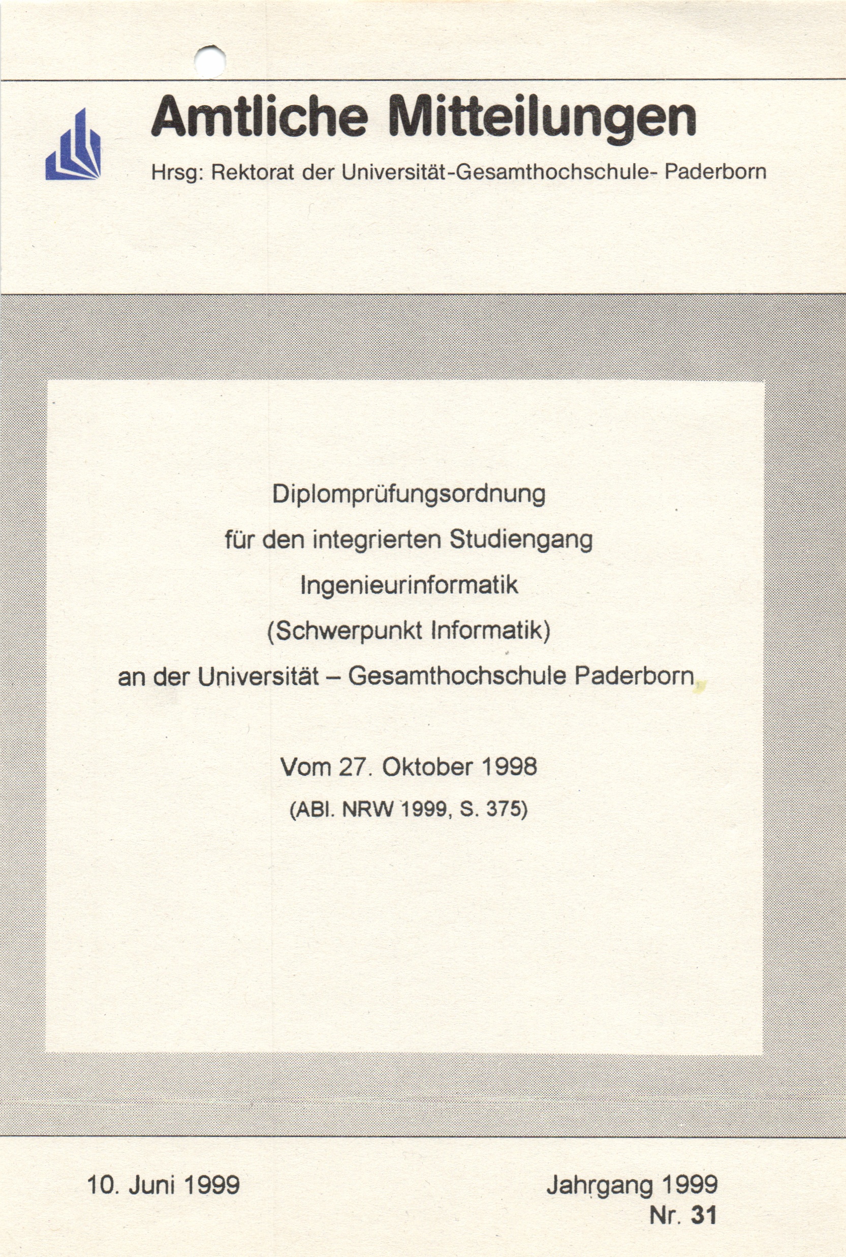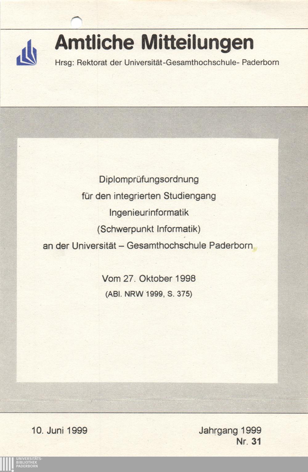 Diplomprüfungsordnung für den integrierten Studiengang Ingenieurinformatik (Schwerpunkt Informatik) an der Universität - Gesamthochschule Paderborn : Vom 27. Oktober 1998 (ABl. NRW 1999, S. 375)