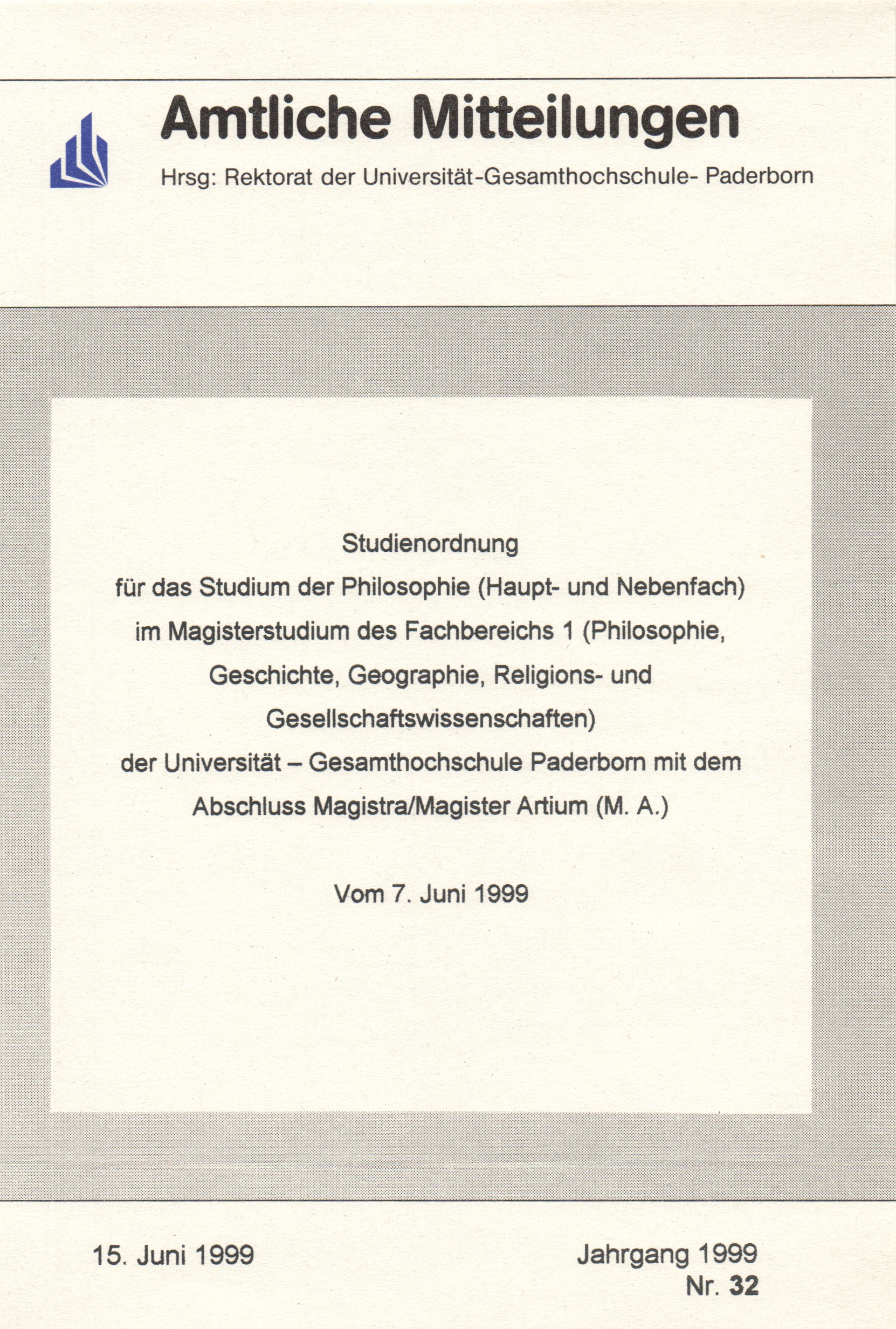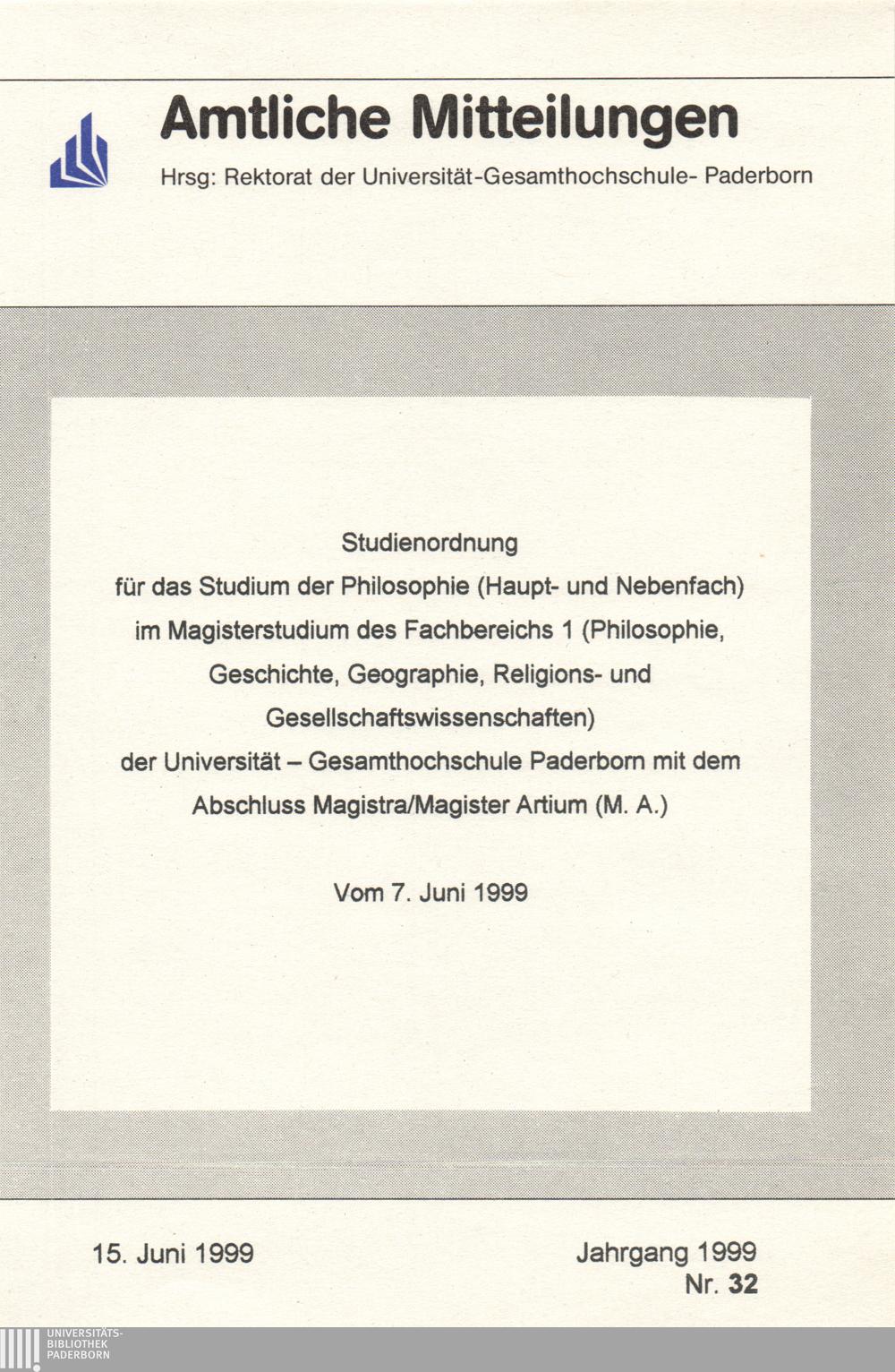 Studienordnung für das Studium der Philosophie (Haupt- und Nebenfach) im Magisterstudium des Fachbereichs 1 (Philosophie, Geschiche, Geographie, Religions- und Gesellschaftswissenschaften) der Universität - Gesamthochschule Paderborn mit dem Abschluss Magistra/Magister Artium (M.A.) : Vom 7. Juni 1999