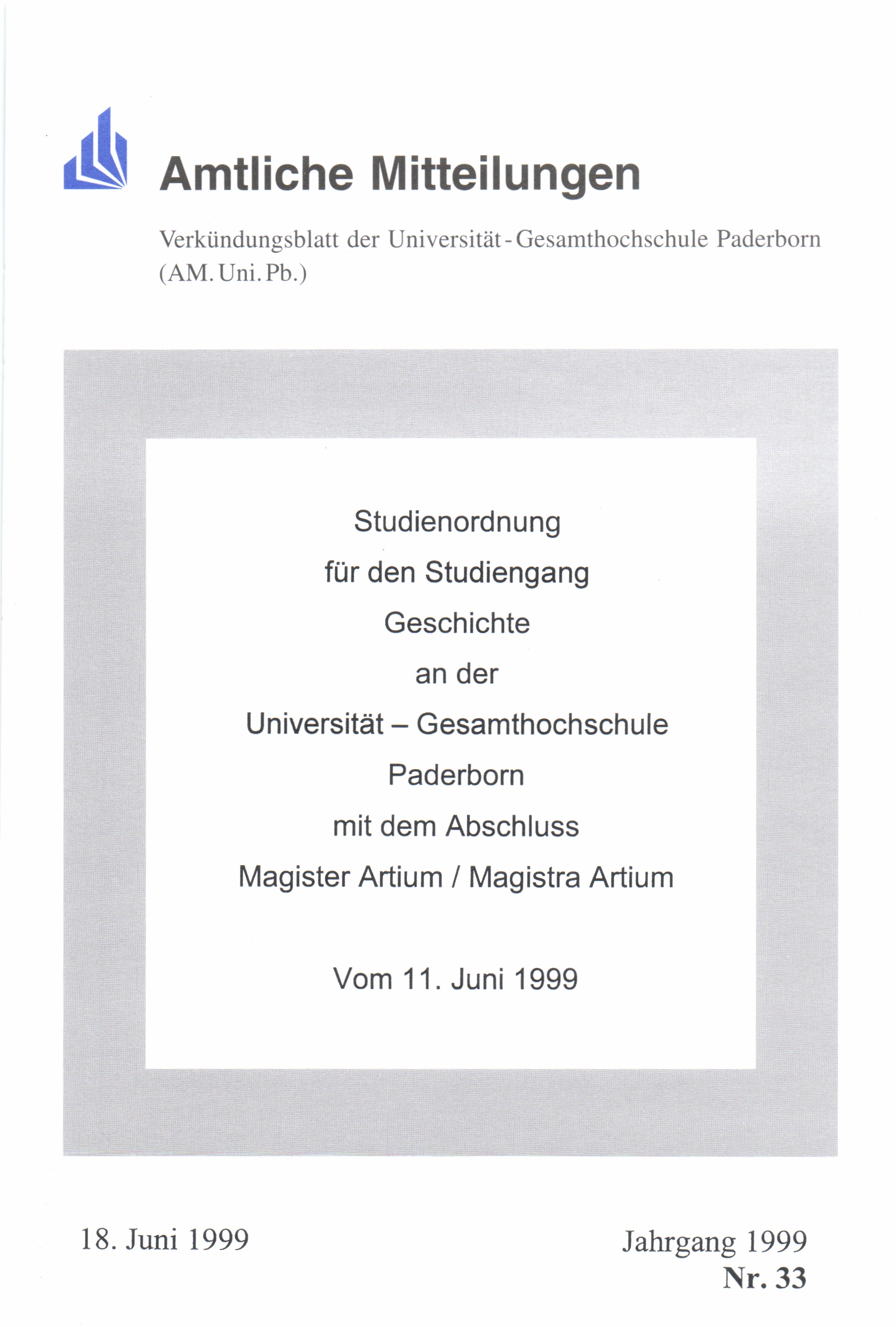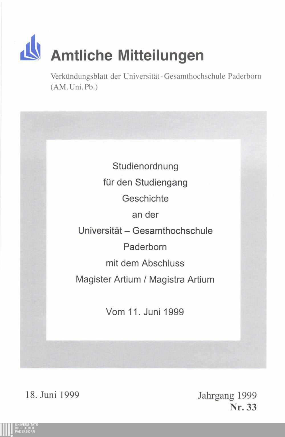 Studienordnung für den Studiengang Geschichte an der Universität - Gesamthochschule Paderborn mit dem Abschluss Magister Artium/Magistra Artium : Vom 11. Juni 1999