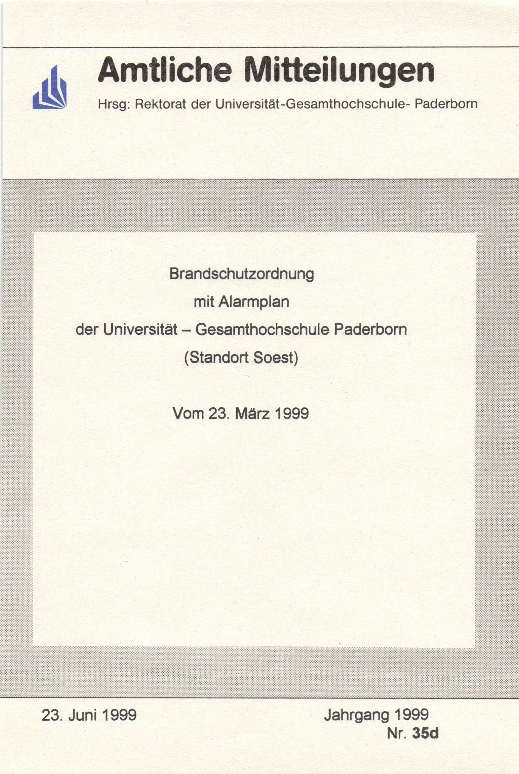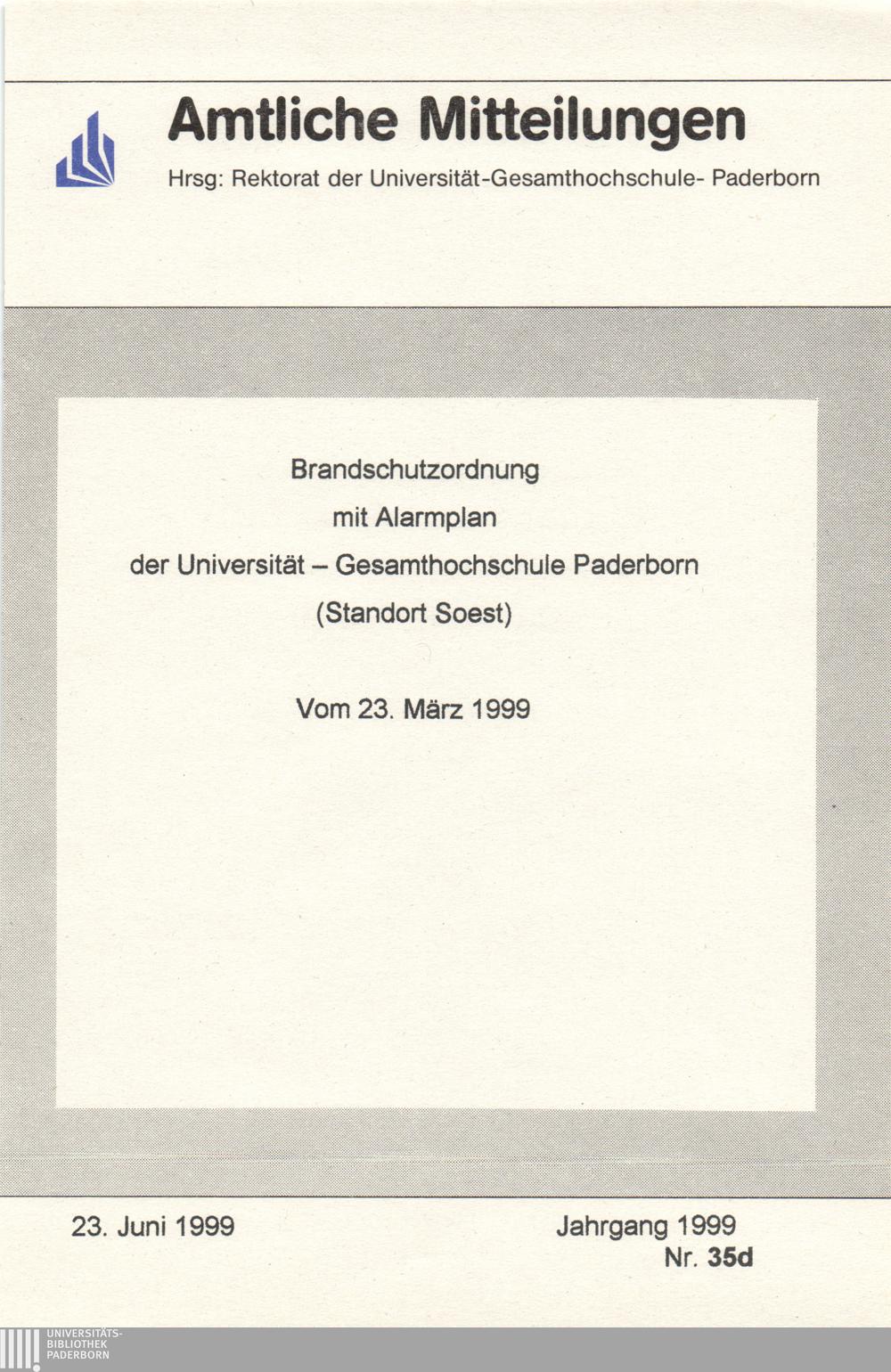 Brandschutzordnung mit Alarmplan der Universität - Gesamthochschule Paderborn (Standort Soest) : Vom 23. März 1999