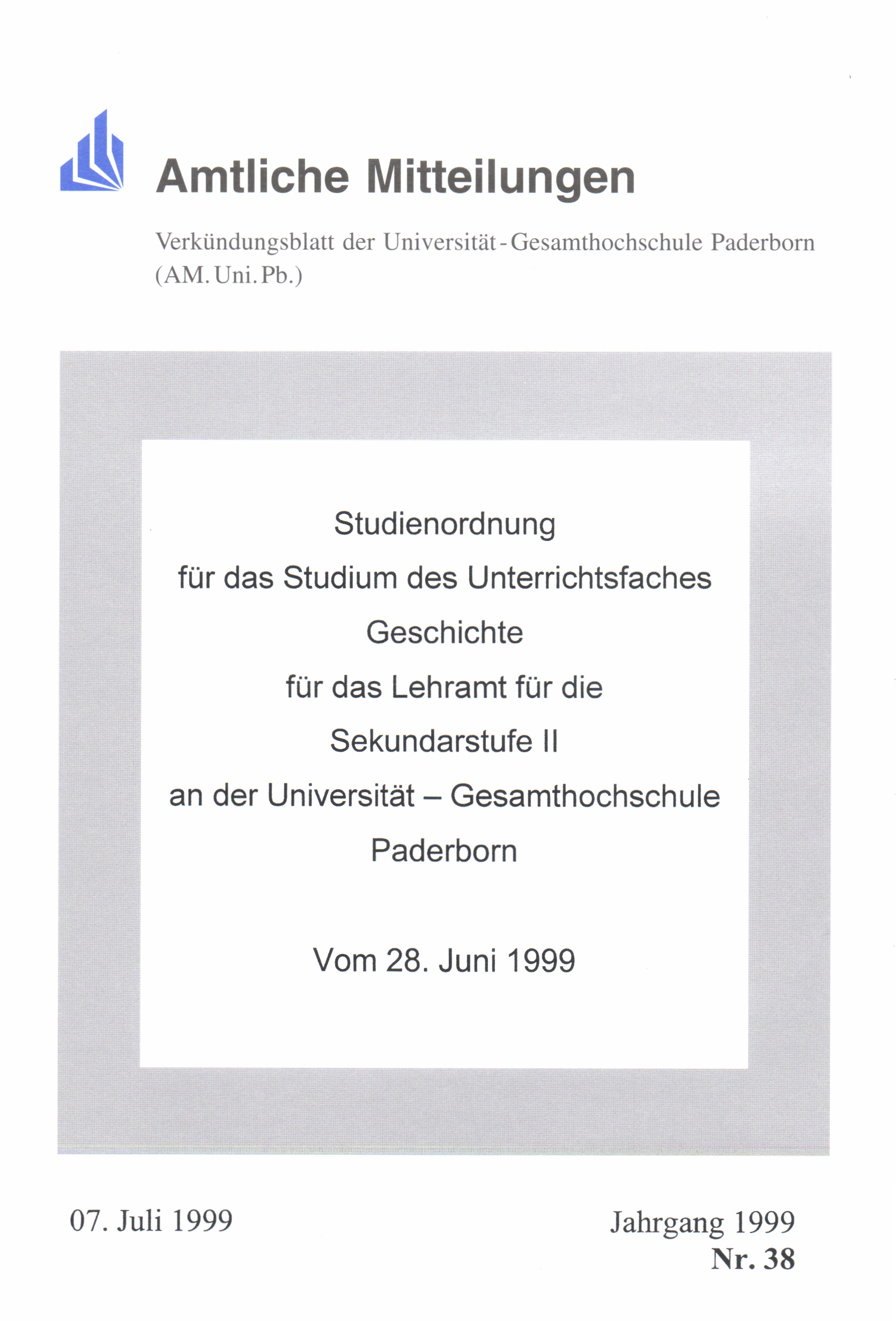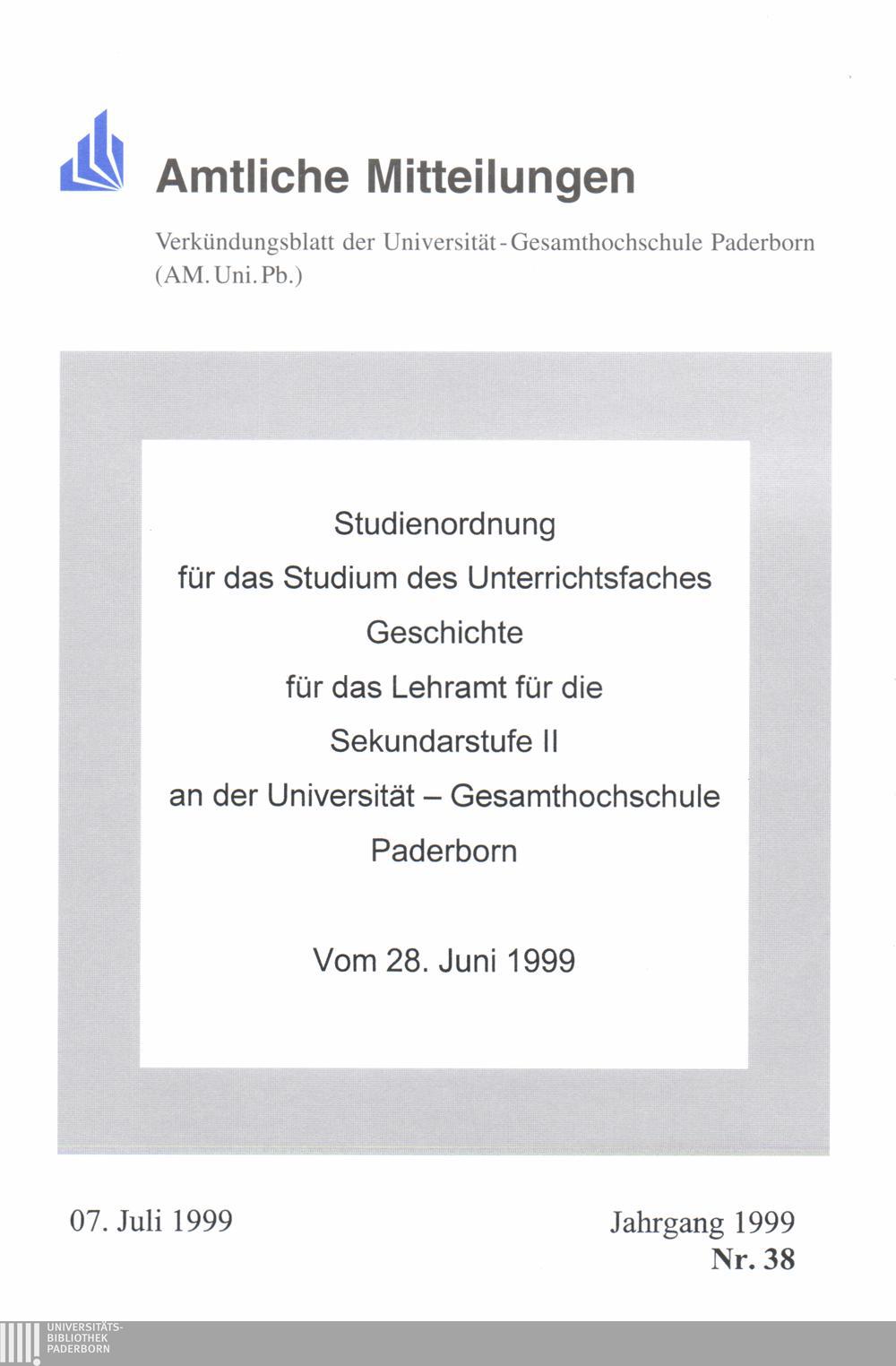 Studienordnung für das Studium des Unterrichtsfaches Geschichte für das Lehramt für die Sekundarstufe II an der Universität - Gesamthochschule Paderborn : Vom 28. Juni 1999