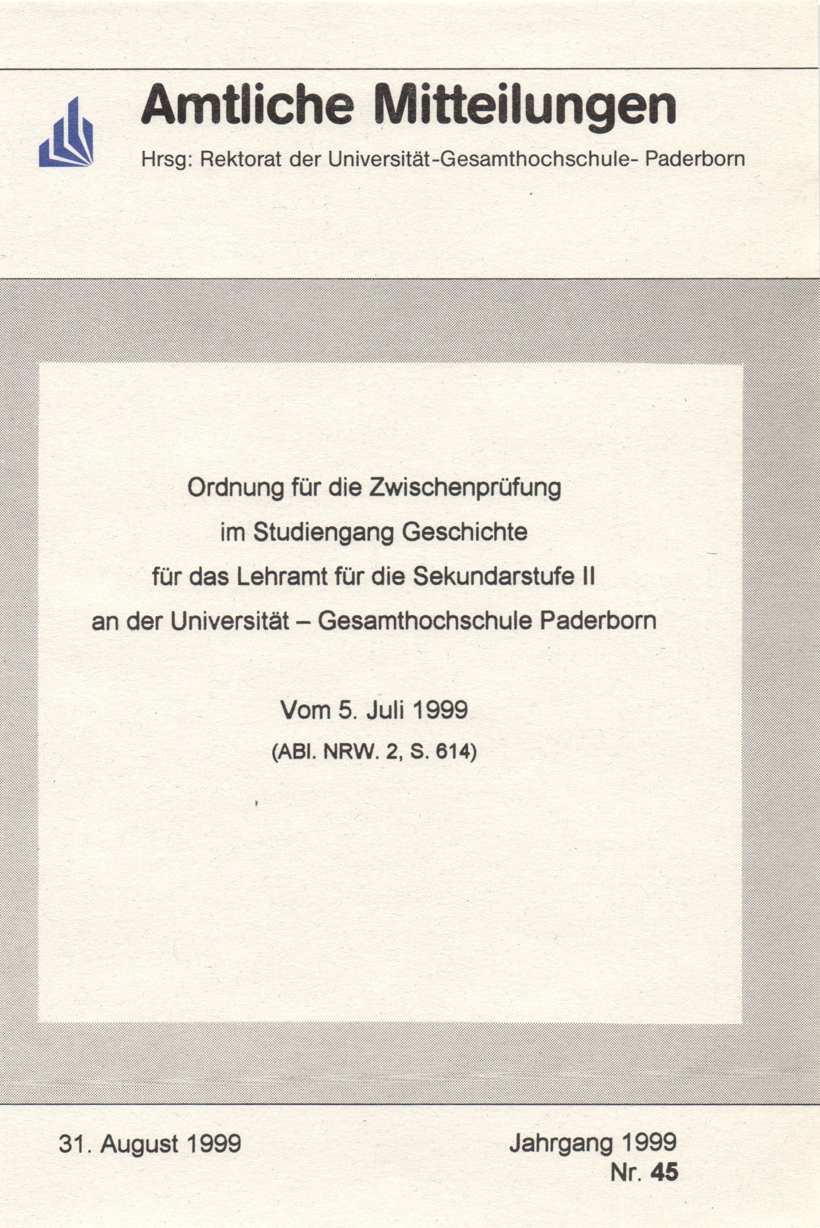 Ordnung für die Zwischenprüfung im Studiengang Geschichte für das Lehramt für die Sekundarstufe II der Universität - Gesamthochschule Paderborn : vom 5. Juli 1999