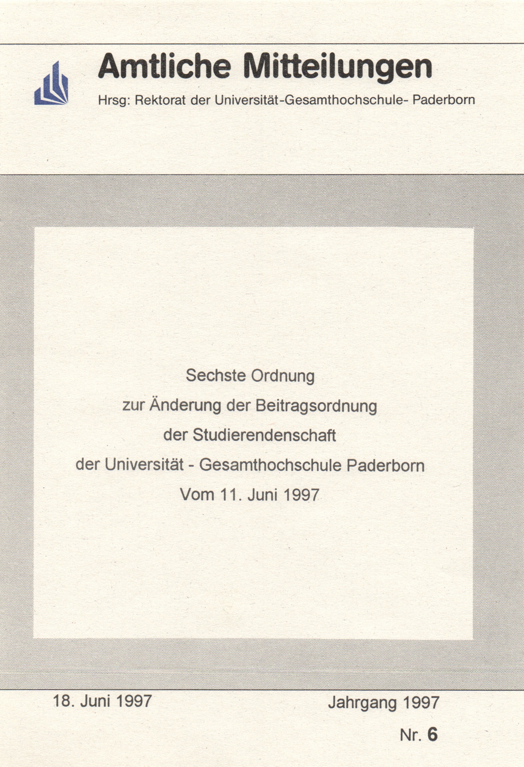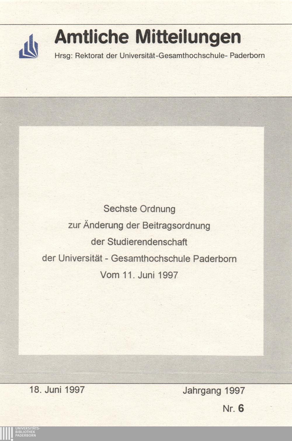 Sechste Ordnung zur Änderung der Beitragsordnung der Studierendenschaft der Universität - Gesamthochschule Paderborn : vom 11. Juni 1997
