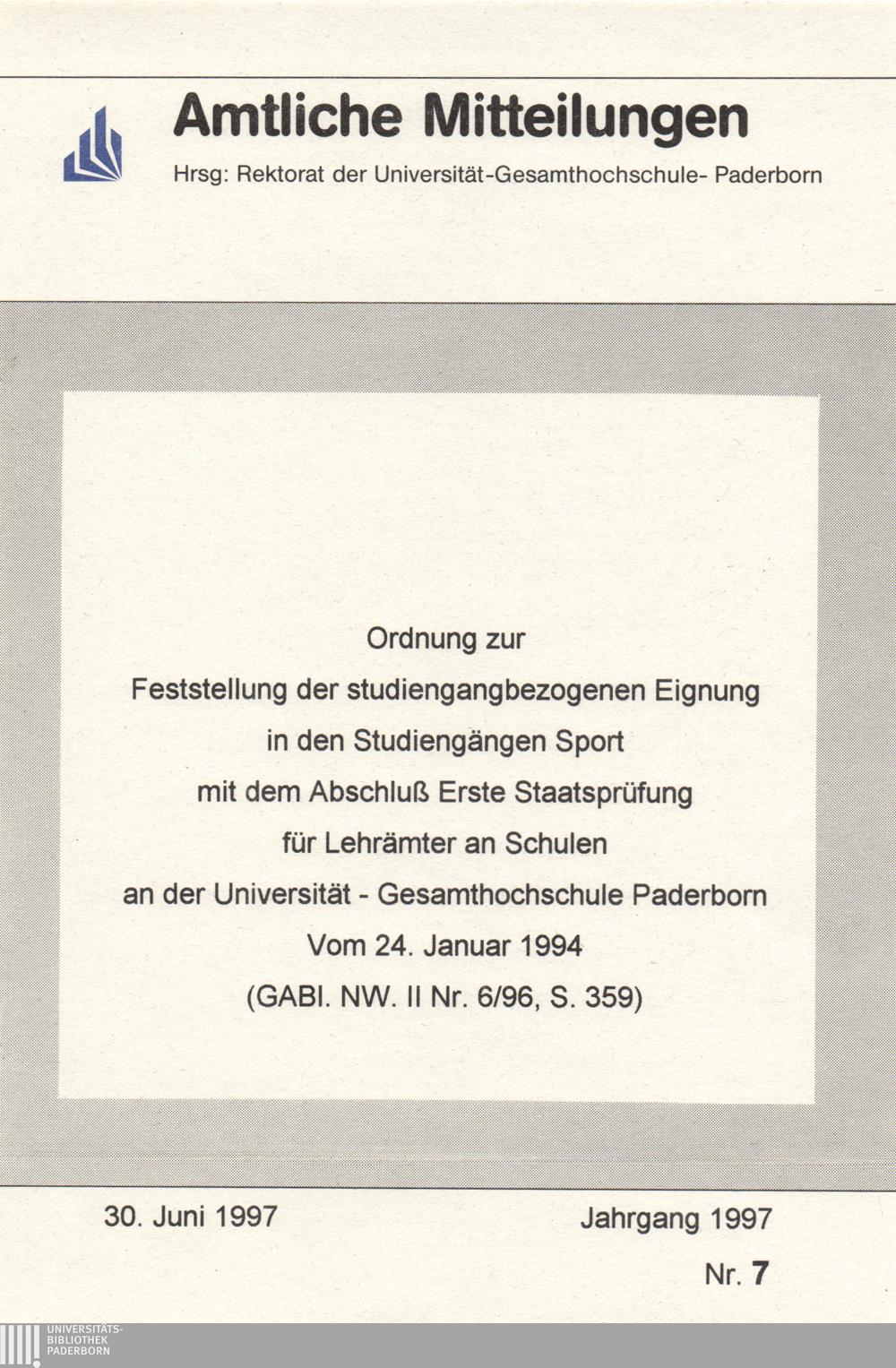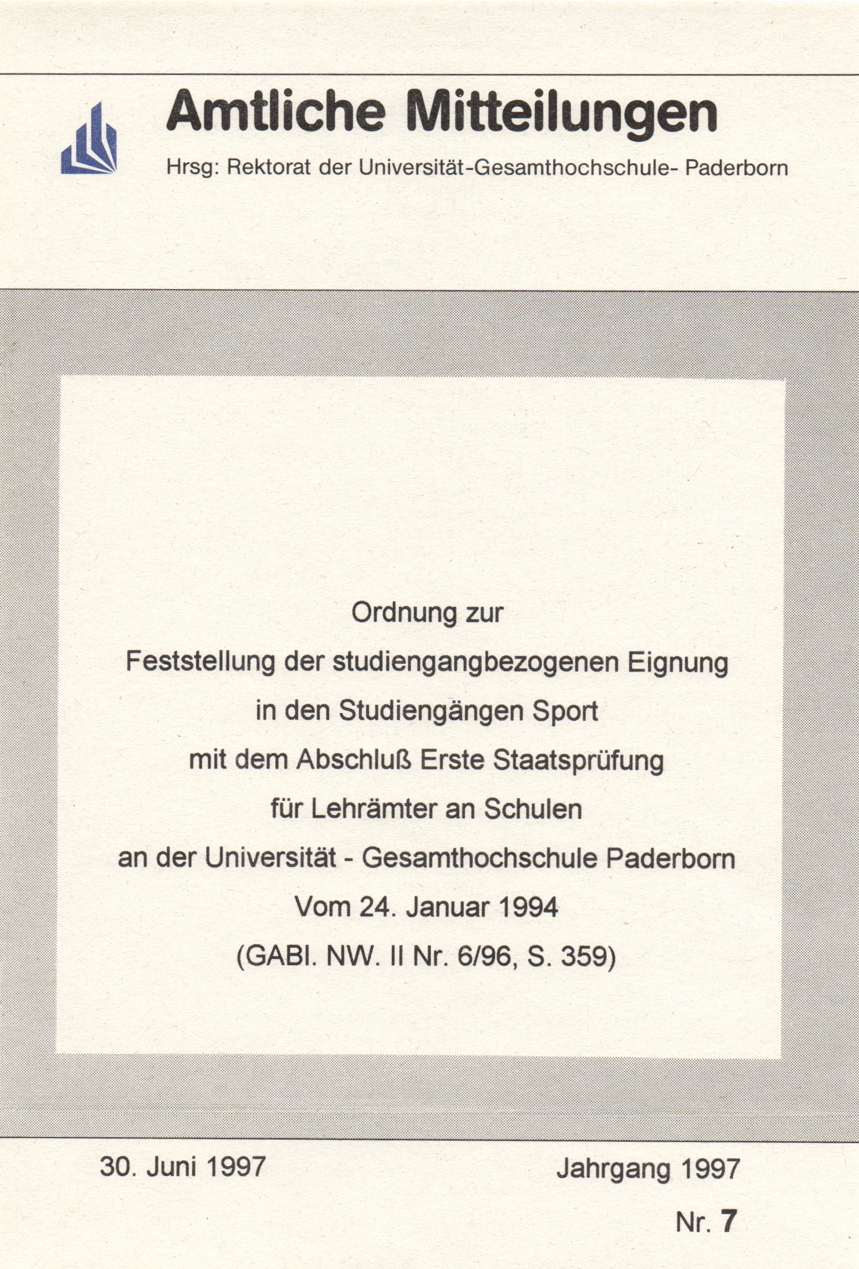 Ordnung zur Feststellung der studiengangbezogenen Eignung in den Studiengängen Sport mit dem Abschluß Erste Staatsprüfung für Lehrämter an Schulen an der Universität - Gesamthochschule Paderborn : vom 24. Januar 1994