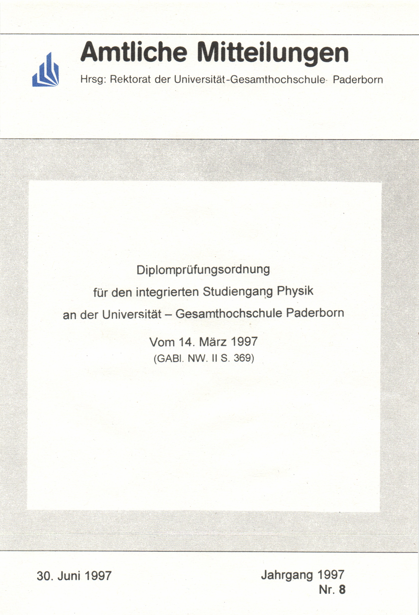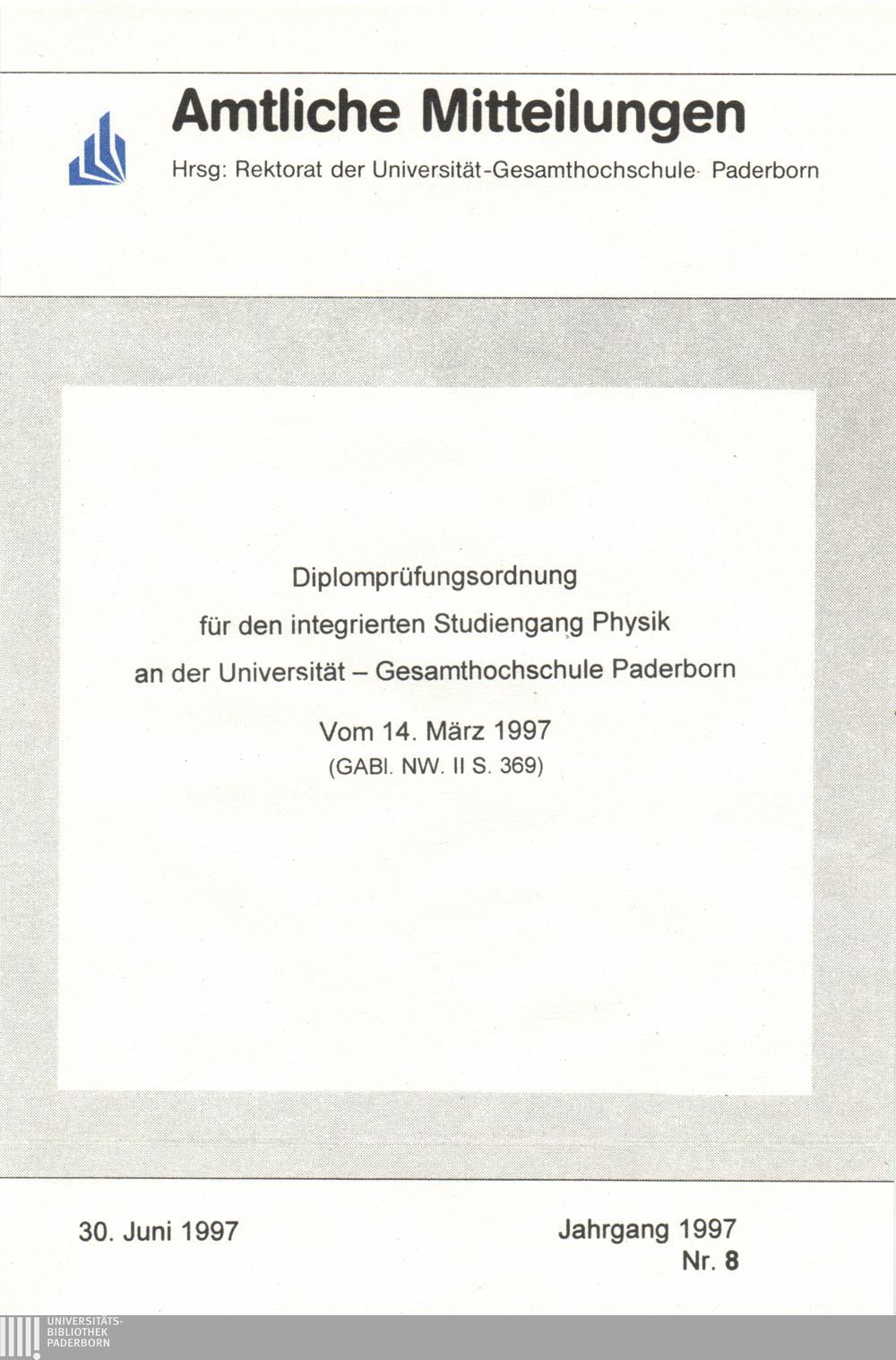 Diplomprüfungsordnung für den integrierten Studiengang Physik an der Universität - GH Paderborn : vom 14. März 1997