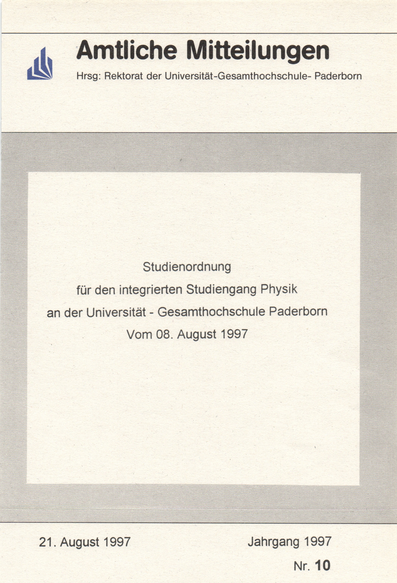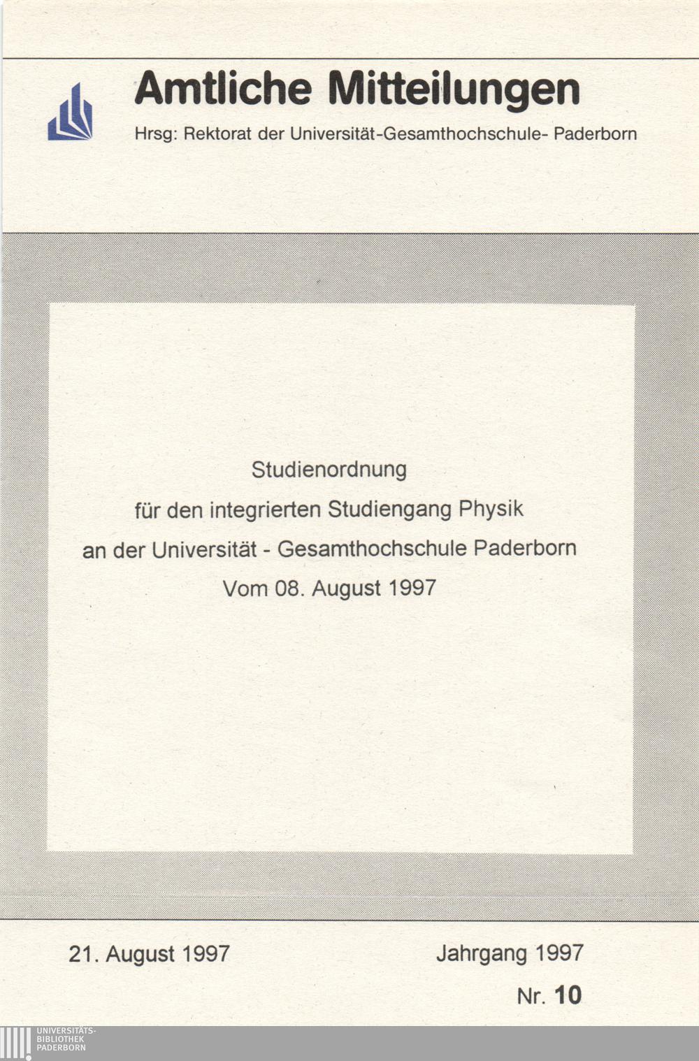 Studienordnung für den integrierten Studiengang Physik an der Universität - Gesamthochschule Paderborn : vom 08. August 1997