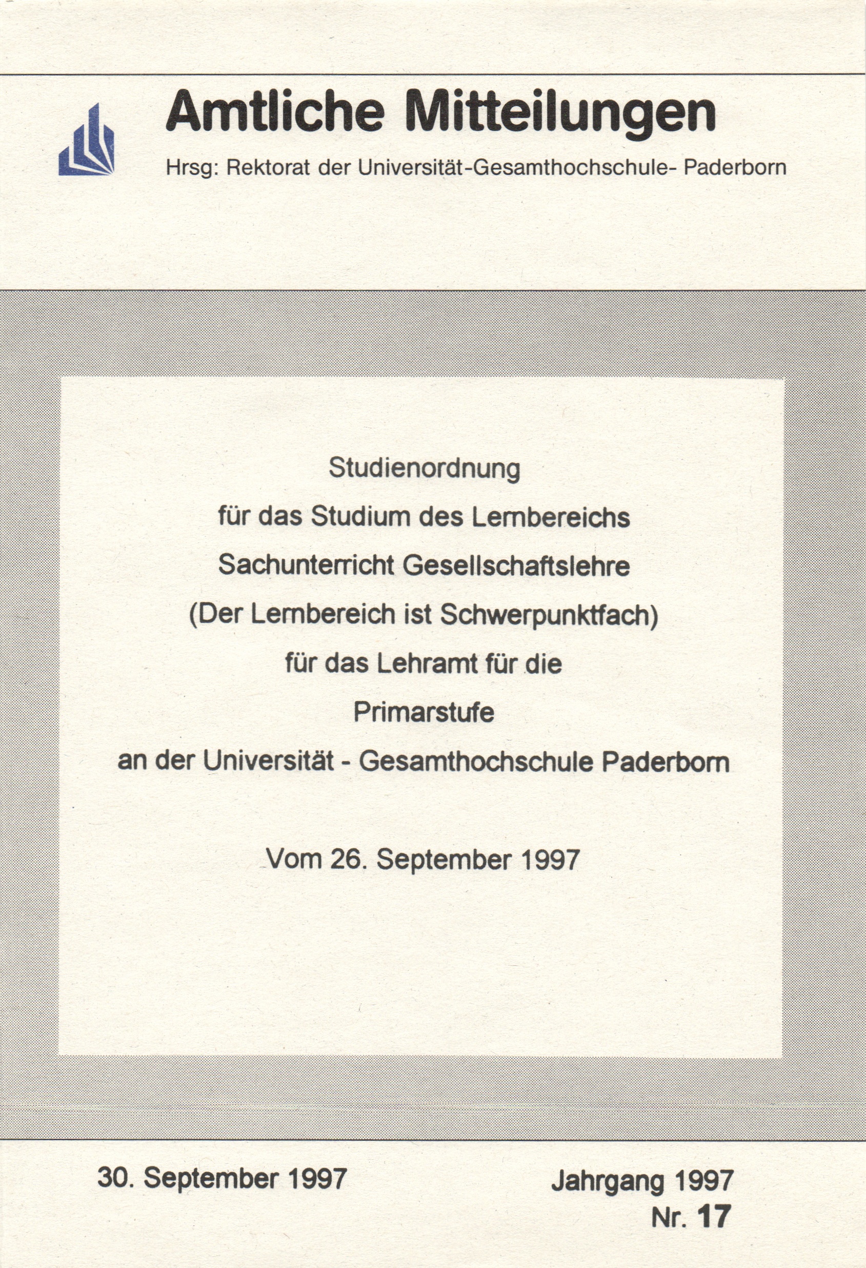 Studienordnung für das Studium des Lernbereichs Sachunterricht Gesellschaftslehre - der Lernbereich ist Schwerpunktfach - für das Lehramt für die Primarstufe an der Universität - Gesamthochschule Paderborn : vom 26. September 1997