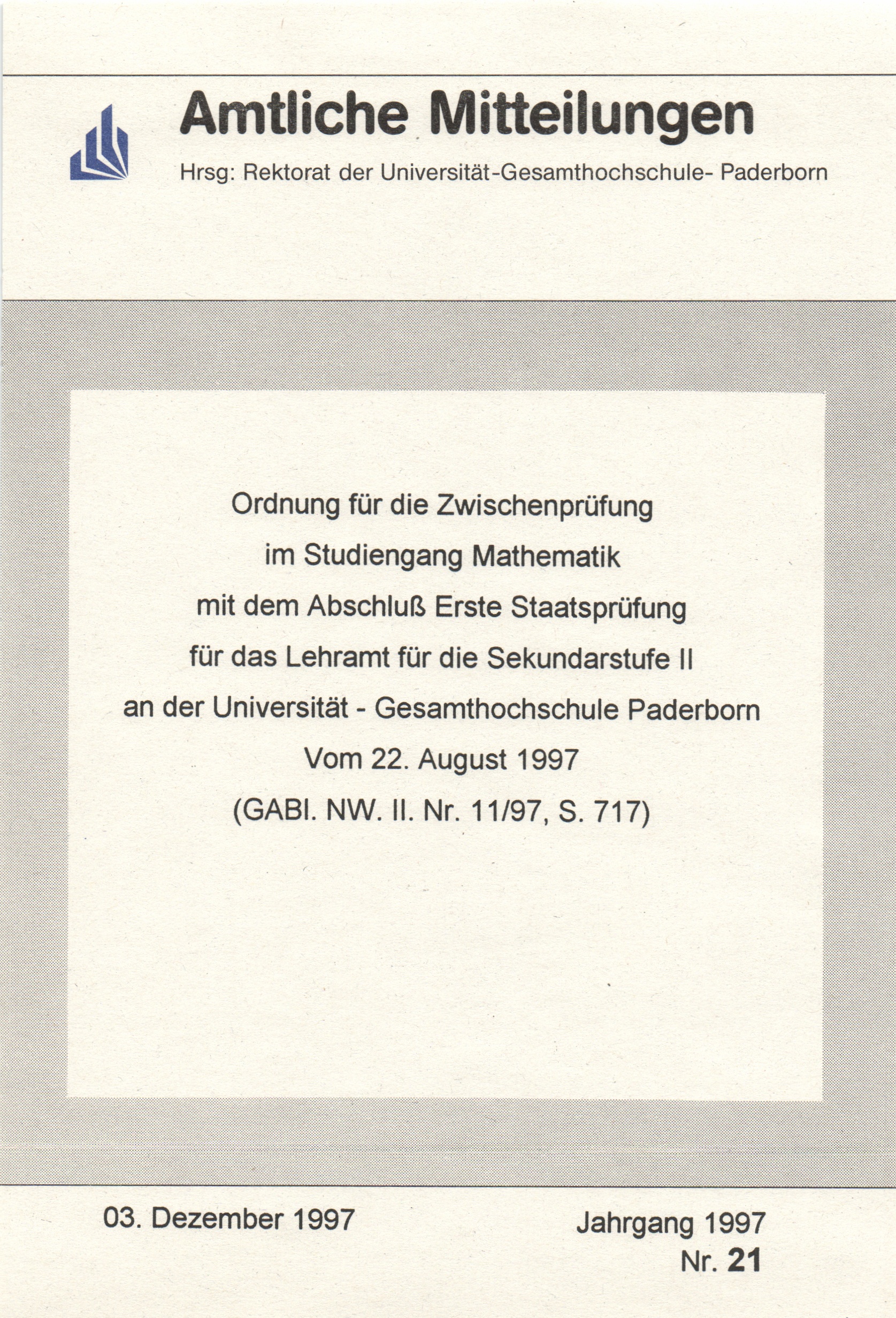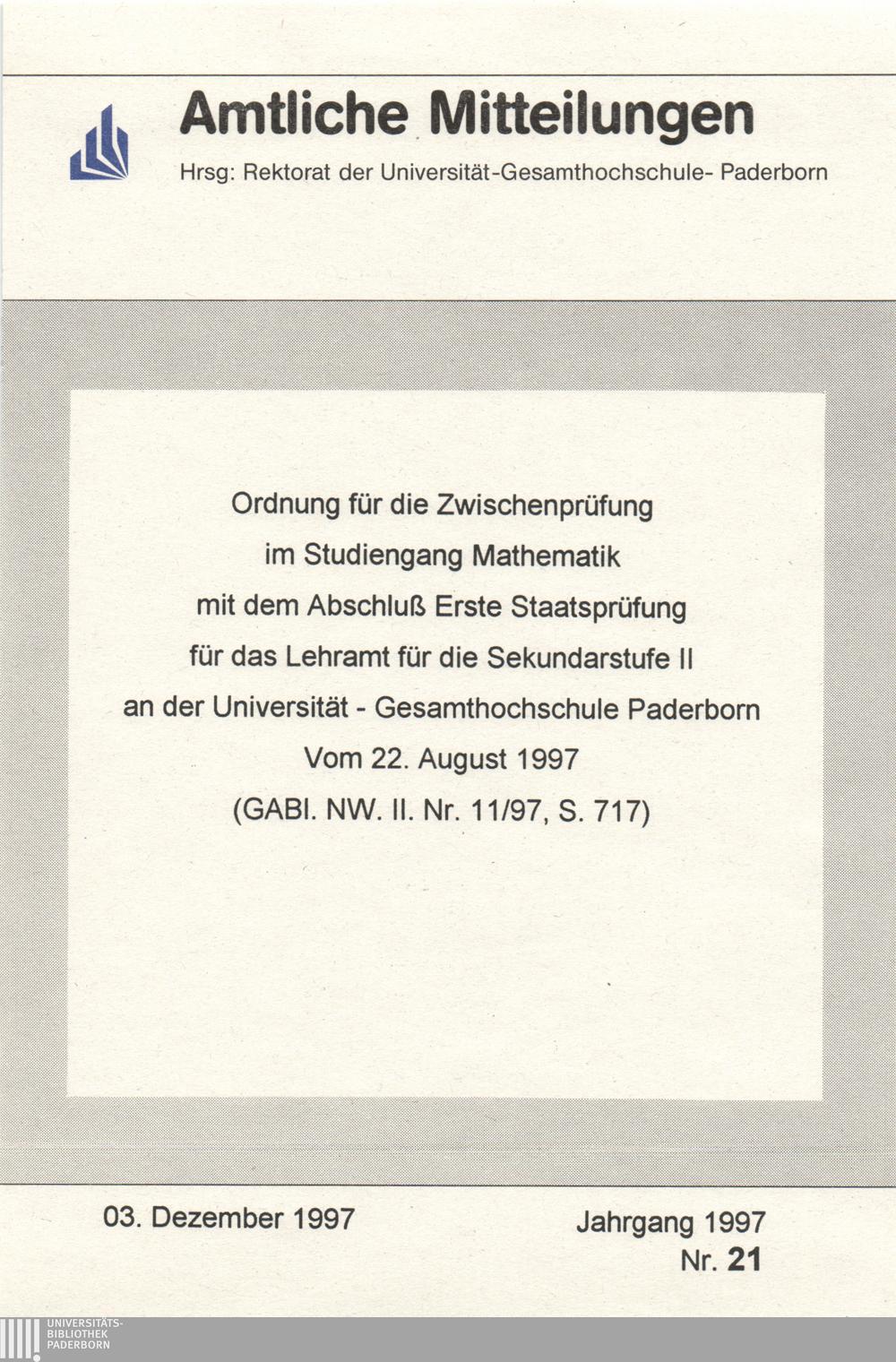 Ordnung für die Zwischenprüfung im Studiengang Mathematik mit dem Abschluß Erste Staatsprüfung für das Lehramt für die Sekundarstufe II an der Universität - Gesamthochschule Paderborn : vom 22. August 1997 ;