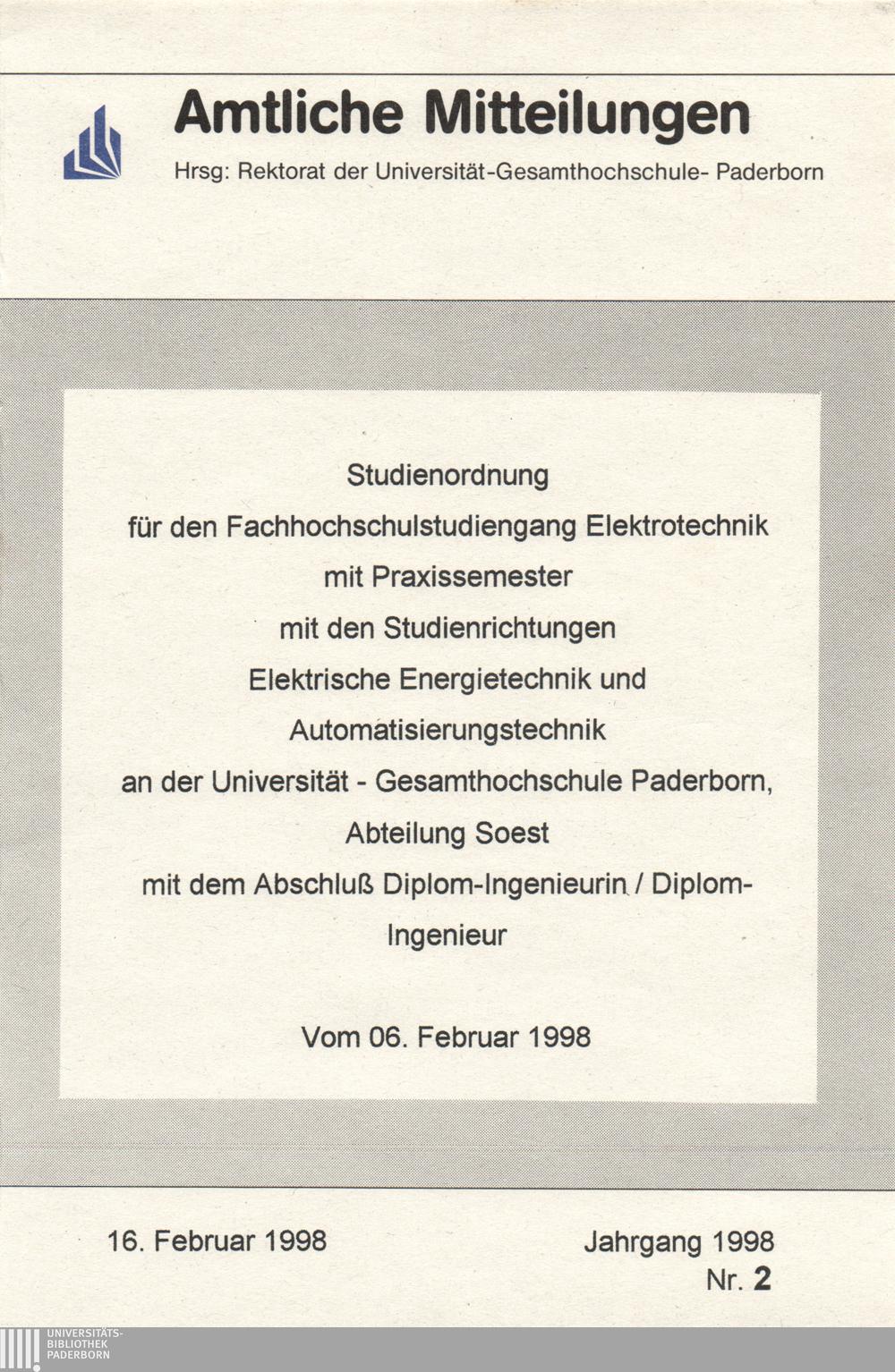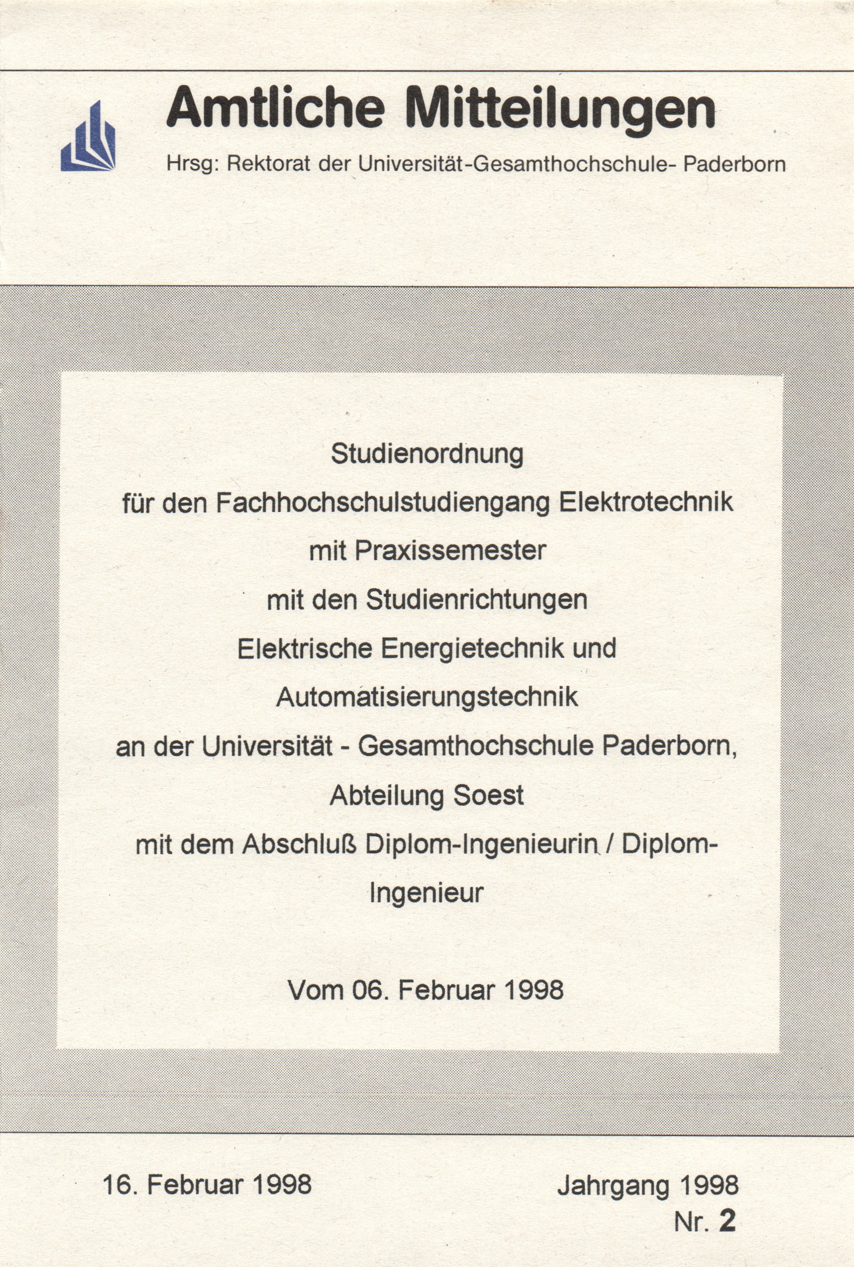 Studienordnung für den Fachhochschulstudiengang Elektrotechnik mit Praxissemester mit den Studienrichtungen Elektrische Energietechnik und Automatisierungstechnik an der Universität - Gesamthochschule Paderborn, Abteilung Soest, mit dem Abschluß Diplom-Ingenieurin / Diplom-Ingenieur : vom 06. Februar 1998