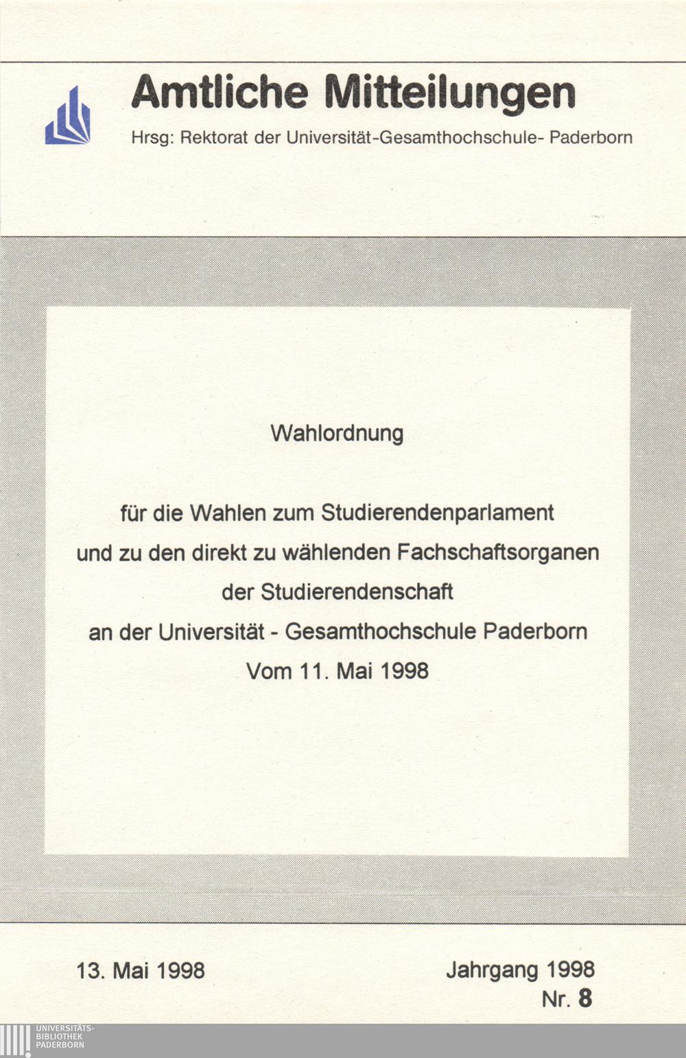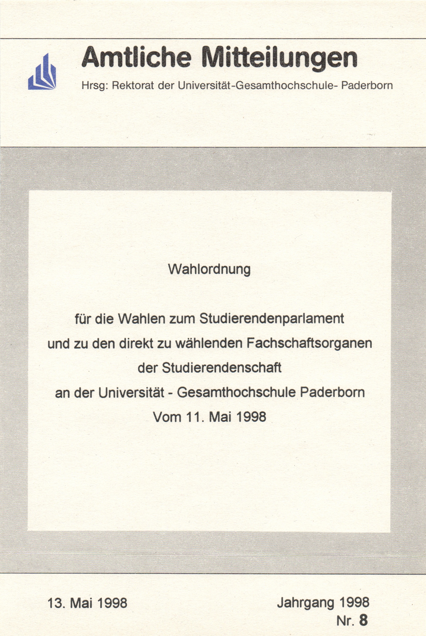 Wahlordnung für die Wahlen zum Studierendenparlament und zu den direkt zu wählenden Fachschaftsorganen der Studierendenschaft an der Universität - Gesamthochschule Paderborn : vom 11. Mai 1998