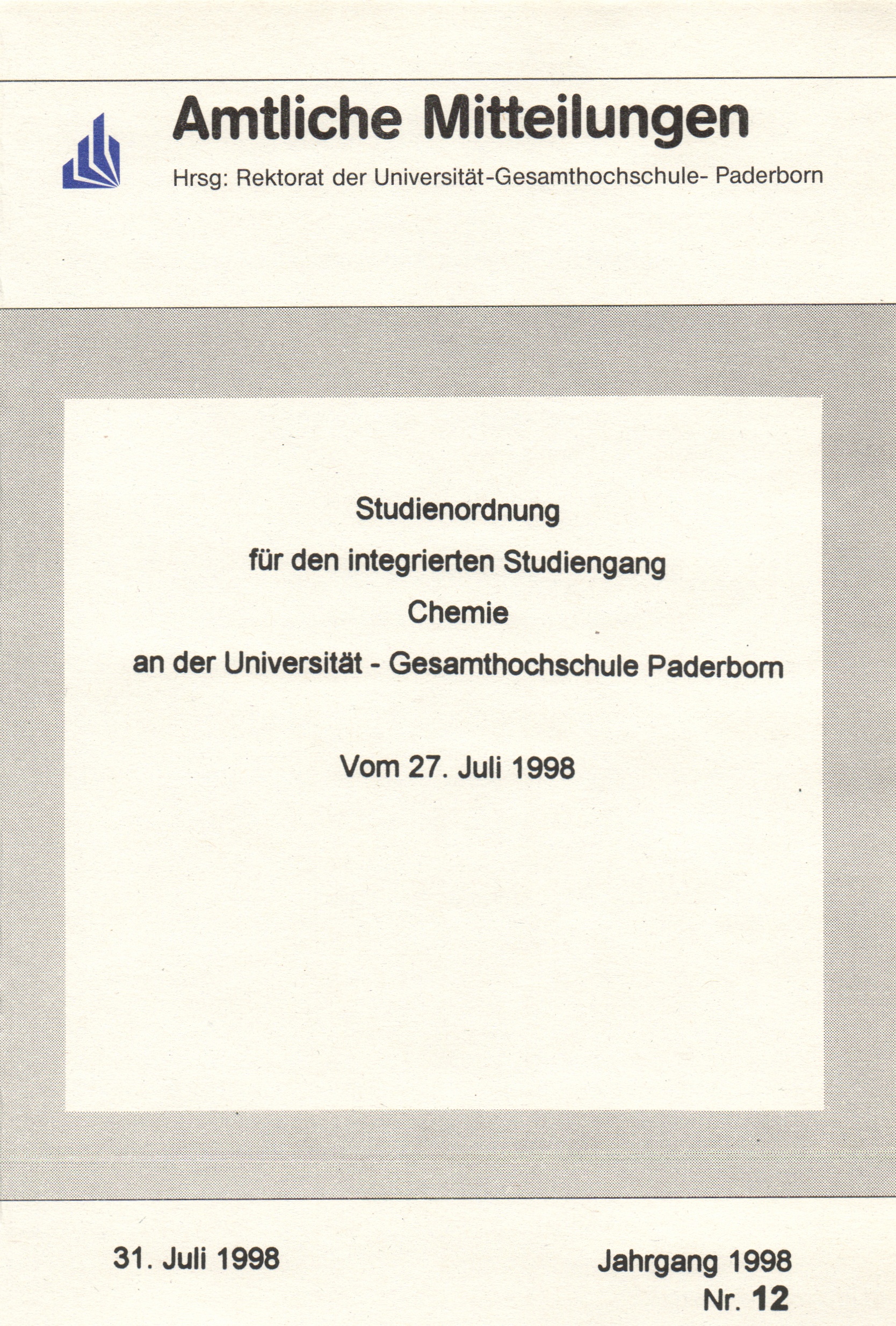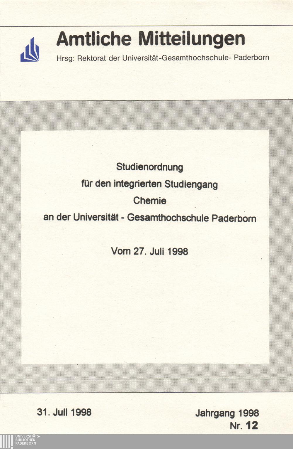 Studienordnung für den integrierten Studiengang Chemie an der Universität - Gesamthochschule Paderborn : vom 27. Juli 1998