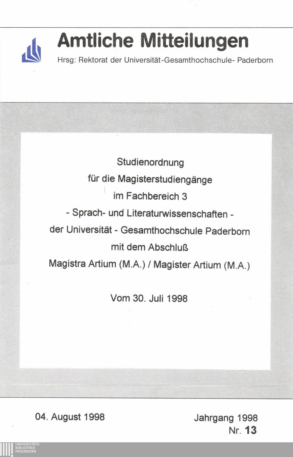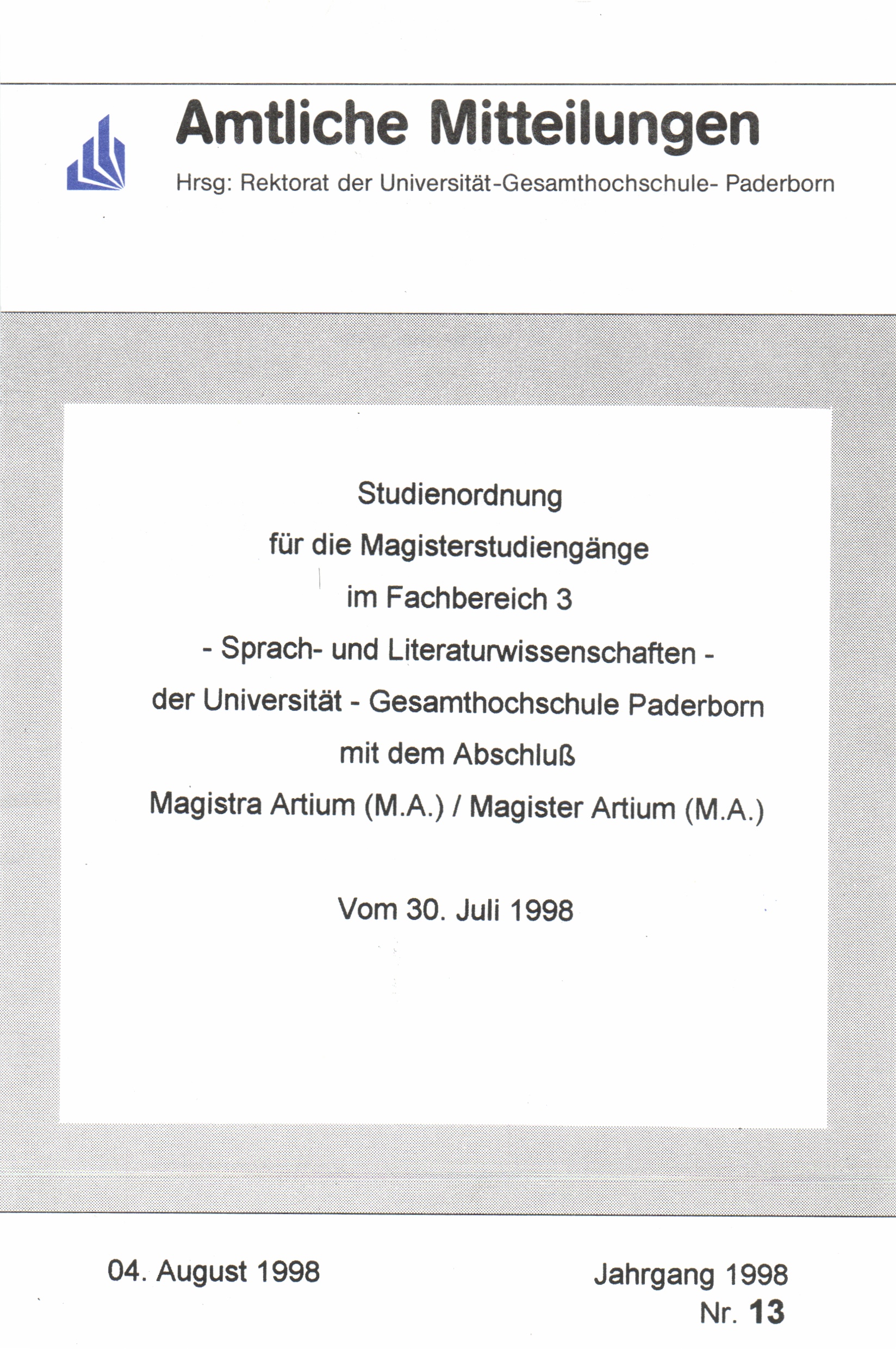 Studienordnung für die Magisterstudiengänge im Fachbereich 3 - Sprach- und Literaturwissenschaften - der Universität - Gesamthochschule Paderborn mit dem Abschluß Magistra Artium (M.A.), Magister Artium (M.A.) : vom 30. Juli 1998