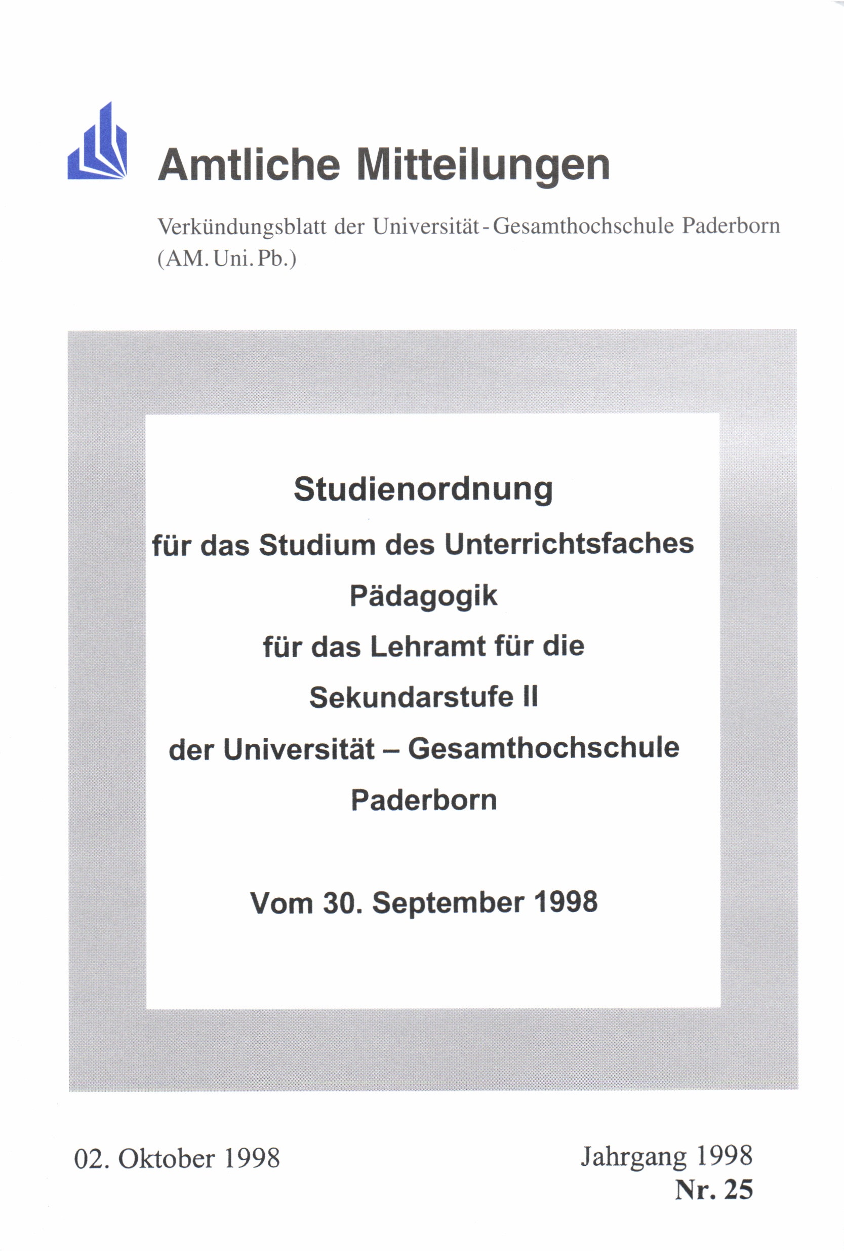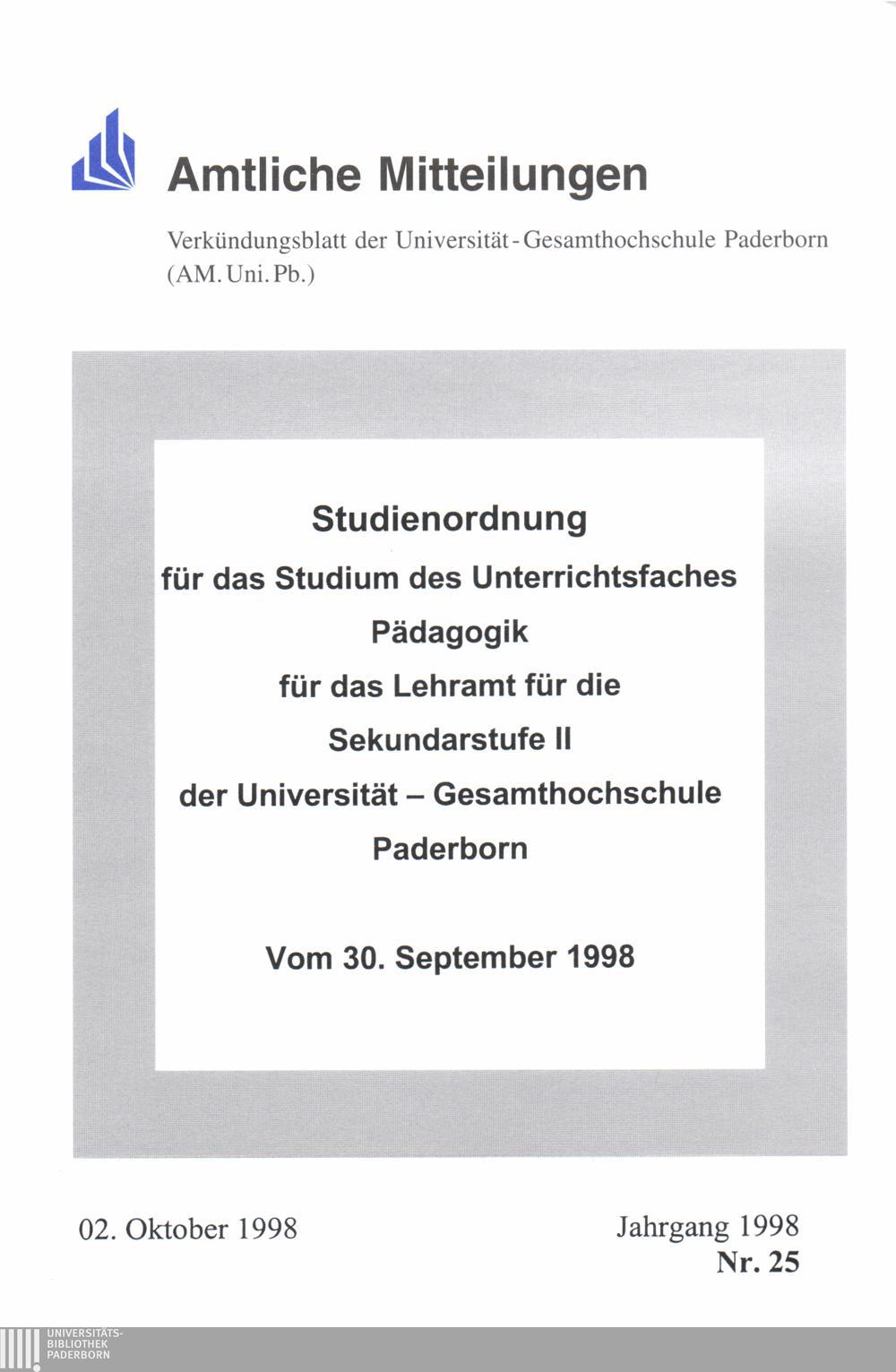 Studienordnung für das Studium des Unterrichtsfaches Pädagogik für das Lehramt für die Sekundarstufe II an der Universität - Gesamthochschule Paderborn : vom 30. September 1998