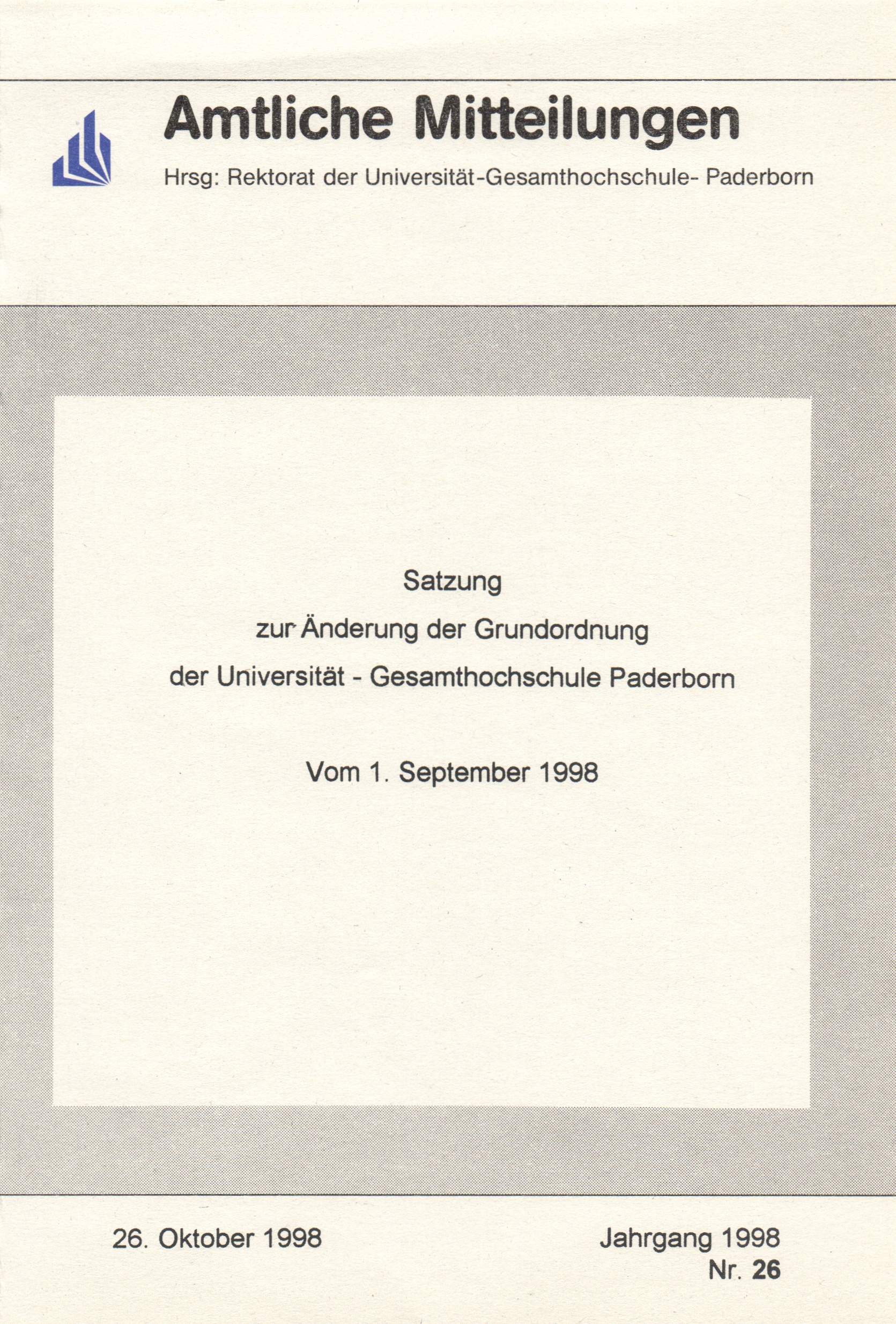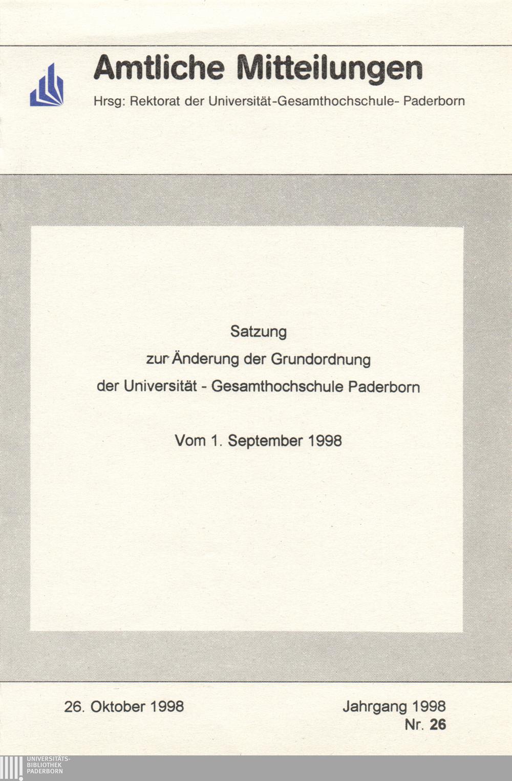 Satzung zur Änderung der Grundordnung der Universität - Gesamthochschule Paderborn : vom 1. September 1998
