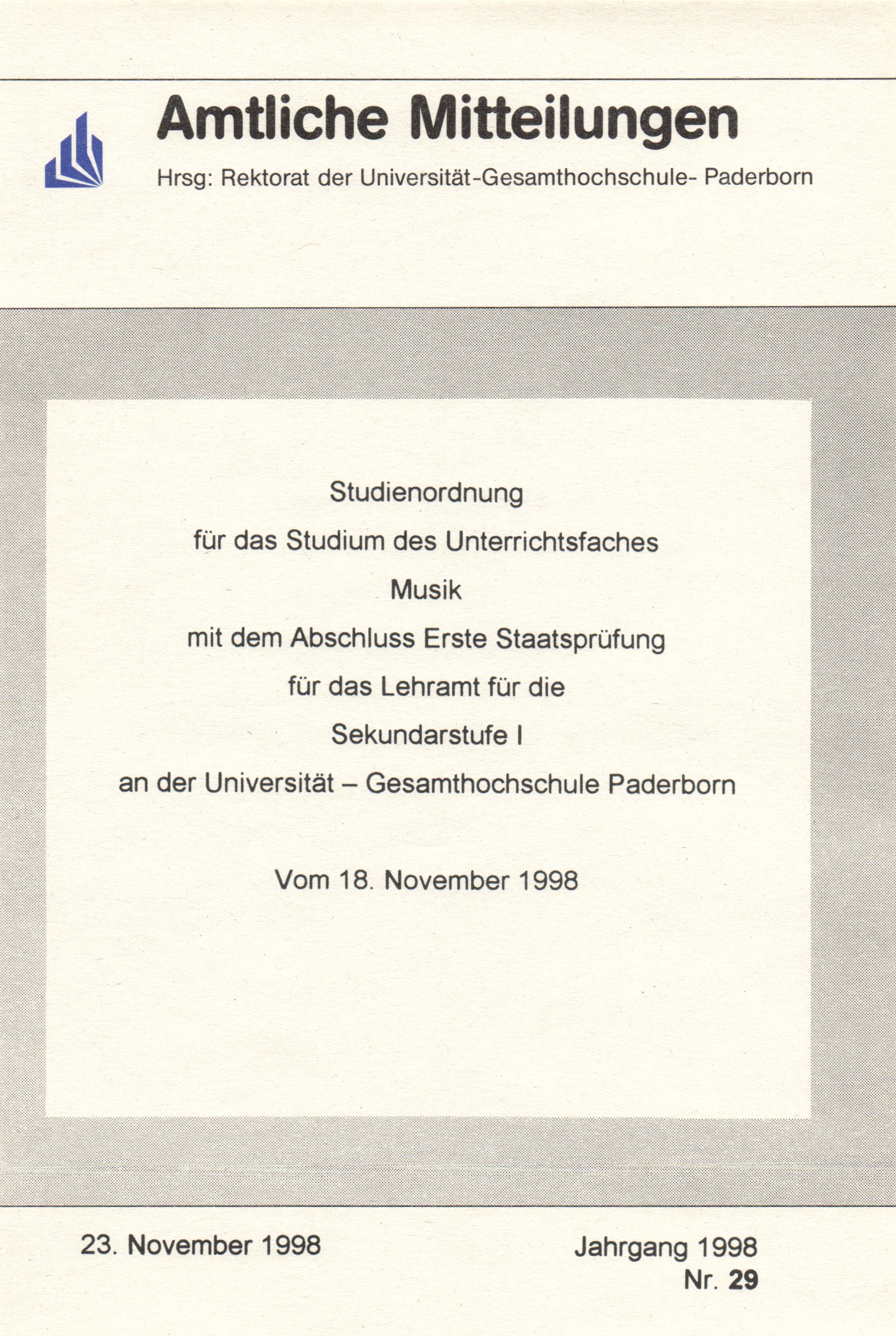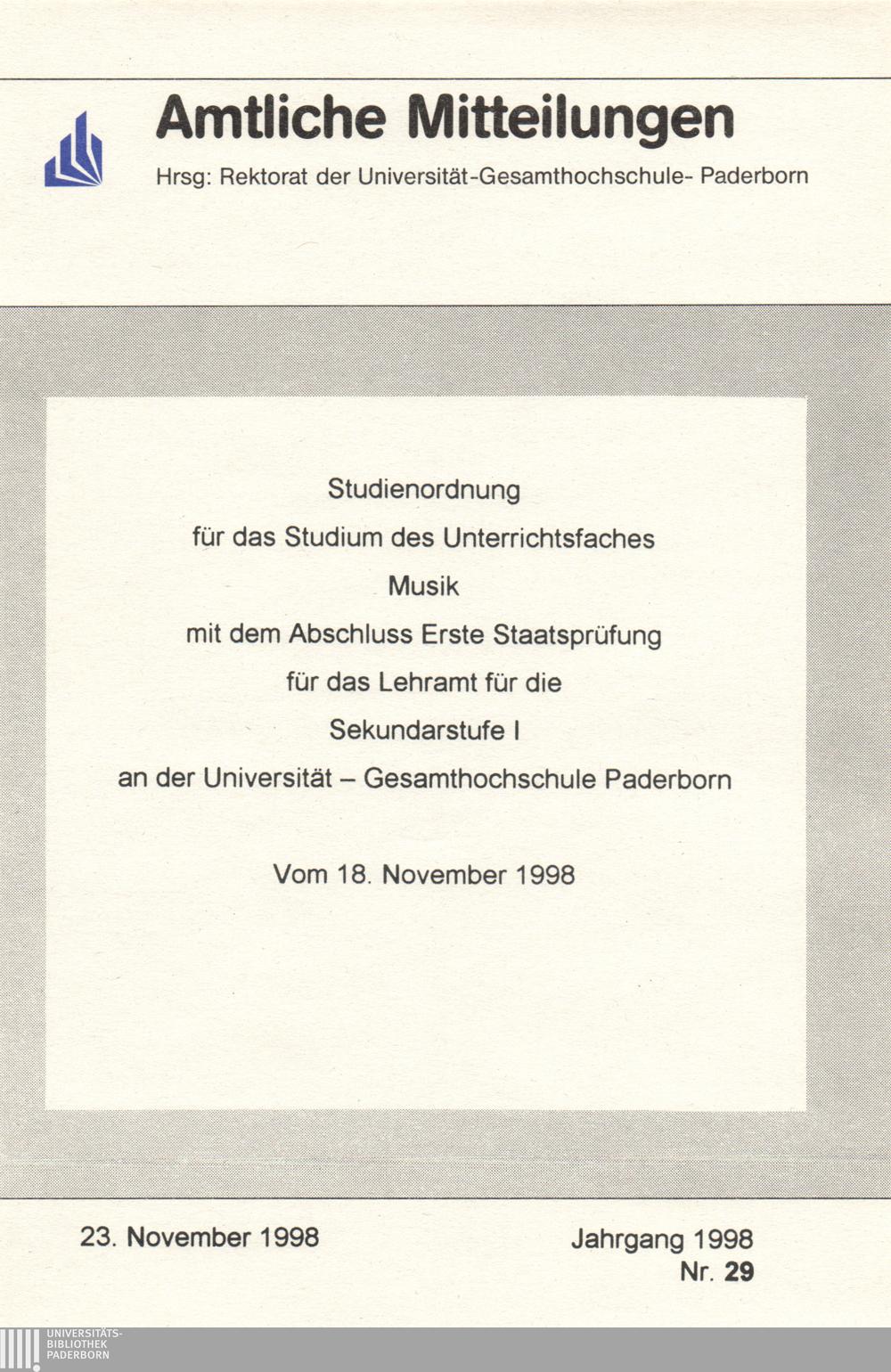 Studienordnung für das Studium des Unterrichtsfaches Musik mit dem Abschluss Erste Staatsprüfung für das Lehramt für die Sekundarstufe I an der Universität - Gesamthochschule Paderborn : vom 18. November 1998