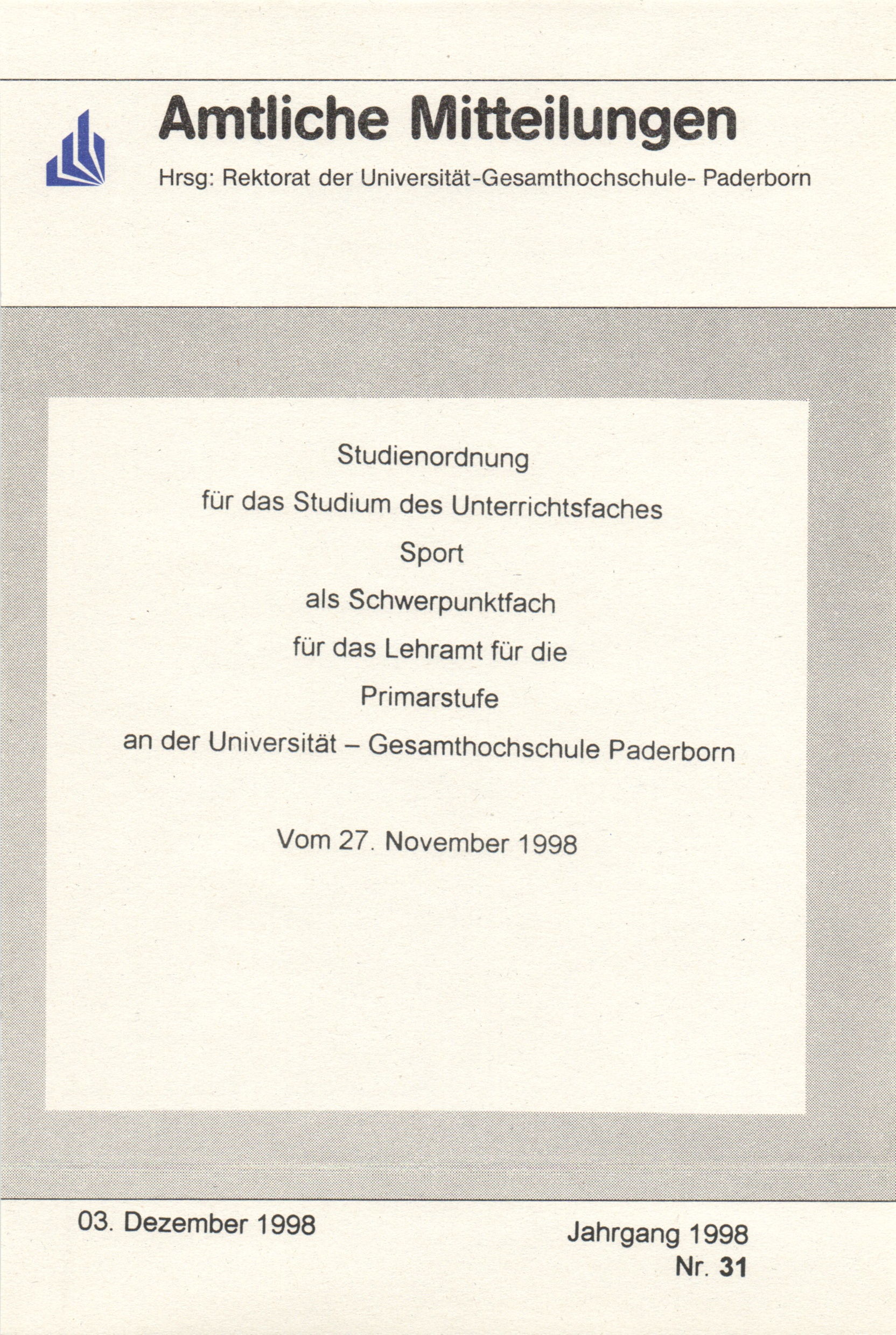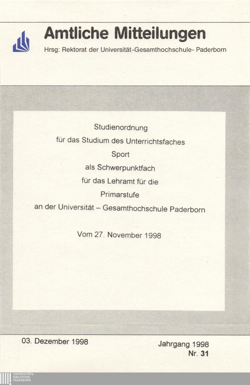 Studienordnung für das Studium des Unterrichtsfaches Sport als Schwerpunktfach für das Lehramt für die Primarstufe an der Universität - Gesamthochschule Paderborn : vom 27. November 1998