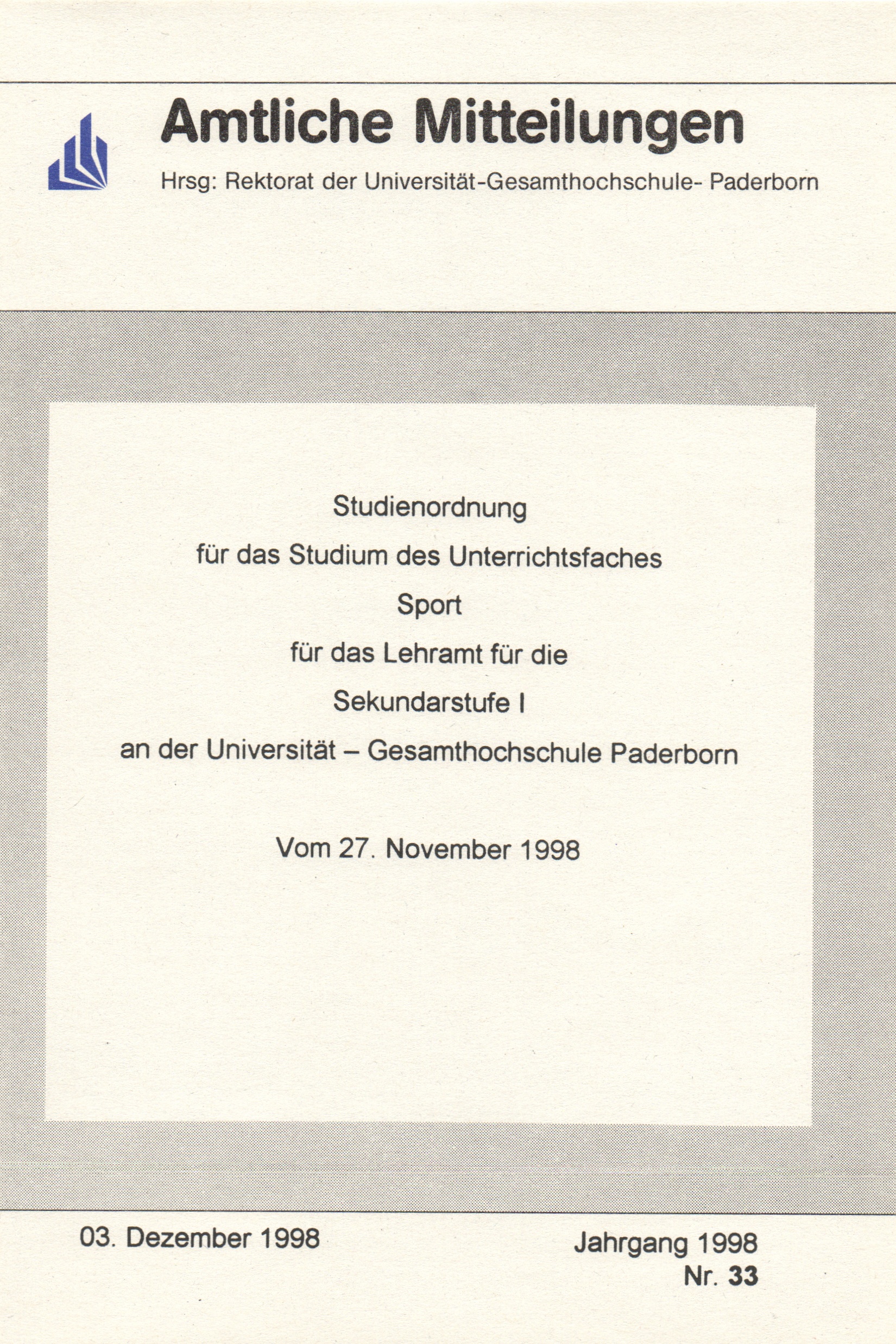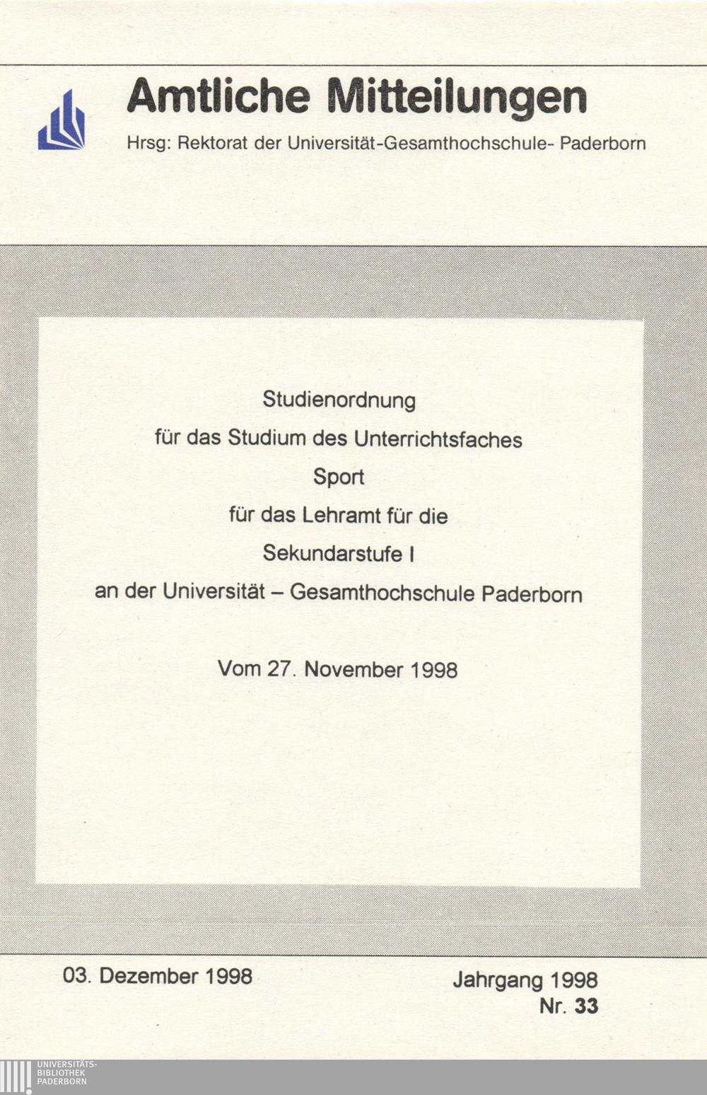 Studienordnung für das Studium des Unterrichtsfaches Sport für das Lehramt für die Sekundarstufe I an der Universität - Gesamthochschule Paderborn : vom 27. November 1998