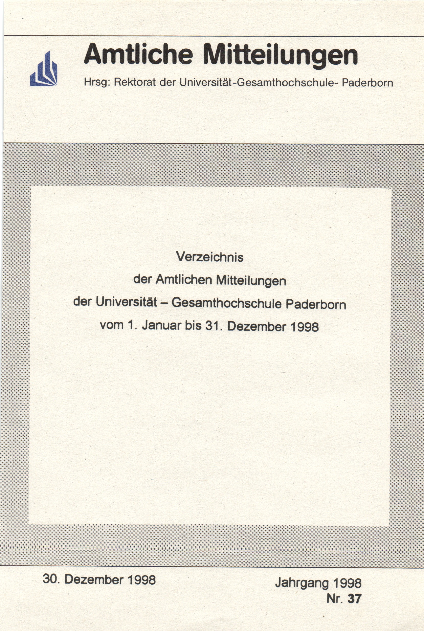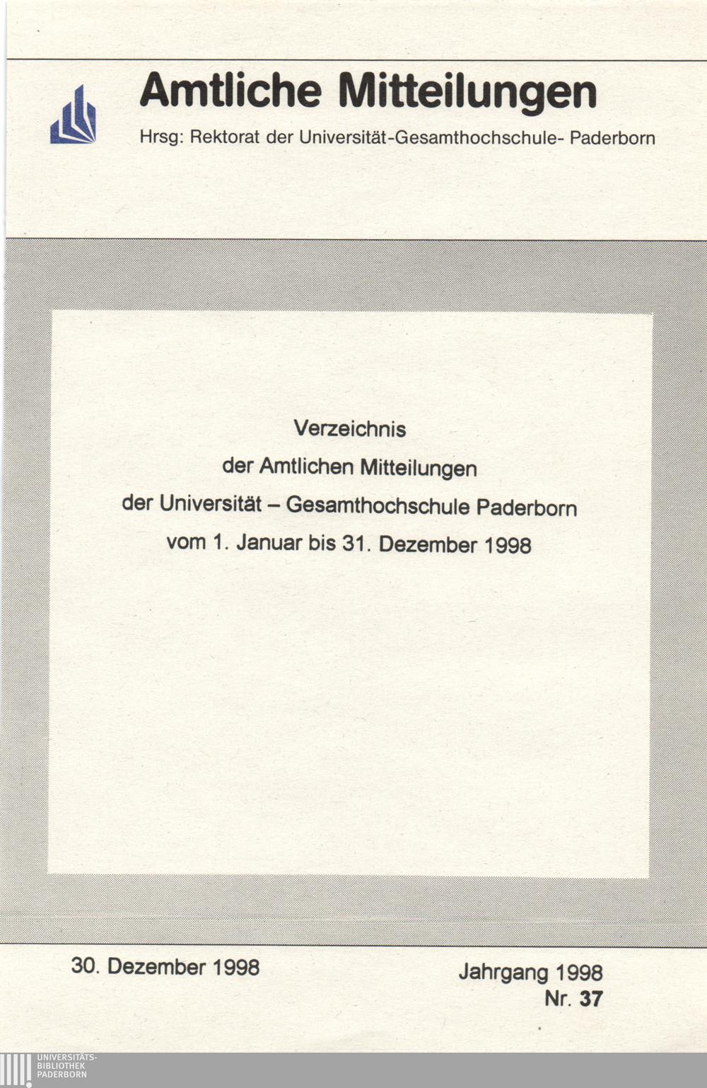 Verzeichnis der Amtlichen Mitteilungen der Universität - Gesamthochschule Paderborn : vom 1. Januar bis 31. Dezember 1998