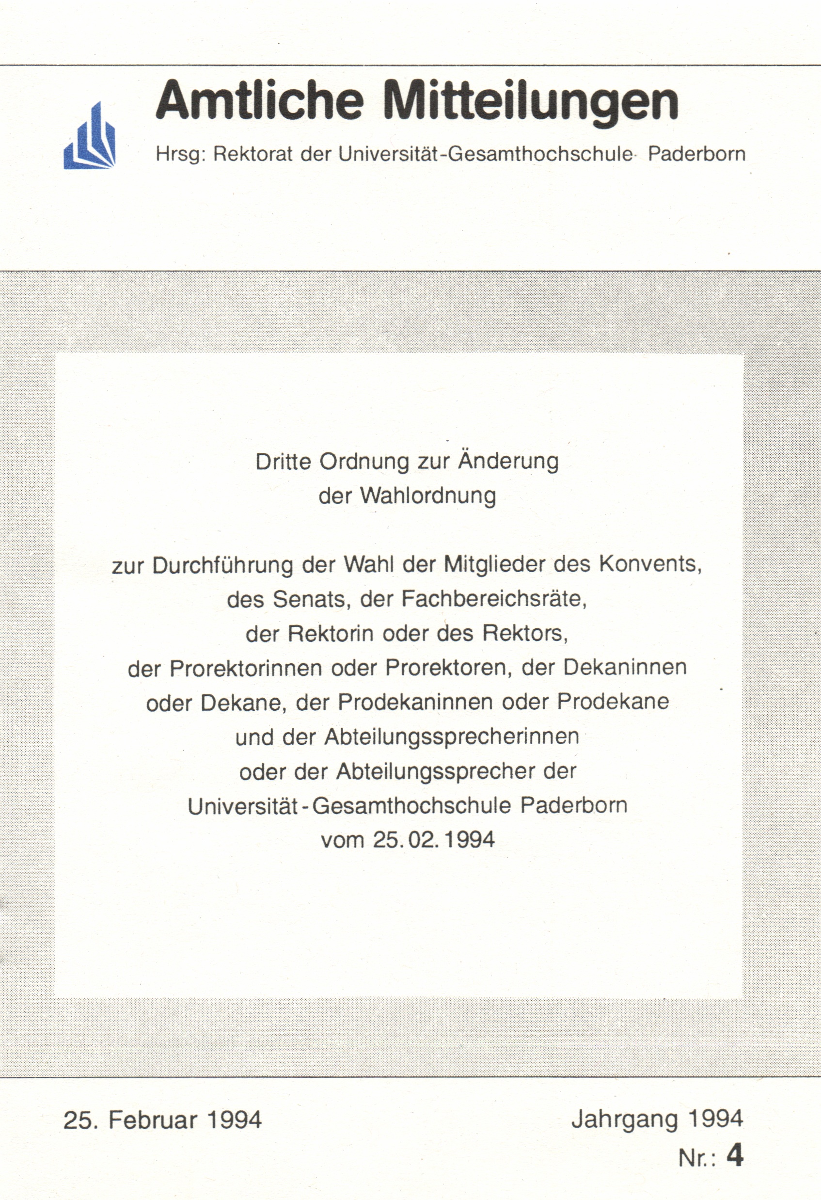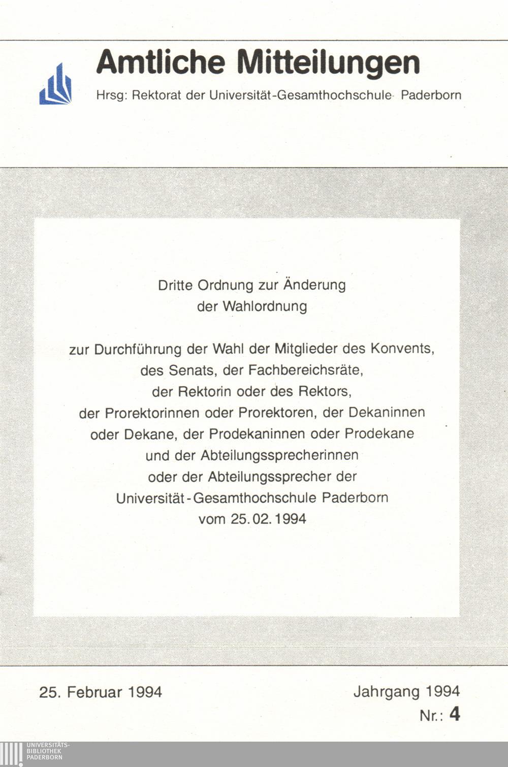 Dritte Ordnung zur Änderung der Wahlordnung zur Durchführung der Wahl der Mitglieder des Konvents, des Senats, der Fachbereichsräte, der Rektorin oder des Rektors, der Prorektorinnen oder Prorektoren, der Dekaninnen oder Dekane, der Prodekaninnen oder Prodekane und der Abteilungssprecherinnen oder der Abteilungssprecher der Universität-Gesamthochschule Paderborn : vom 25.02.1994