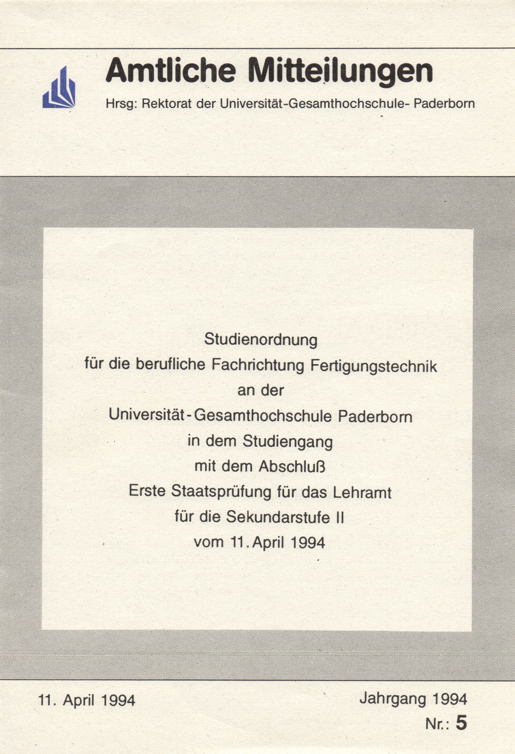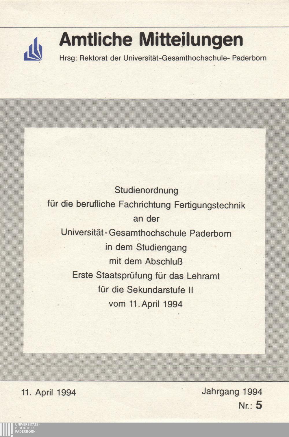 Studienordnung für die berufliche Fachrichtung Fertigungstechnik an der Universität - Gesamthochschule Paderborn in dem Studiengang mit dem Abschluß Erste Staatsprüfung für das Lehramt für die Sekundarstufe II : vom 11. April 1994